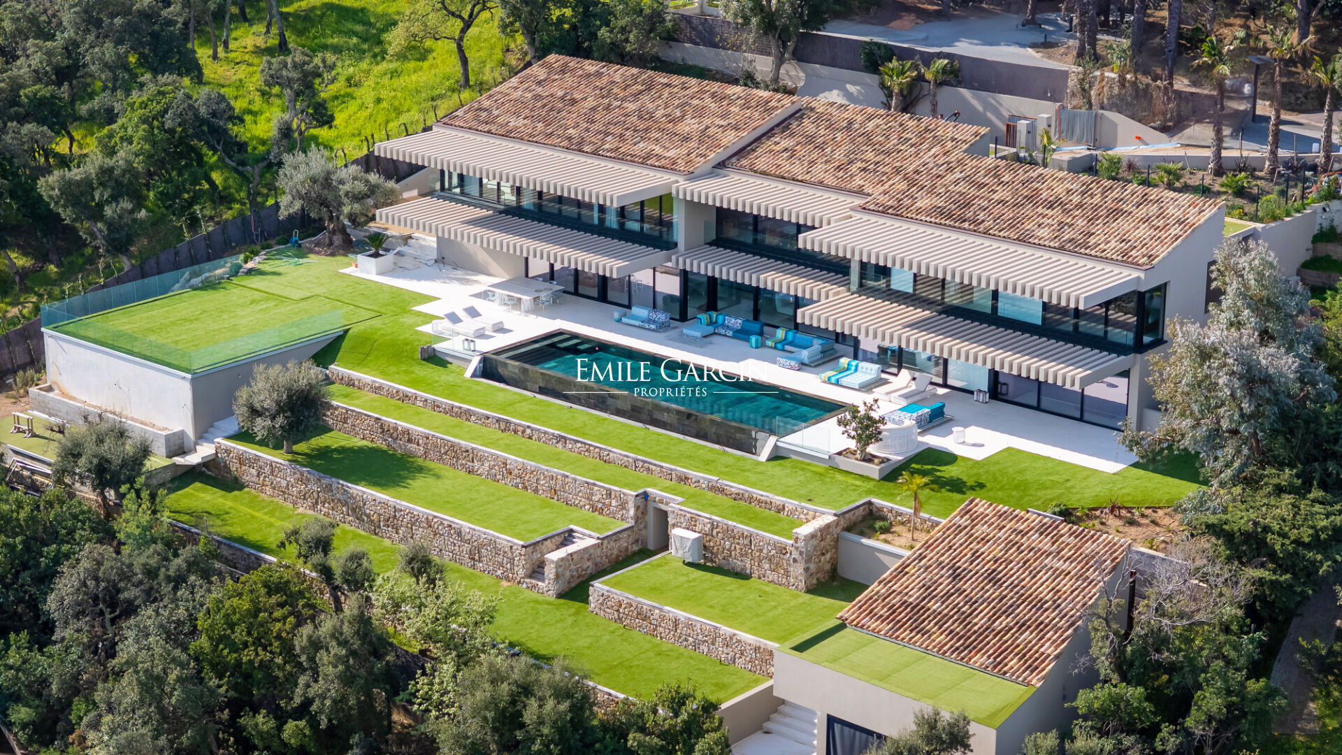 In a sought-after private estate, this new contemporary villa of approximately 500 sqm offers a unique living environment facing the bay of Saint-Tropez. Its modern design plays with light and volume, offering spaces open to the outdoors thanks to large bay windows and vast terraces. The house is composed as follows: On the main level: 1 master bedroom with large dressing room and bathroom. 3 other en-suite bedrooms on this level. Bar area opened by sliding bay windows, with a panoramic view of the sea. On the garden level: Several reception areas bathed in light with access to the terrace and shaded living areas. Equipped kitchen, with pantry and cold room. A 5th en-suite bedroom. An apartment with independent access including a bedroom and a kitchen completes this ensemble. Designed for well-being, the property has a gym, a sauna and a landscaped garden of 2,500 sqm. The heated infinity pool blends seamlessly into this exclusive setting, offering exceptional views at any time of day. Just minutes from the center of Saint-Tropez and the beaches, this villa combines elegance, modernity, and high-end amenities in a privileged setting.