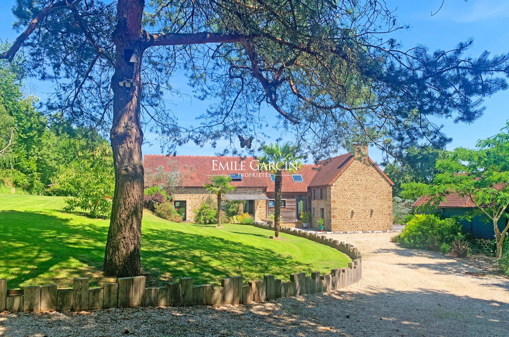 Located in the west of the Orne department, near the medieval town of Domfront: 35 km from Mayenne, 29 km from Bagnoles de l'Orne and 3.5 hours from Paris. This property comprises a main house (220 sq.m) and a guest house (80 sq.m) on 6 hectares of landscaped grounds (including woodland and a vegetable garden) with exceptional panoramic views. This unique house was fully renovated in 2011. Bathed in natural light and surrounded by nature, it comprises an entry hall, a fitted kitchen backing onto a large living room, a lounge with a fireplace backing onto a large terrace, and a bedroom with a separate shower room. A mezzanine floor has been equipped with a relaxation area. On the first floor, you will find a bedroom with access to the garden and a separate shower room. Set apart, there is a summer room overlooking the river. The property also features a guest house comprising a living room, a kitchen and three upstairs bedrooms. Additional facilities include a garage and other outbuildings. An exceptional and timeless property crossed by a river.