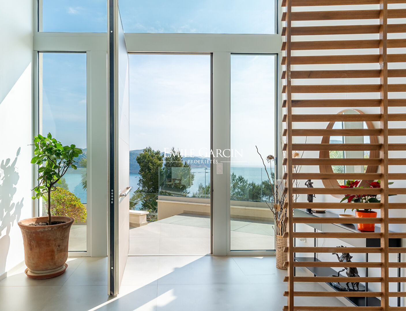 Située au sein d'un domaine sécurisé et prisé, cette villa contemporaine de 430 m2 offre une vue spectaculaire sur la rade Marseille et la Méditerranée depuis l'ensemble de ses pièces.