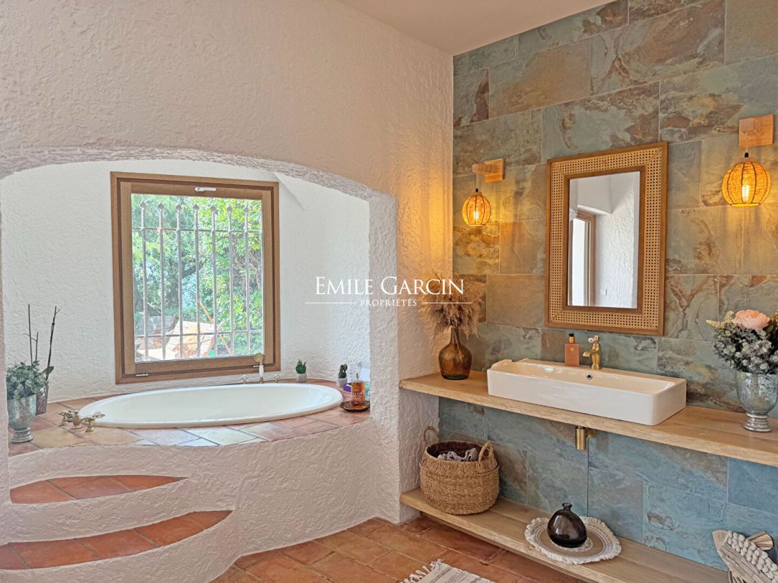 Located in a gated residential estate, this house presents the perfect blend of refinement, tranquility and nature. Sitting alongside its landscaped garden of approximately 1,700 sq.m, this house offers approximately 190 sq.m of living area in unspoiled surroundings with breathtaking views. Silence reigns supreme, creating a unique living environment secluded away from prying eyes and disturbances. With its cosy, chic atmosphere, the property stands out as much for its authenticity as for its understated elegance. The layout has been designed to guarantee comfort and harmony. On the garden level, the living space is arranged around a spacious living room and a fully equipped kitchen, both of which back onto the outdoors and pool area. There is also a first bedroom and bathroom on this level. Upstairs, you will find three additional bedrooms and a home office. Each bedroom has its own bathroom, making them perfectly suited to family life or hosting guests. Meanwhile, each outdoor space has been designed as a breath of fresh air: sunny terraces, shady corners, the relaxation area around the pool? It all serves as an invitation to contemplation or socialising. Located between the seafront and the hills, this property will suit all those looking for a residence of character whose luxury is expressed in its tranquility, light and elegance.