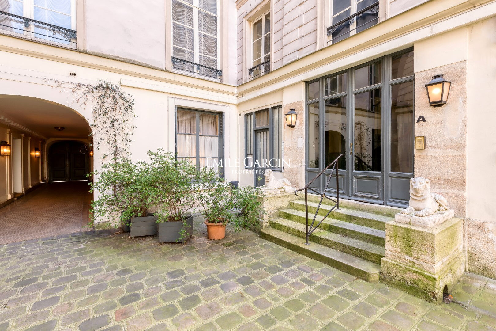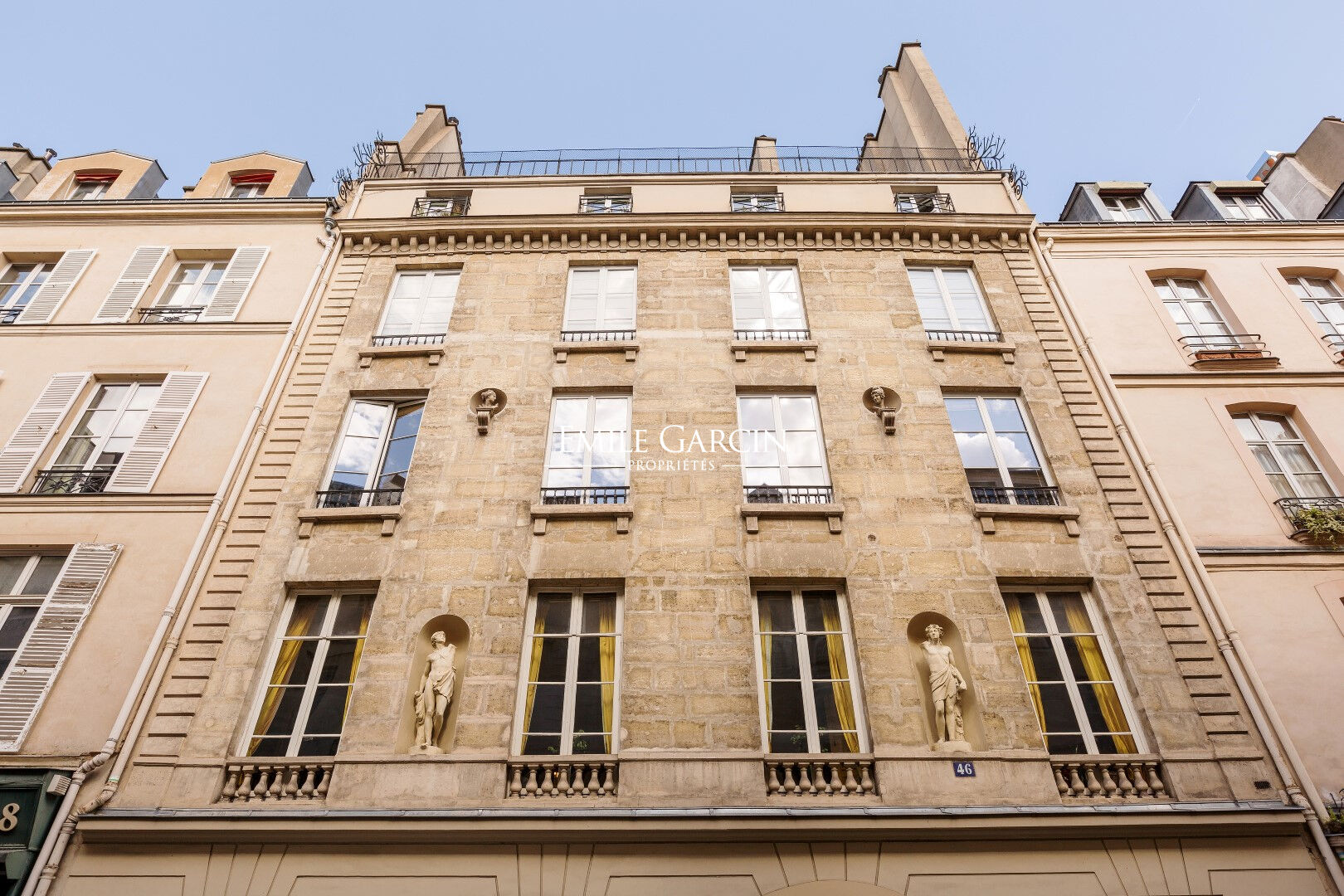 Saint Germain des Près - Dans un magnifique immeuble à la façade néoclassique ornée de statues classiques, au 2ème étage avec ascenseur, cet appartement de 206,03 m² loi Carrez et 213.86 m² au sol avec une hauteur sou plafond de 3,5 mètres, se compose d' une entrée, une double réception avec de hauts volumes, une suite principale avec dressing et salle de bains avec toilettes, une deuxième chambre avec salle d'eau et toilettes, un bureau, au centre, une cuisine Boffi équipée. Charme de l'ancien parquet, cheminées, moulures. Une double cave complète ce bel ensemble. Gardien à demeure. Parfait pied à terre au coeur de Saint Germain des Prés. Rare. Condominiums of 64 units (No proceedings in progress).