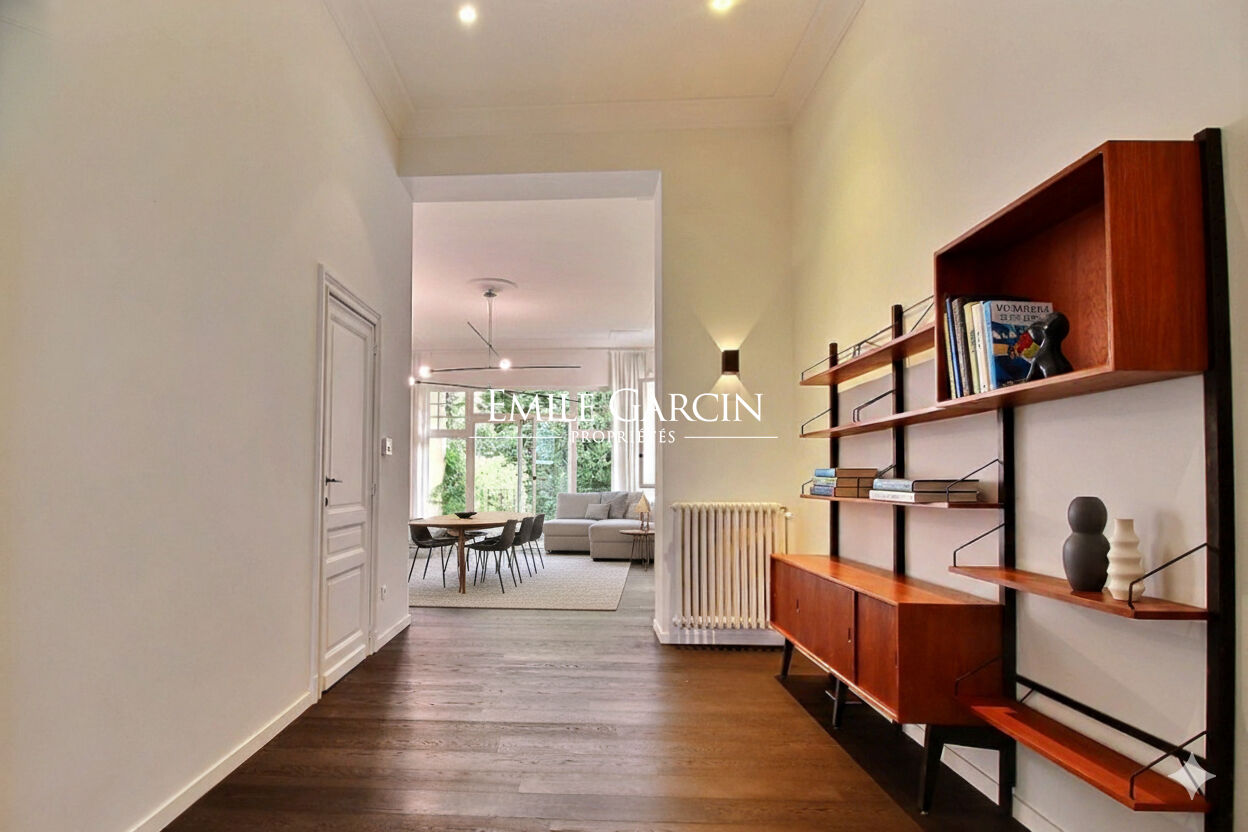 Idyllically located on the first floor of a character building from 1893 near Place Brugmann, this magnificent two-bedroom apartment presents 170 m² of living area that has been tastefully renovated using materials of the highest quality. An entry hall leads to a spacious living room which backs onto a west-facing rear terrace overlooking the gardens. The kitchen is independent and fully equipped, including a utility area. The apartment has two bedrooms, including a bedroom of around 31 m² at the front and one of 13 m² to the rear. It also offers a shower room, a dressing room and a guest WC. Fully renovated. Period charm (parquet flooring and ceilings of 3.80 metres). Facilities: reinforced front door, utility room, videophone, audio system. Energy performance: D. Condominium charges: 114 EUR/month.