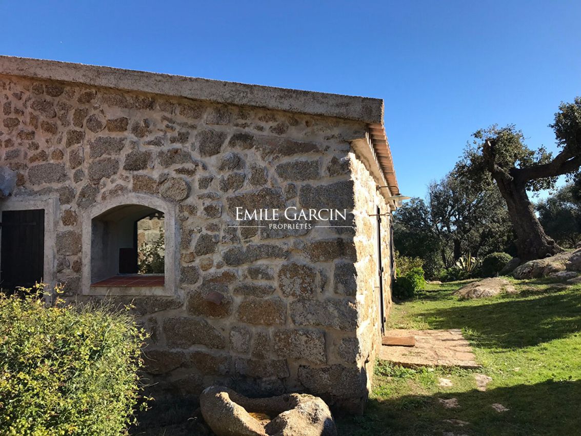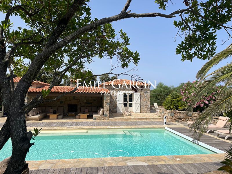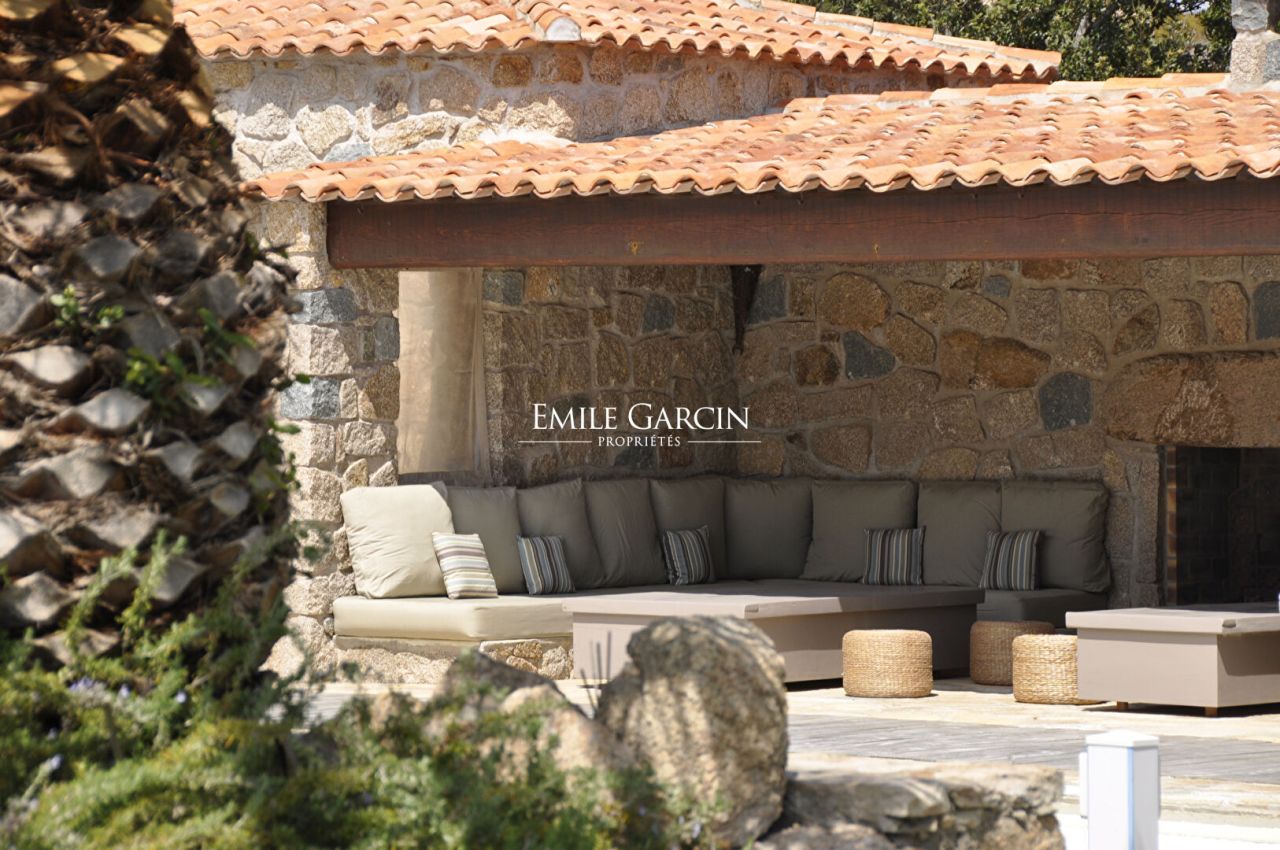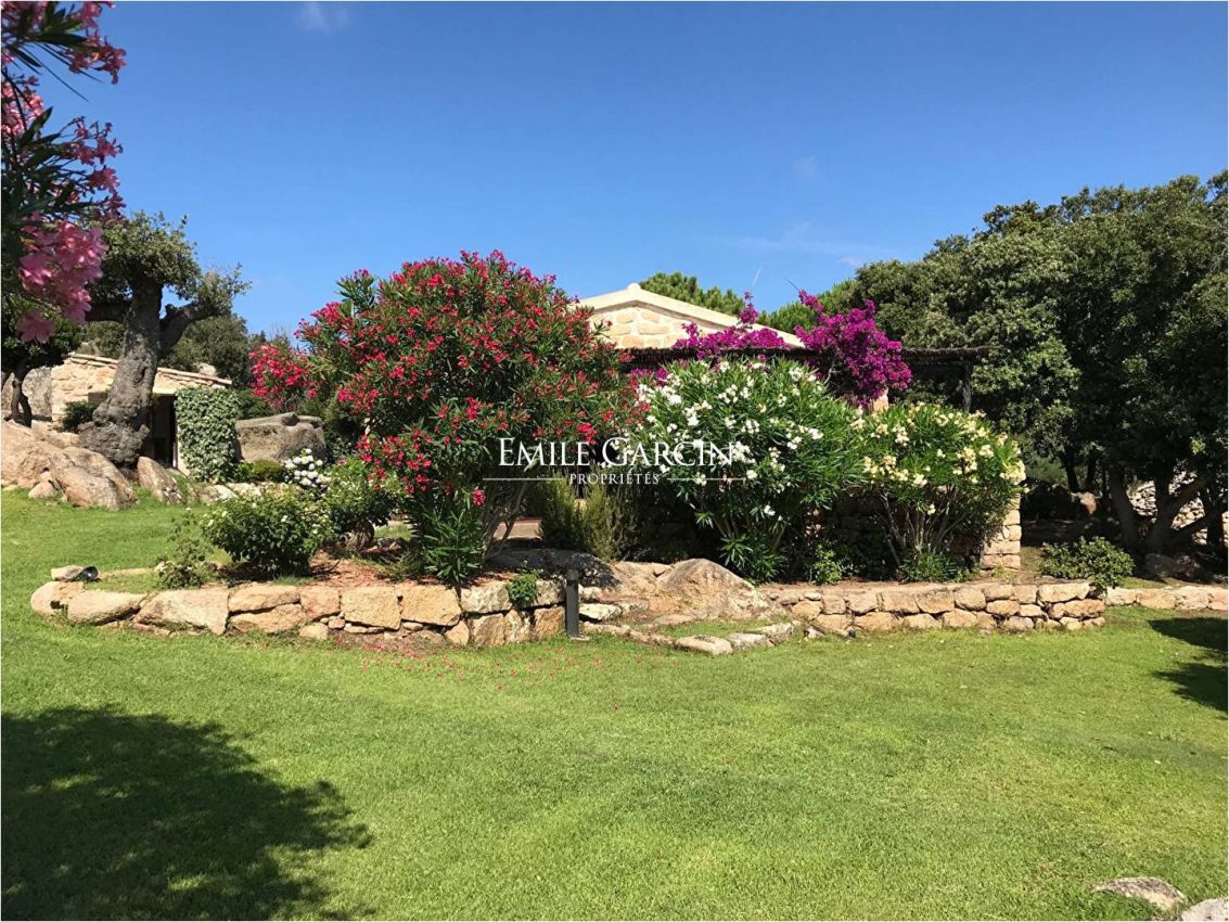 Converted sheepfold located on 2 hectares of leafy gardens. Exceptionally located 250 metres from the seafront, this true haven of peace presents authenticity, olive trees and maquis. 5 bedrooms, 5 bathrooms. Beautiful 2-hectare garden planted with olive trees, holm oaks and other Mediterranean vegetation. Heated swimming pool (12.5m x 5.5m secured by radar terminals. Handsome al fresco lounge fitted with large sofas and a fireplace near the swimming pool, an ideal place to enjoy the outdoors in every season. Several small wild coves accessible on foot, via a footpath crossing the maquis. Cleaning: 5 x 3 hours per week (included in the cost of your stay). Option to hire an additional chef. An ideal place to savour the authenticity and nature of Corsica among family and friends. Figari Airport: 30 mins. Bonifacio: 10 mins. Beach: 15 mins (by foot).