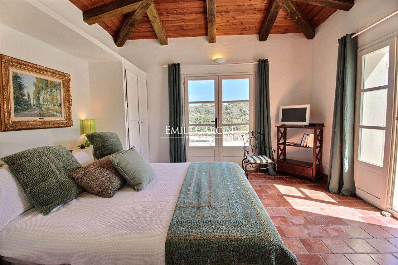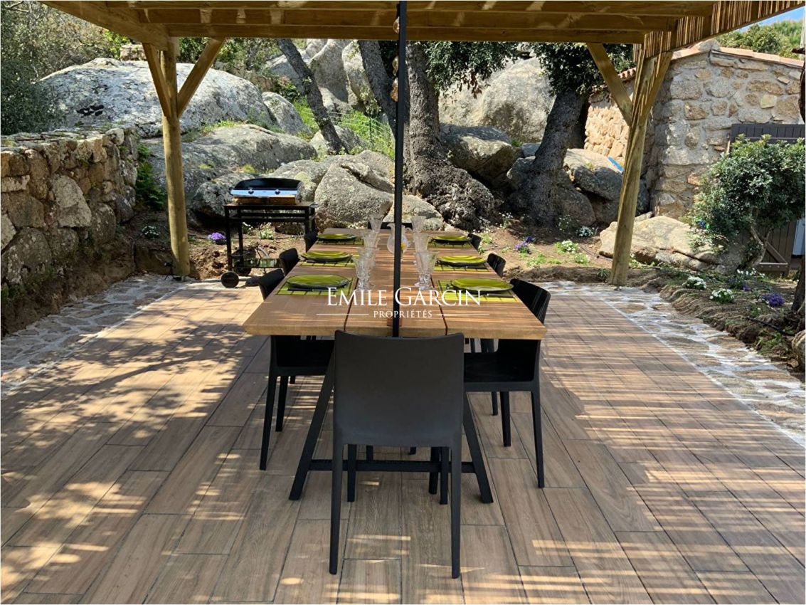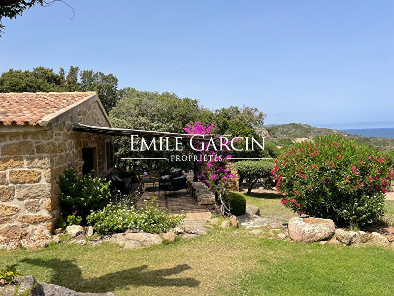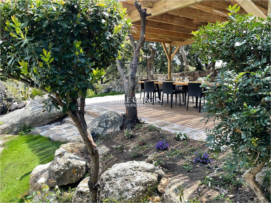 Converted sheepfold located on 2 hectares of leafy gardens. Exceptionally located 250 metres from the seafront, this true haven of peace presents authenticity, olive trees and maquis. 5 bedrooms, 5 bathrooms. Beautiful 2-hectare garden planted with olive trees, holm oaks and other Mediterranean vegetation. Heated swimming pool (12.5m x 5.5m secured by radar terminals. Handsome al fresco lounge fitted with large sofas and a fireplace near the swimming pool, an ideal place to enjoy the outdoors in every season. Several small wild coves accessible on foot, via a footpath crossing the maquis. Cleaning: 5 x 3 hours per week (included in the cost of your stay). Option to hire an additional chef. An ideal place to savour the authenticity and nature of Corsica among family and friends. Figari Airport: 30 mins. Bonifacio: 10 mins. Beach: 15 mins (by foot).