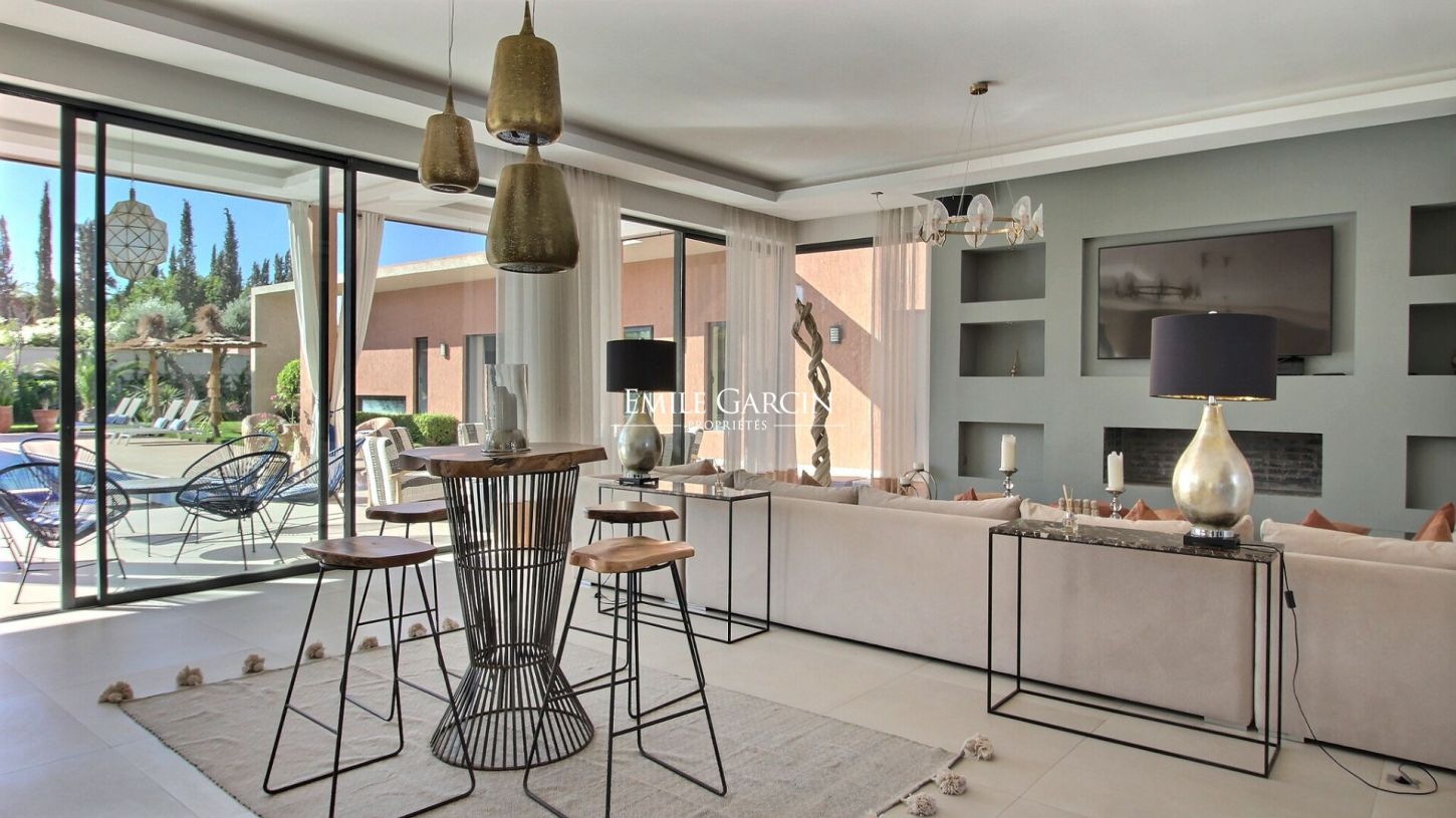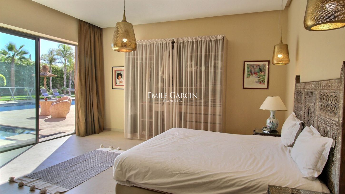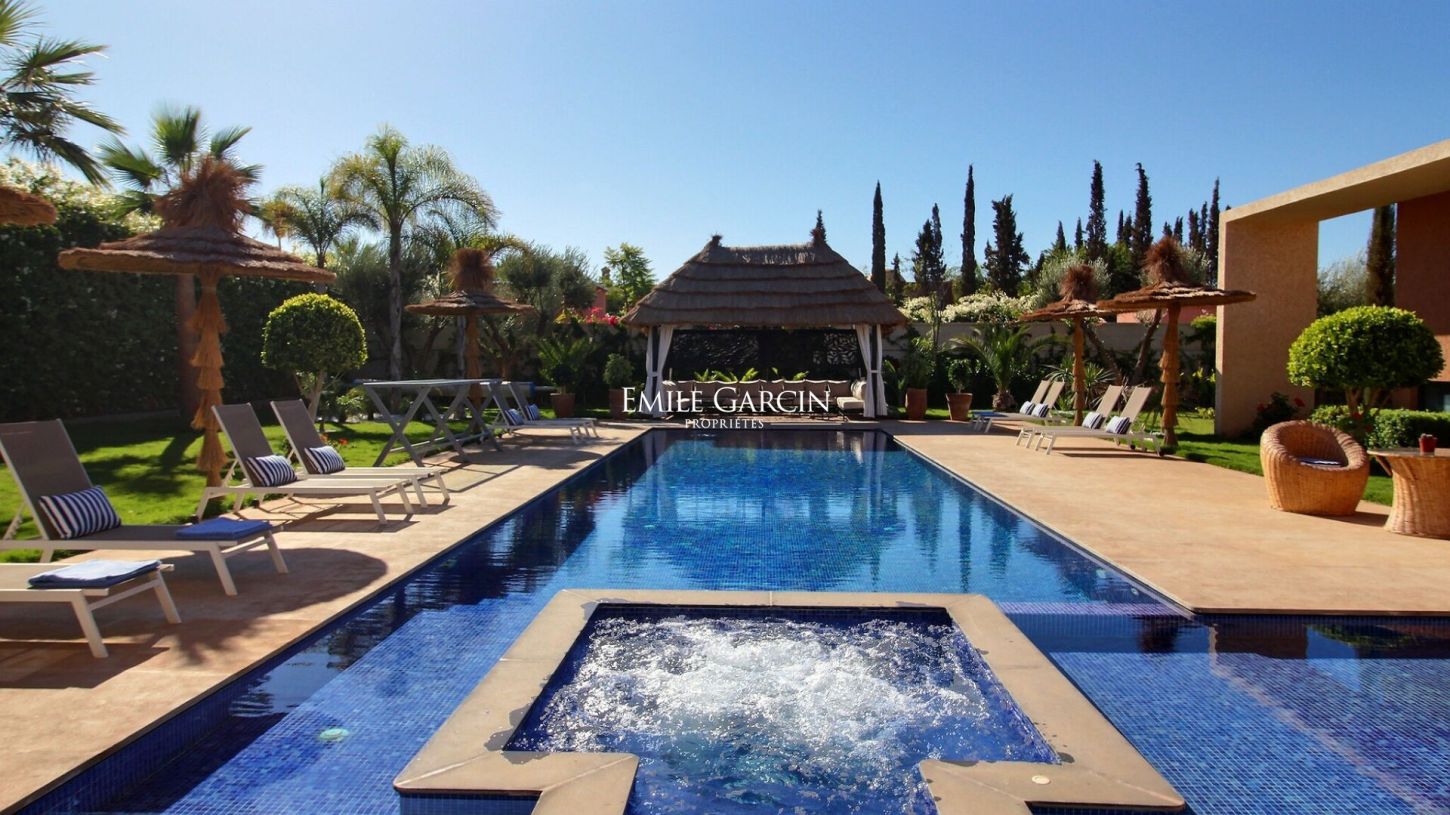 Located 15 minutes from Marrakech, this beautiful modern house presents 500 m² of living area, including five suites arranged around a very beautiful swimming pool (with built-in hot tub). The 1800 m² garden is equipped with a caidal tent, the ideal setting in which to relax in the company of family or friends. From 375 EUR / night
