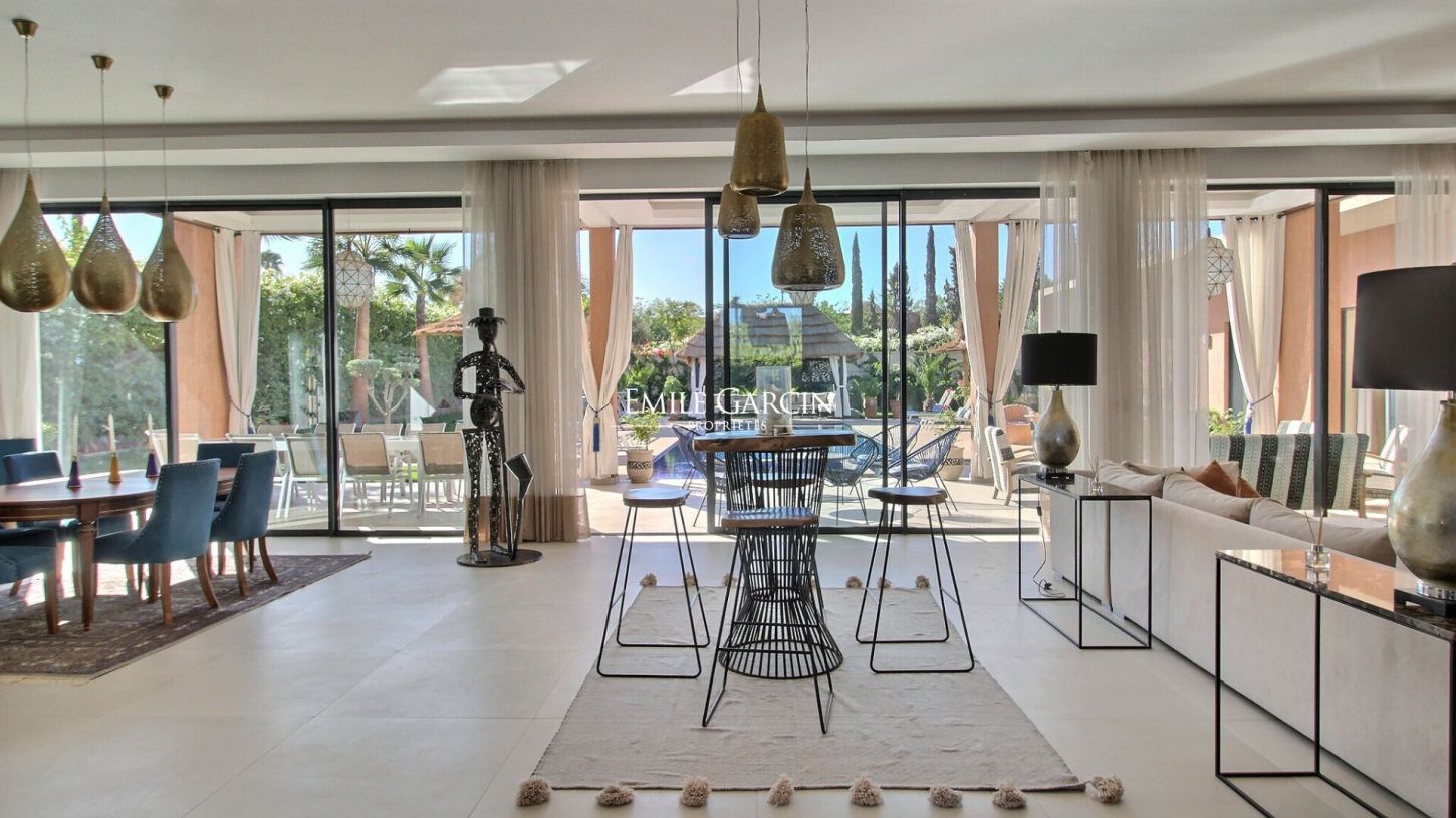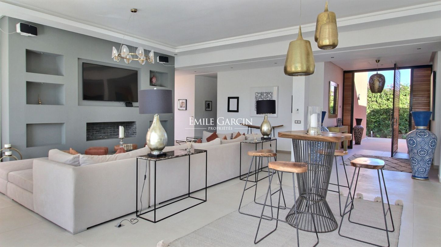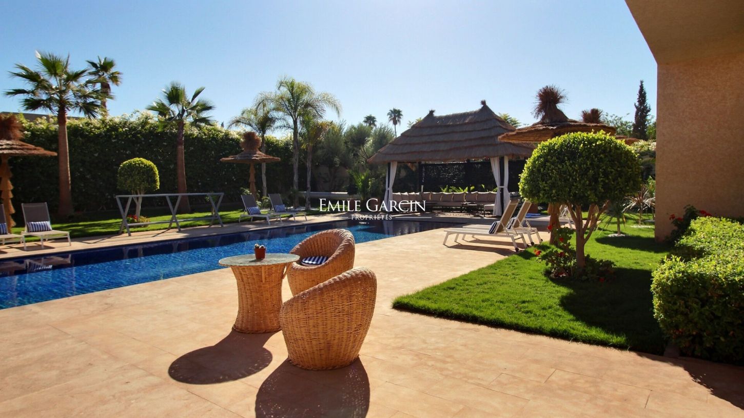 Located 15 minutes from Marrakech, this beautiful modern house presents 500 m² of living area, including five suites arranged around a very beautiful swimming pool (with built-in hot tub). The 1800 m² garden is equipped with a caidal tent, the ideal setting in which to relax in the company of family or friends. From 375 EUR / night