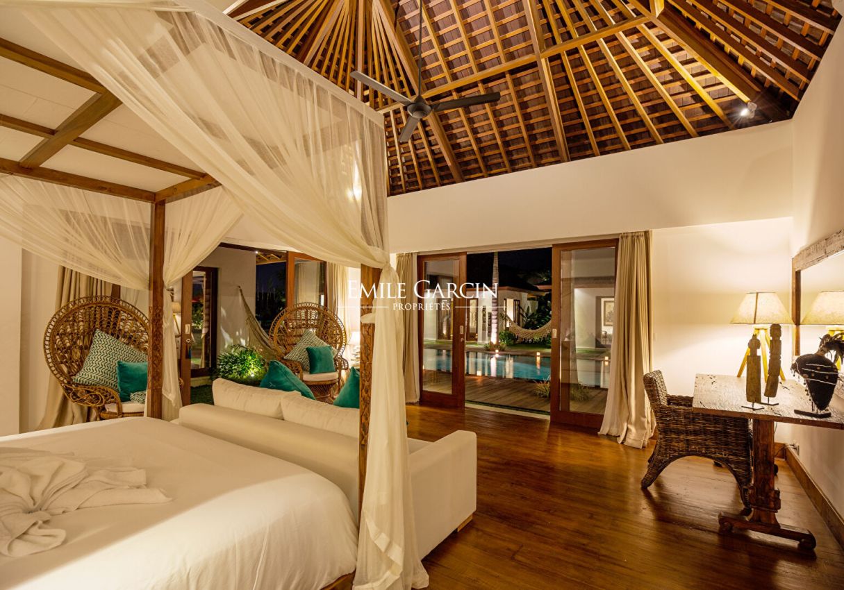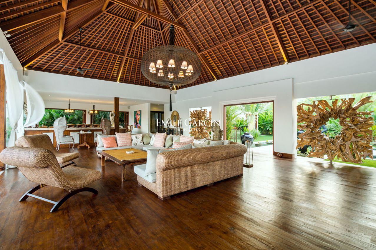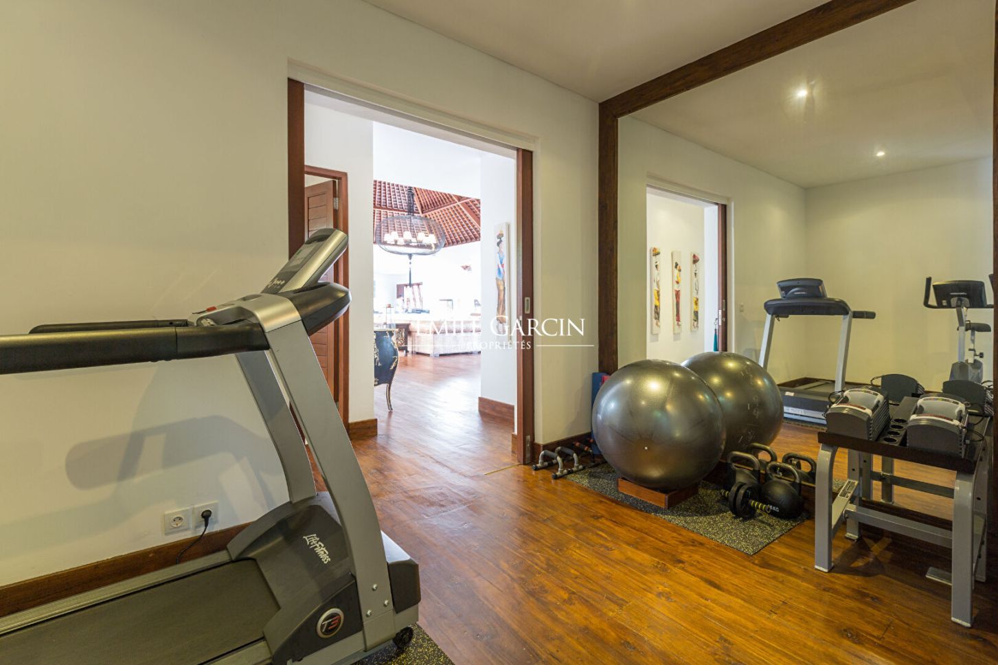 Nestled in the heart of 2600 square meters of tropical gardens and surrounded by Balinese rice fields, this villa offers a peaceful and pleasant setting. Located near Seminyak, this six-bedroom sanctuary is the perfect haven for gatherings with friends and family. Each bedroom, arranged around the pool, offers its own en-suite bathroom, while the two master bedrooms have private plunge pools. The spacious living and dining areas cover almost 200 square meters, providing ample space for relaxing and entertaining. Fully equipped, the villa offers a 25-meter swimming pool, a gym and a media room. You can also enjoy delicious meals prepared on the barbecue or pizza oven, or indulge in some friendly competition in the billiard room. With an outdoor gazebo for massages and a seamless fusion of indoor and outdoor spaces, this villa promises an unforgettable getaway. **Available from 4 bedrooms.
