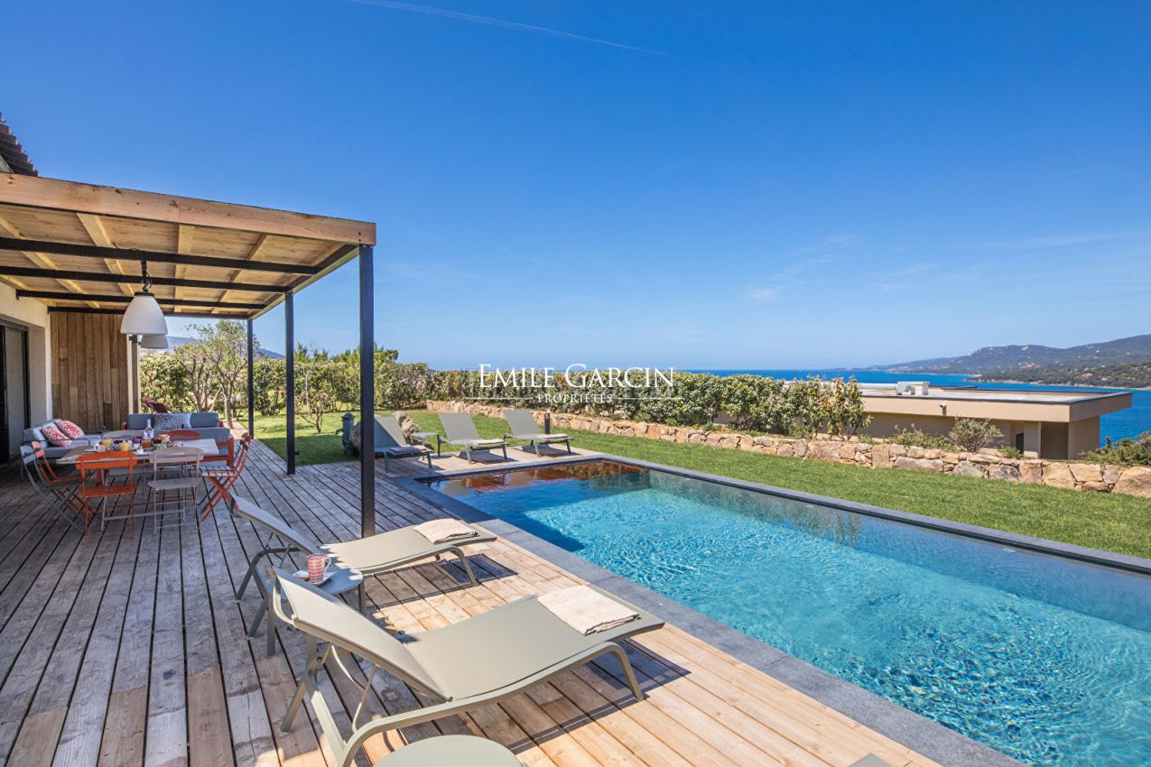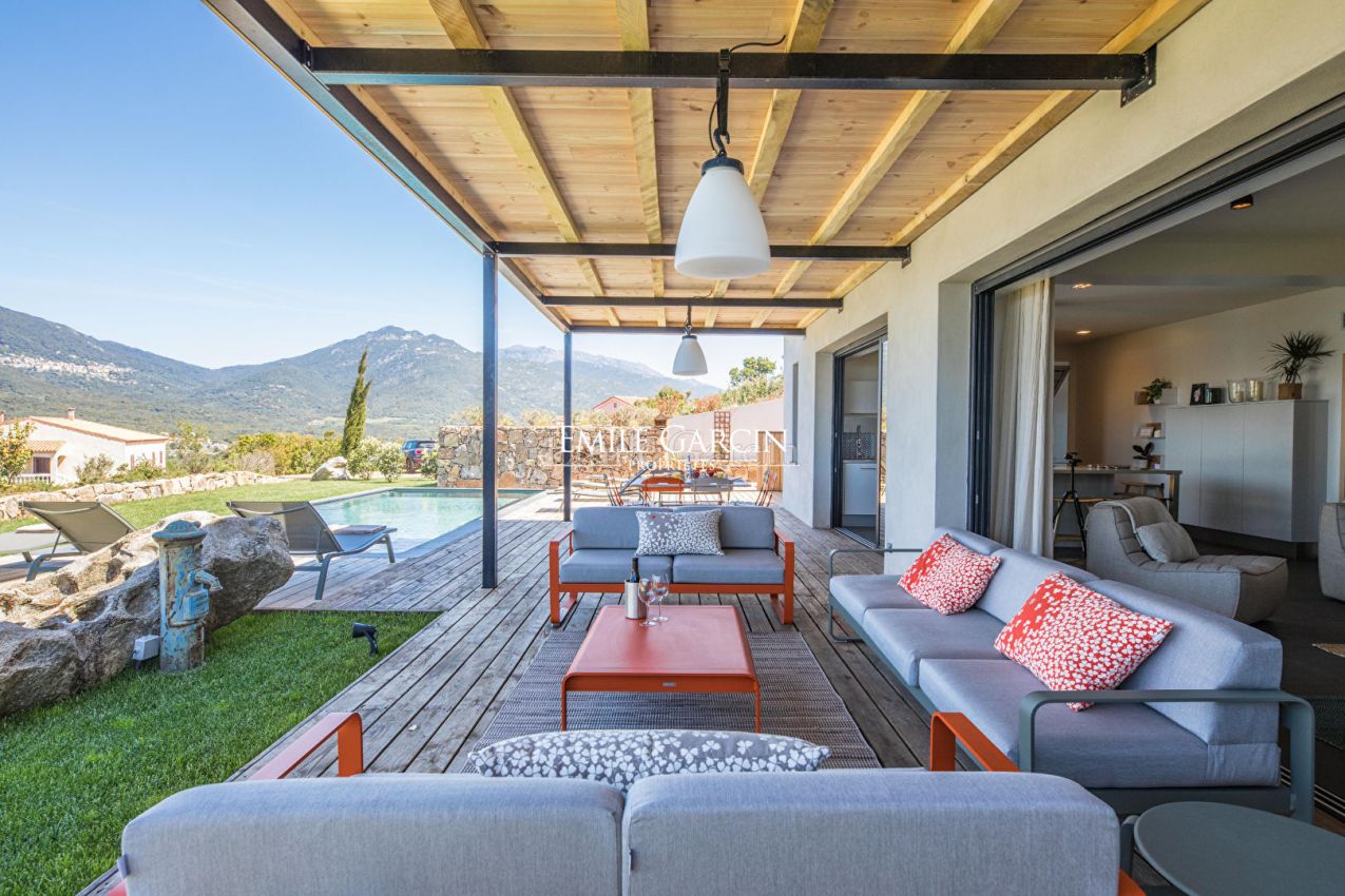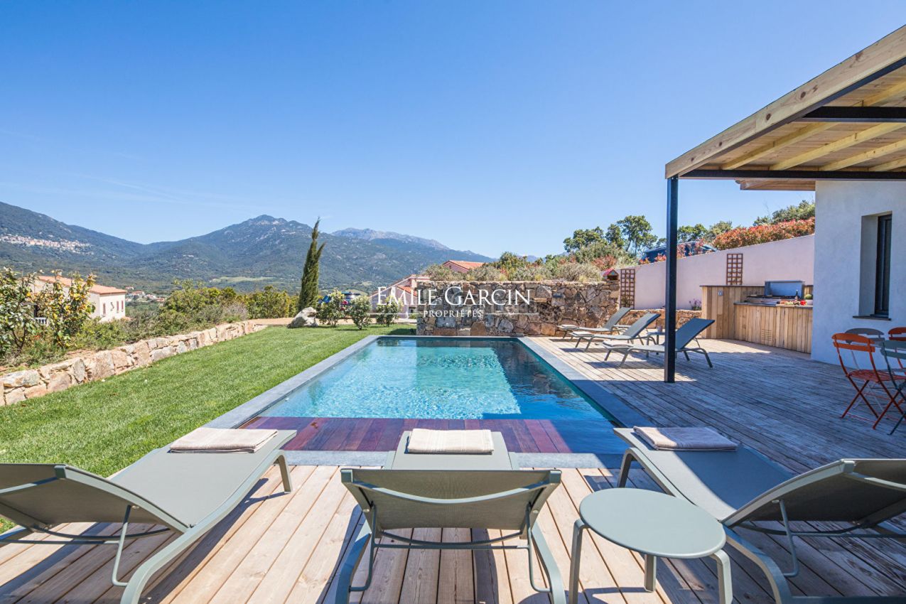 Located on the hillside in Propriano, La Casa Mirà is a modern villa of 130 sq.m offering 3 bedrooms and 2 bathrooms. Magnificent views of Valinco Bay. Fully equipped and fully air-conditioned. Beach: 10 minutes by foot. Town centre and shops: 5 minutes by car. Secure swimming pool (4 x 8m) heated from April to October. Large outdoor terrace with numerous shady areas around the swimming pool, equipped with dining area, barbecue, sofas and deckchairs. Secure parking facilities. End of stay cleaning included in the cost of your stay. Figari South Corsica Airport: 1 hour. Ajaccio: 1h 5mins.