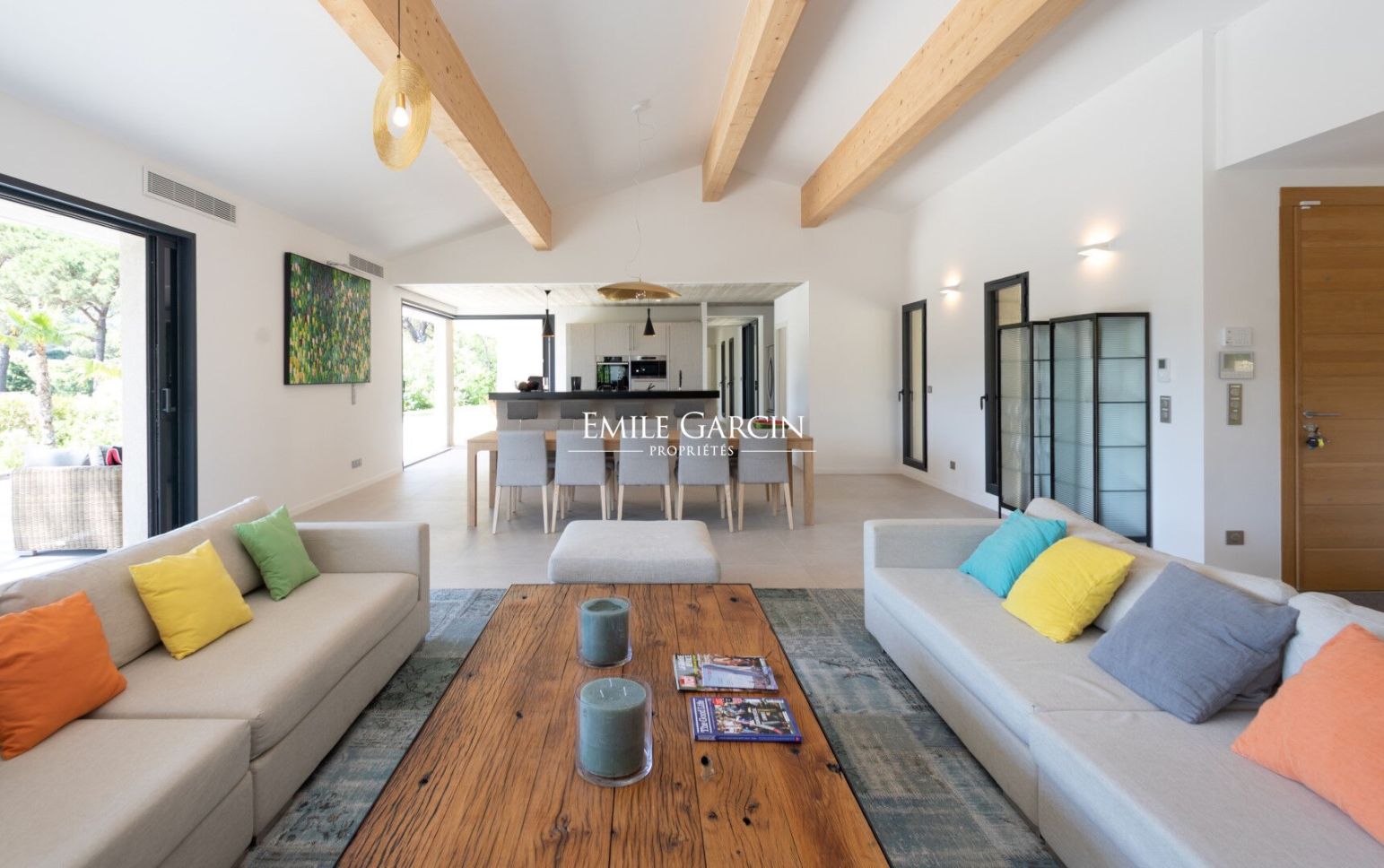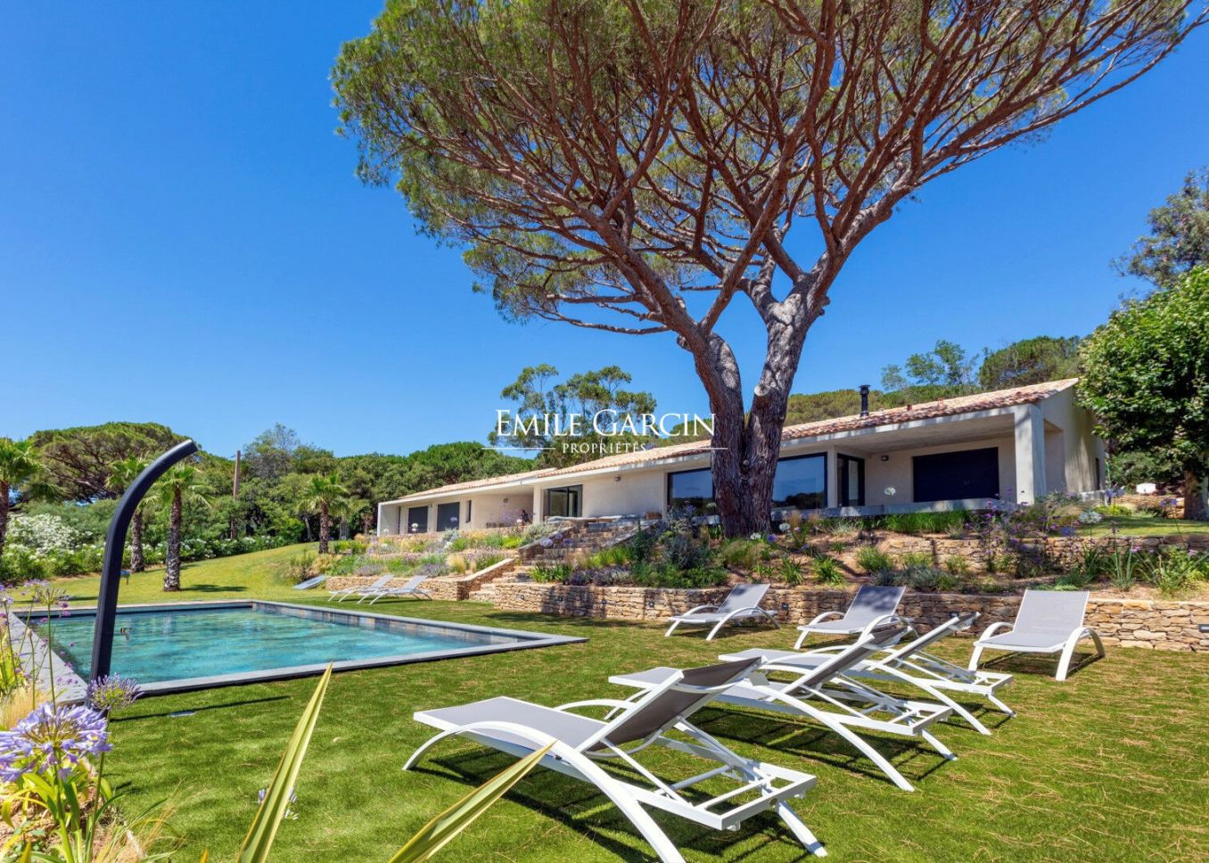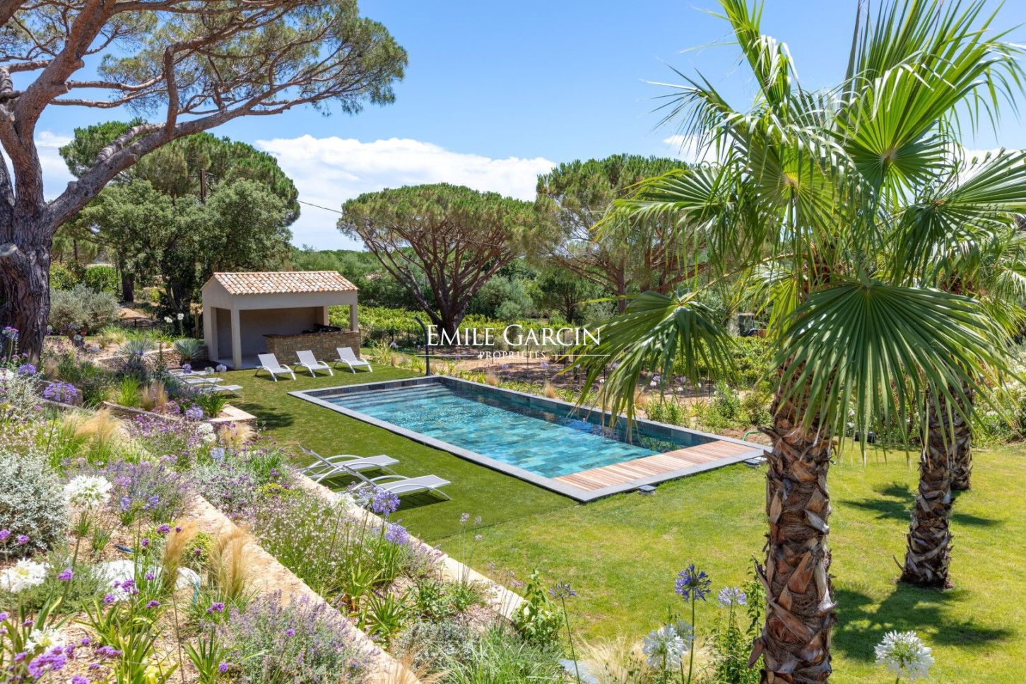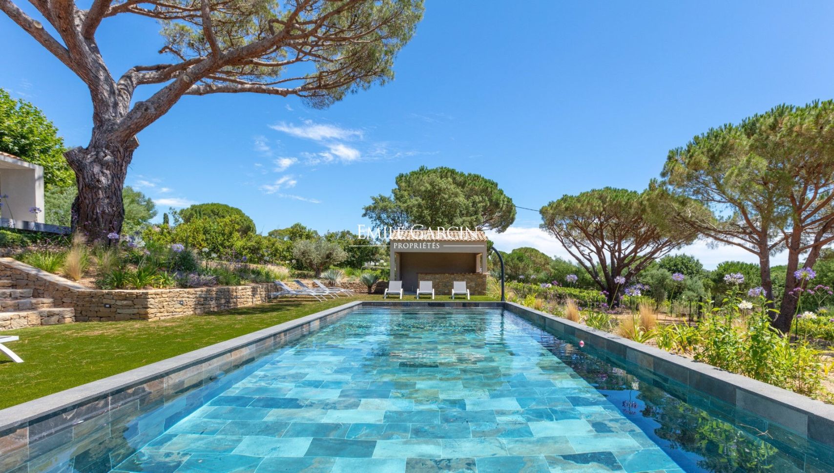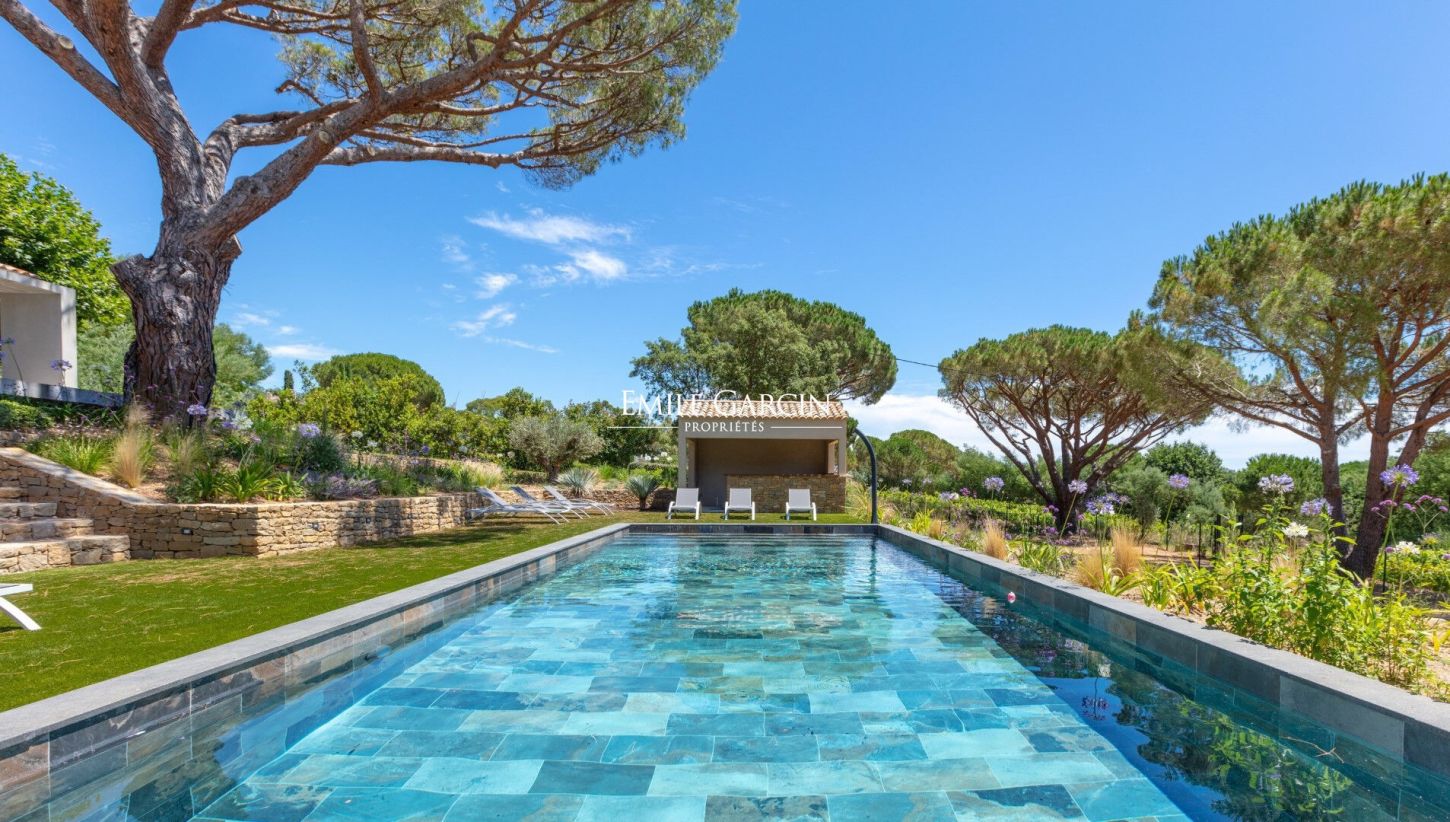 Idyllically located on the Saint-Tropez peninsula, halfway between Saint Tropez and Ramatuelle and within easy reach of the beaches of Pampelonne, this recently constructed villa offers 220 m² of contemporary-style living area. Sitting on 3,500 m² of private grounds, this property presents a peaceful natural setting in the shade of a forest of umbrella pines. Shady terrace. Heated swimming pool. Equipped pool house (BBQ, dining area). Air conditioning. 5 bedrooms, 5 bathrooms. Registration number: 83101000360EM