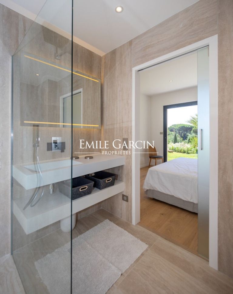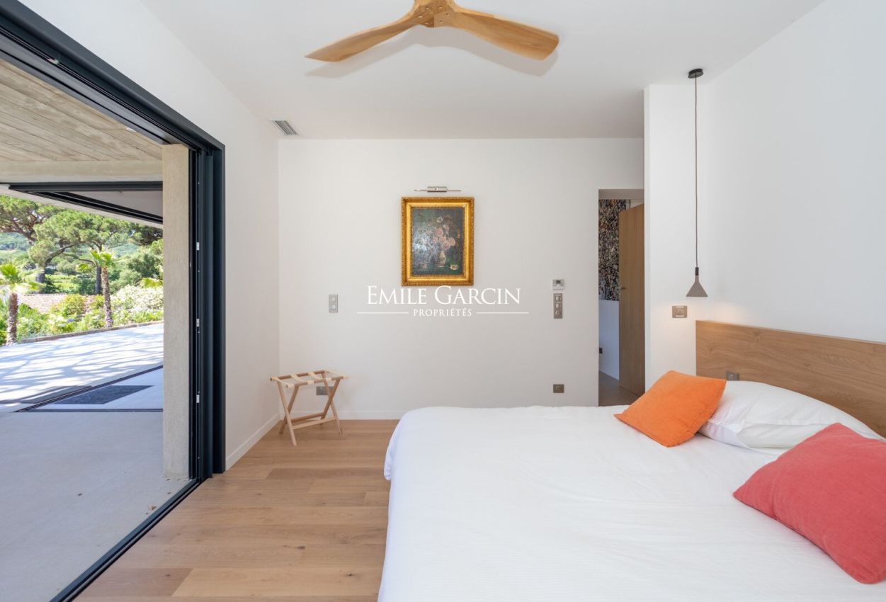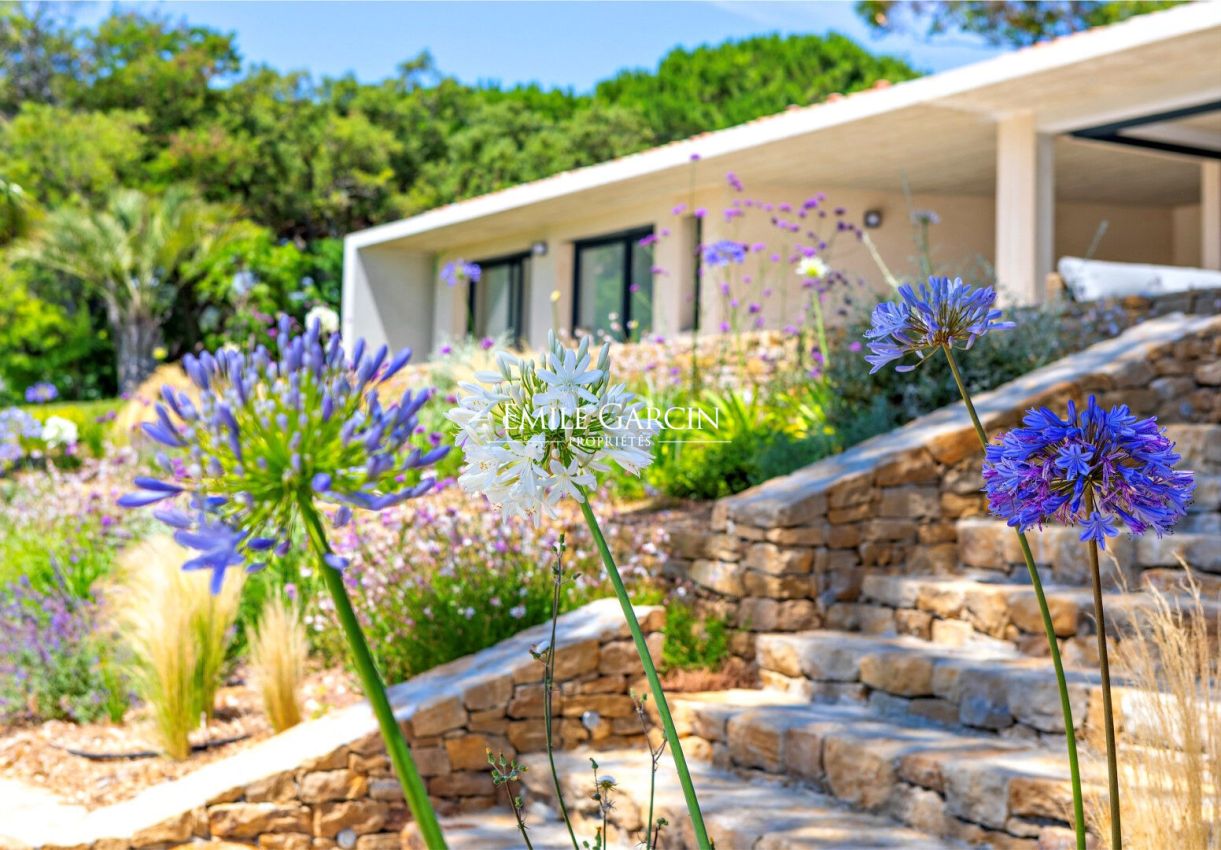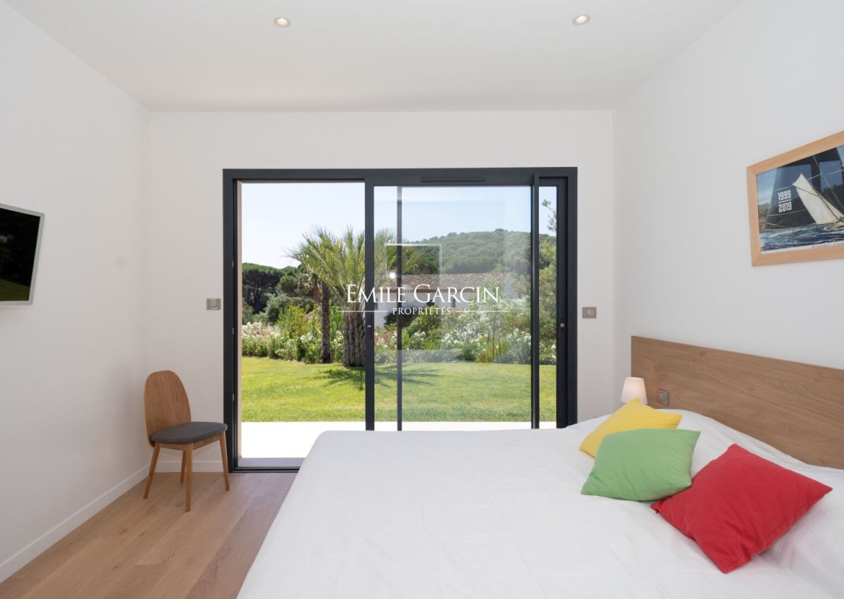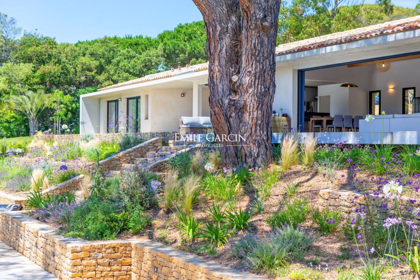 Idyllically located on the Saint-Tropez peninsula, halfway between Saint Tropez and Ramatuelle and within easy reach of the beaches of Pampelonne, this recently constructed villa offers 220 m² of contemporary-style living area. Sitting on 3,500 m² of private grounds, this property presents a peaceful natural setting in the shade of a forest of umbrella pines. Shady terrace. Heated swimming pool. Equipped pool house (BBQ, dining area). Air conditioning. 5 bedrooms, 5 bathrooms. Registration number: 83101000360EM