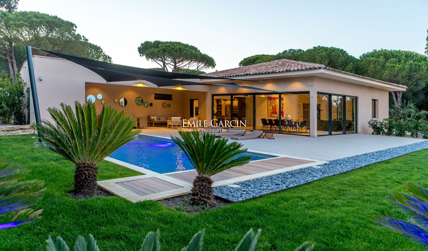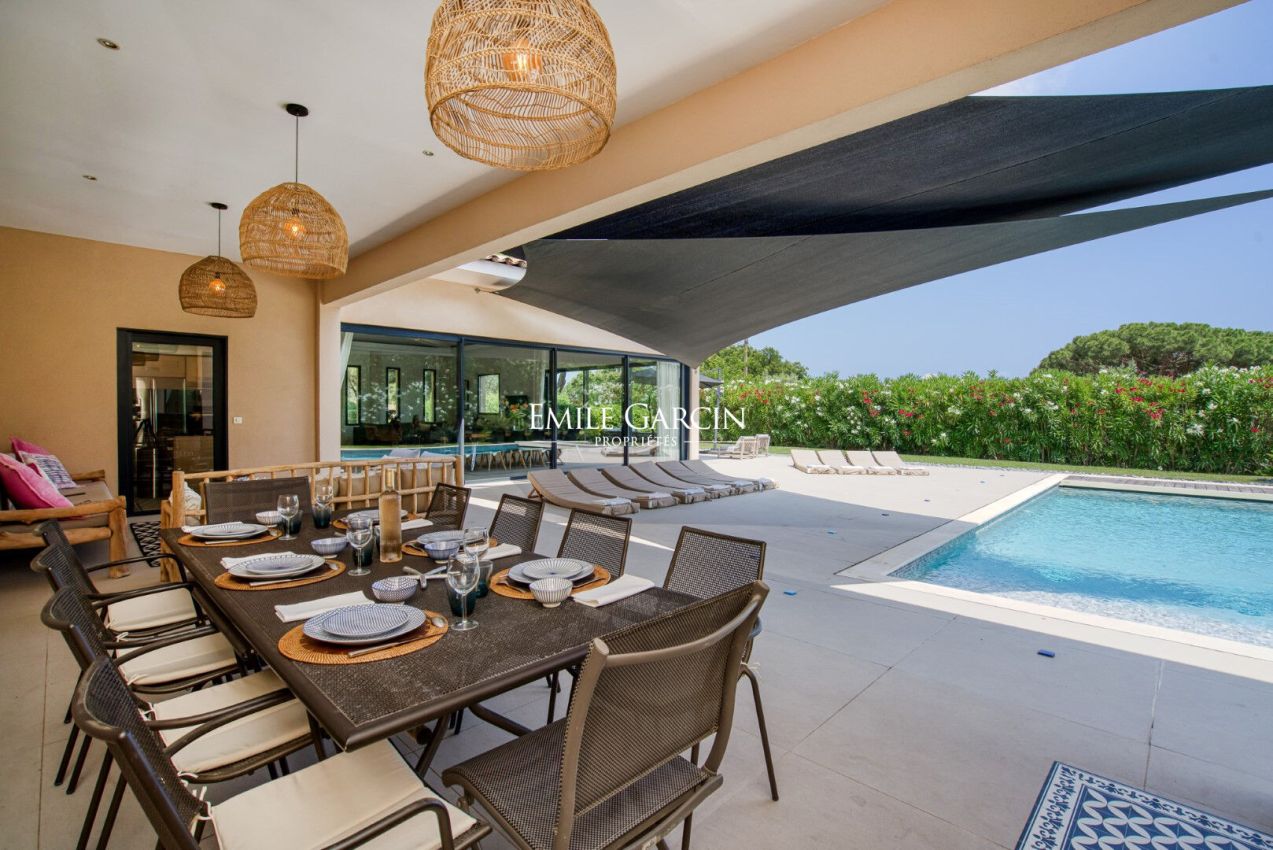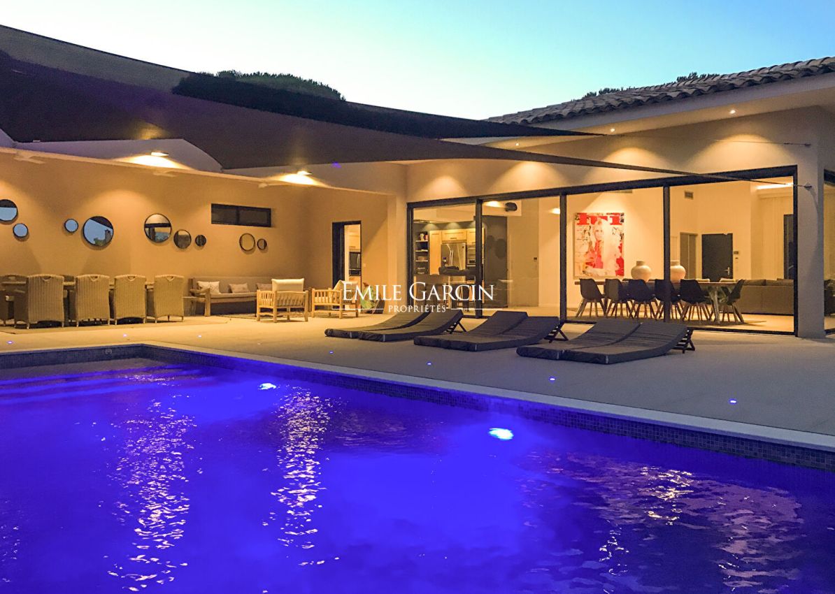 Located near the beaches of Pampelonne and the village of Ramatuelle, this magnificent modern villa of 270 sq.m on a landscaped plot of 2,200 sq.m is ideal for holidays with friends or family. Large living spaces. Heated swimming pool. Petanque ground. Services included. 5 bedrooms and 5 bathrooms. Registration number 83101000270AG