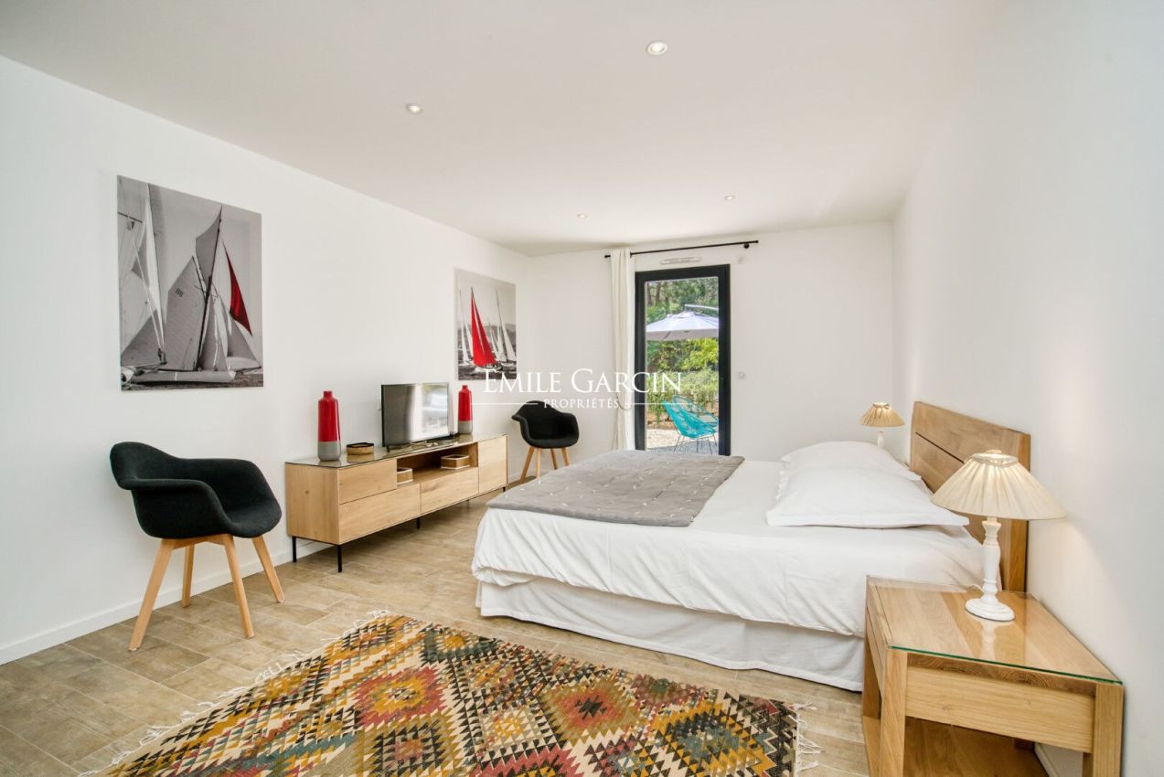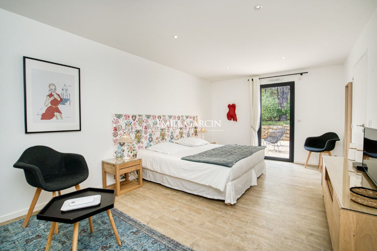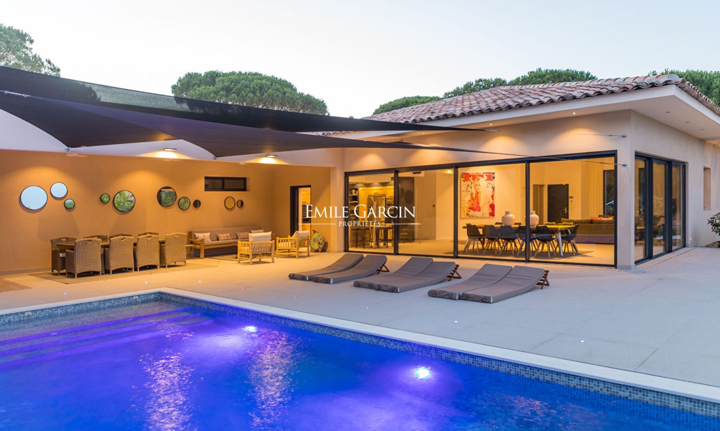 Located near the beaches of Pampelonne and the village of Ramatuelle, this magnificent modern villa of 270 sq.m on a landscaped plot of 2,200 sq.m is ideal for holidays with friends or family. Large living spaces. Heated swimming pool. Petanque ground. Services included. 5 bedrooms and 5 bathrooms. Registration number 83101000270AG