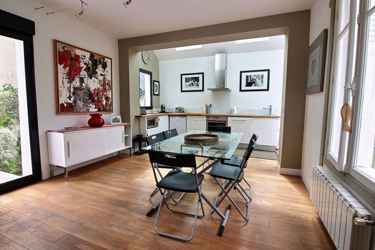 Located in the centre of Deauville, this handsome property features an entry hall with access to an equipped open kitchen and TV lounge. At garden level, it offers an ensuite bedroom, a WC, and a drying area with adjoining terrace. The garage includes a laundry area and boiler room, while the first floor comprises 2 bedrooms (one double and one twin) and a shower-room. Wi-Fi.