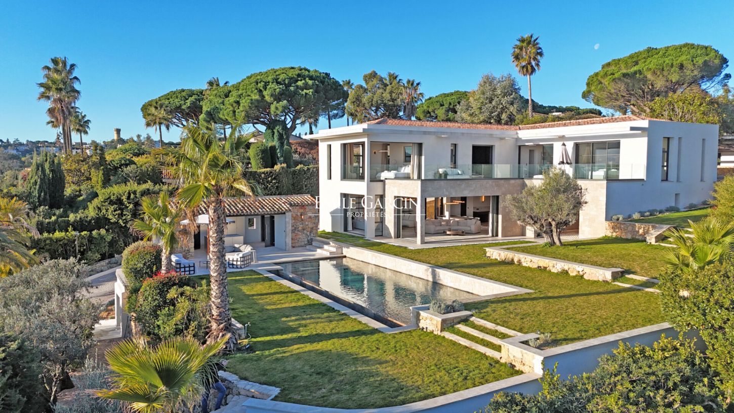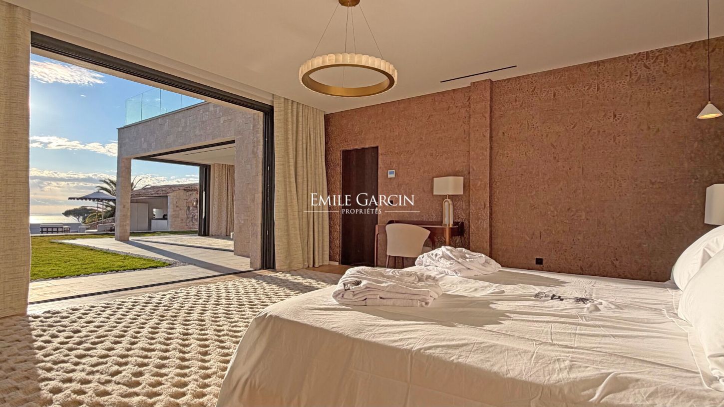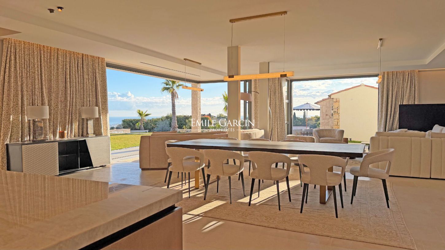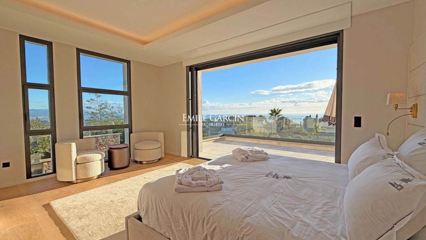 Located within a prestigious and fully secured private estate in Cannes, this brand-new contemporary villa of approx. 400 sqm offers outstanding features and a 180-degree panoramic sea view, with complete privacy.