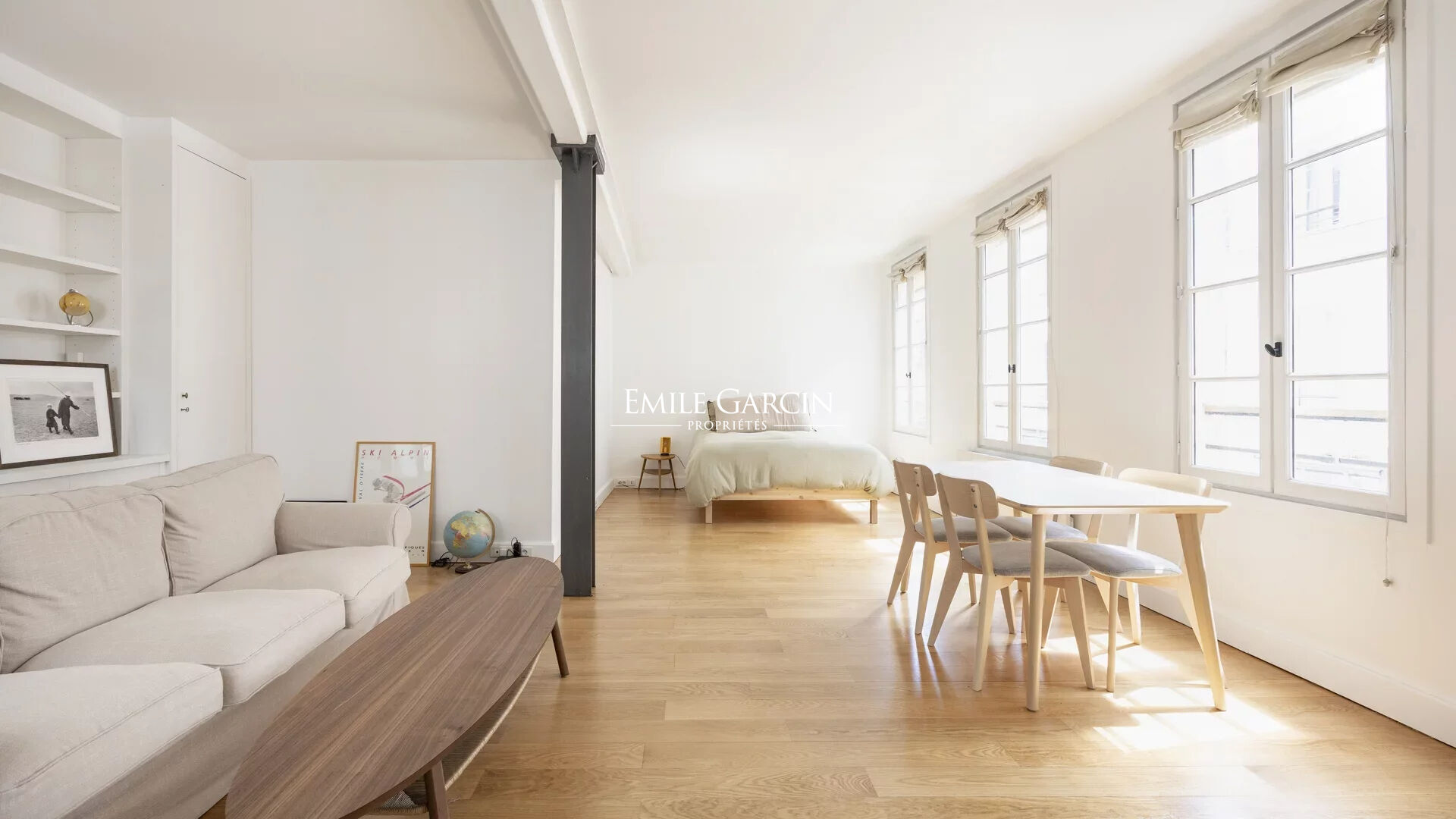 Located on the second floor of a building comprising converted workshops, this charming apartment presents 49.61 sq.m of living area (Carrez law). It includes a large 40-sq.m living room, a shower room with toilet, a dressing room, a utility room and a separate fitted kitchen. Bathed in natural light thanks to its five windows, this studio-style apartment could easily be converted into a single-bedroom apartment with a separate bedroom. Located in a quiet area overlooking a lovely tree-lined courtyard. Southeast facing.