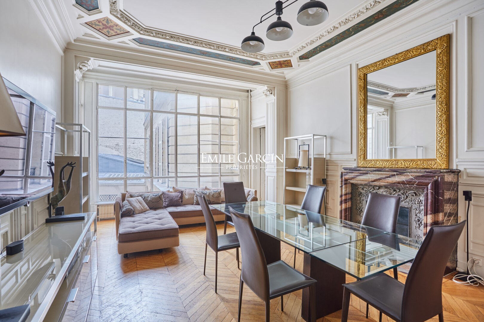 This 237 sq m apartment, located on the first floor of a prestigious Haussmannian building, captivates with its classic charm and generous proportions. From the moment you enter, the high ceilings, period moldings, herringbone parquet flooring, and superb bow window create a warm and inviting atmosphere. The apartment comprises an entrance gallery, a light-filled double reception room, a dining room, a separate kitchen, four bedrooms, and three bathrooms. The layout, both functional and elegant, clearly separates the reception areas from the private quarters.