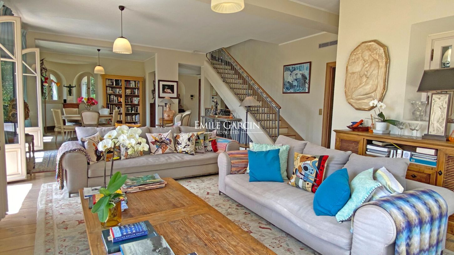 Stunning mansion with swimming pool and magnificent sea views, presenting 260 sq.m of living area and nearly 2,000 sq.m of landscaped gardens in a prime location in Cap d'Antibes. Offering an architectural style typical of the Roaring Twenties on the French Riviera, the house has been beautifully renovated while retaining its unique charm. Spread over three levels, it comprises two spacious living rooms, a separate fully equipped kitchen with dining area and four ensuite bedrooms. Additional facilities include a wine cellar, a boiler room, a laundry room and ample storage space. A private terrace on the top floor offers panoramic views of the Bay of Antibes. The nearest shops, the town centre, the beachfront and the port are all within a 15-minute walk.