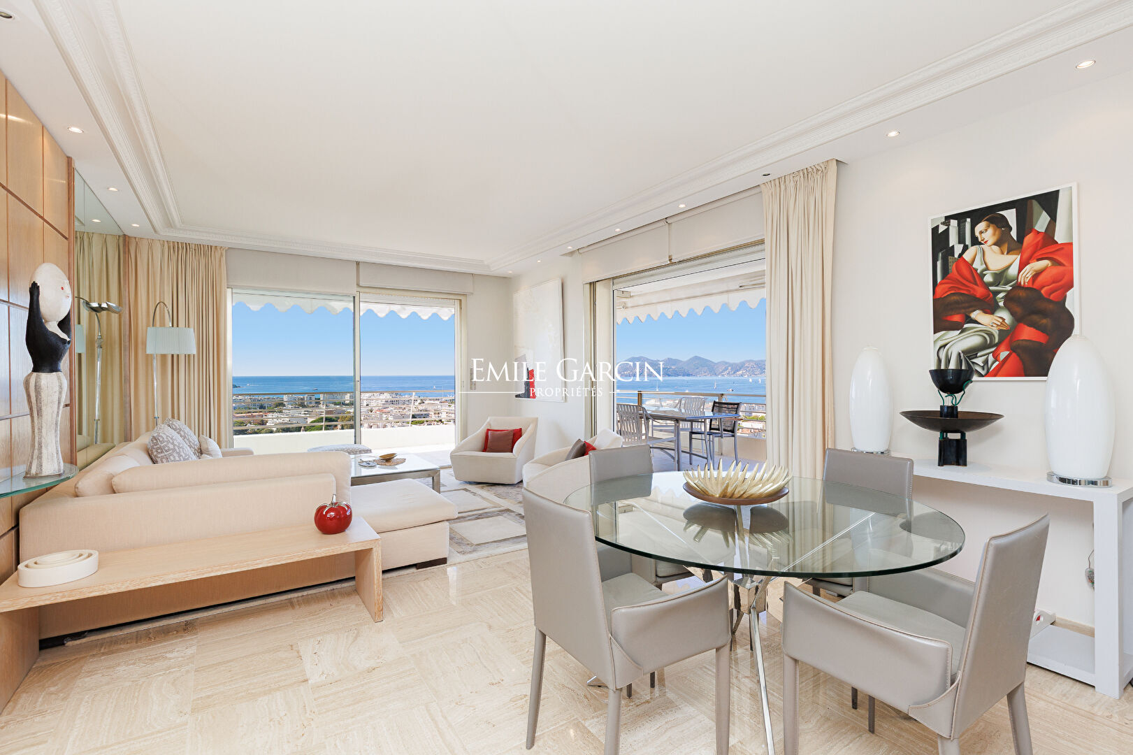 Located in a secure residence with landscaped grounds in the heart of the Basse Californie district of Cannes, within walking distance of the local shops, this sublime apartment presents 131 sq.m of living area. Perched on an upper floor, it boasts spectacular panoramic sea views stretching from the Lérins Islands to the Cap d'Antibes, via the Estérel Mountains. Peaceful and south-facing, the property offers a bright and spacious interior comprising an entrance hall, a spacious double living room, a kitchen and two beautiful ensuite bedrooms. An exceptional 60 sq.m wrap-around terrace allows you to fully enjoy the view and the sunshine. This exceptional property is sold with a large garage and a separate studio of approximately 18 sq.m. Close to the local shops, public transport links, city centre and La Croisette. Condominiums of 395 units (No proceedings in progress). Annual expenses : 4500 euros.