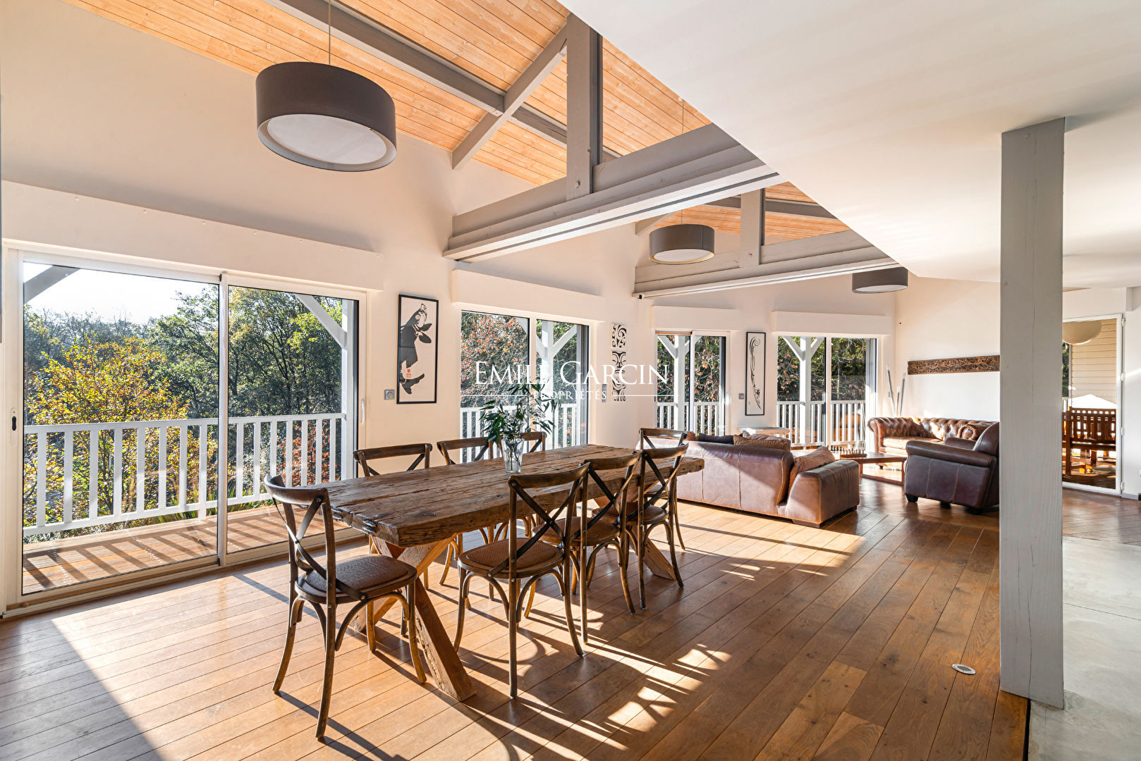 Located on the outskirts of Biarritz, just two minutes from the village of Arbonne, this beautiful house presents approximately 250 sq.m of living area. It features a vast living area backing onto terraces, as well as 4 bedrooms and 4 bathrooms. At the garden level, there is a fully independent single-bedroom apartment, ideal for entertaining family or friends. Heated swimming pool, cellar, laundry room. The property sits on 2000 sq.m of leafy grounds overlooking the forest.
