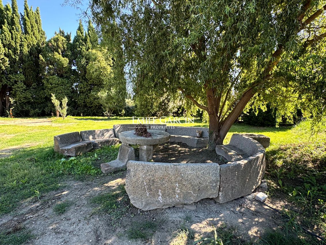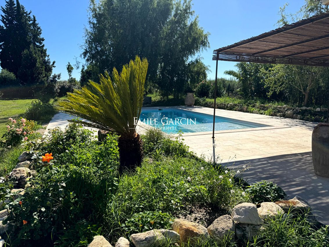 Located a few minutes from the village of Vallabrègues, a charming enclave in the Gard serving as the gateway to the Bouches-du-Rhône region, this magnificent and perfectly maintained stone farmhouse stands out for its spaciousness, light and authenticity. The vast main building comprises two large bright ensuite bedrooms, a functional dressing room, an office, a north-facing modern fitted kitchen backing onto a vegetable garden, an adjoining utility room/pantry, and a splendid living room of nearly 80 sq.m with large windows backing onto a garden and covered terrace with dining facilities. On the upstairs floor, accessible via two independent entrances, you will find: to the west, an apartment of approximately 70 sq.m comprising two bedrooms, a bathroom with WC, and a kitchen area, ideal for accommodating family friends or as a rental property; and to the east, an impressive 100 sq.m yoga room with great potential (suitable for use as an artistic workshop, a reception room or a wellness area), plus a bedroom and a shower room/WC. Outside, the relaxing garden of approximately 3,600 sq.m is planted with trees and flowers. There you will also find a large covered terrace, a beautiful swimming pool, a pool house, visitor parking facilities and a hangar. This unique property presents a winning blend of Provençal charm, comfort and potential. It would make the perfect residence for a large family, or could be converted into a gîte or other business premises.