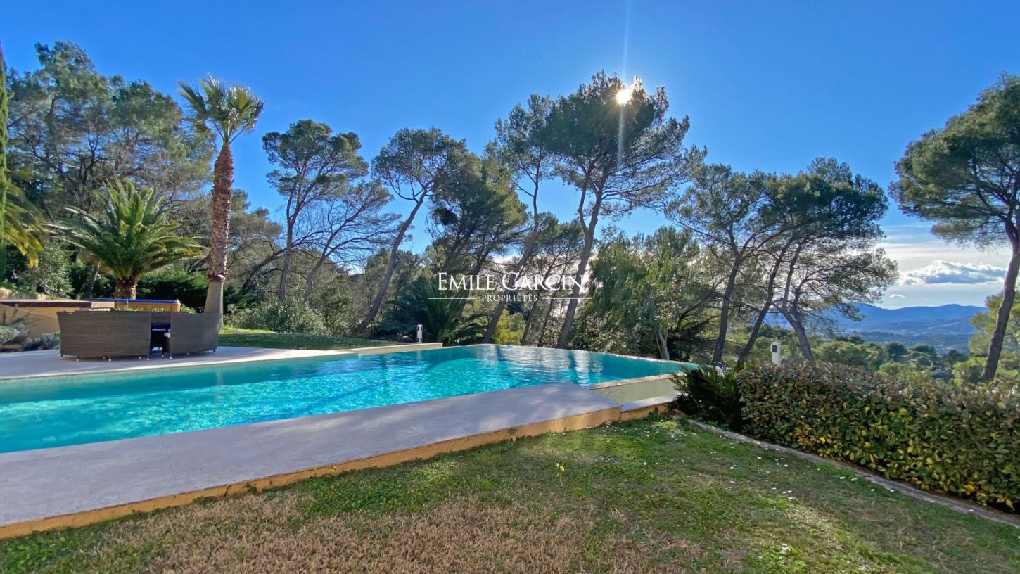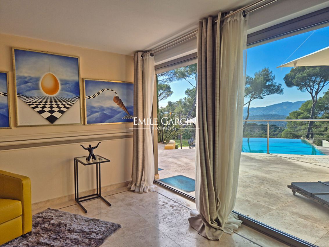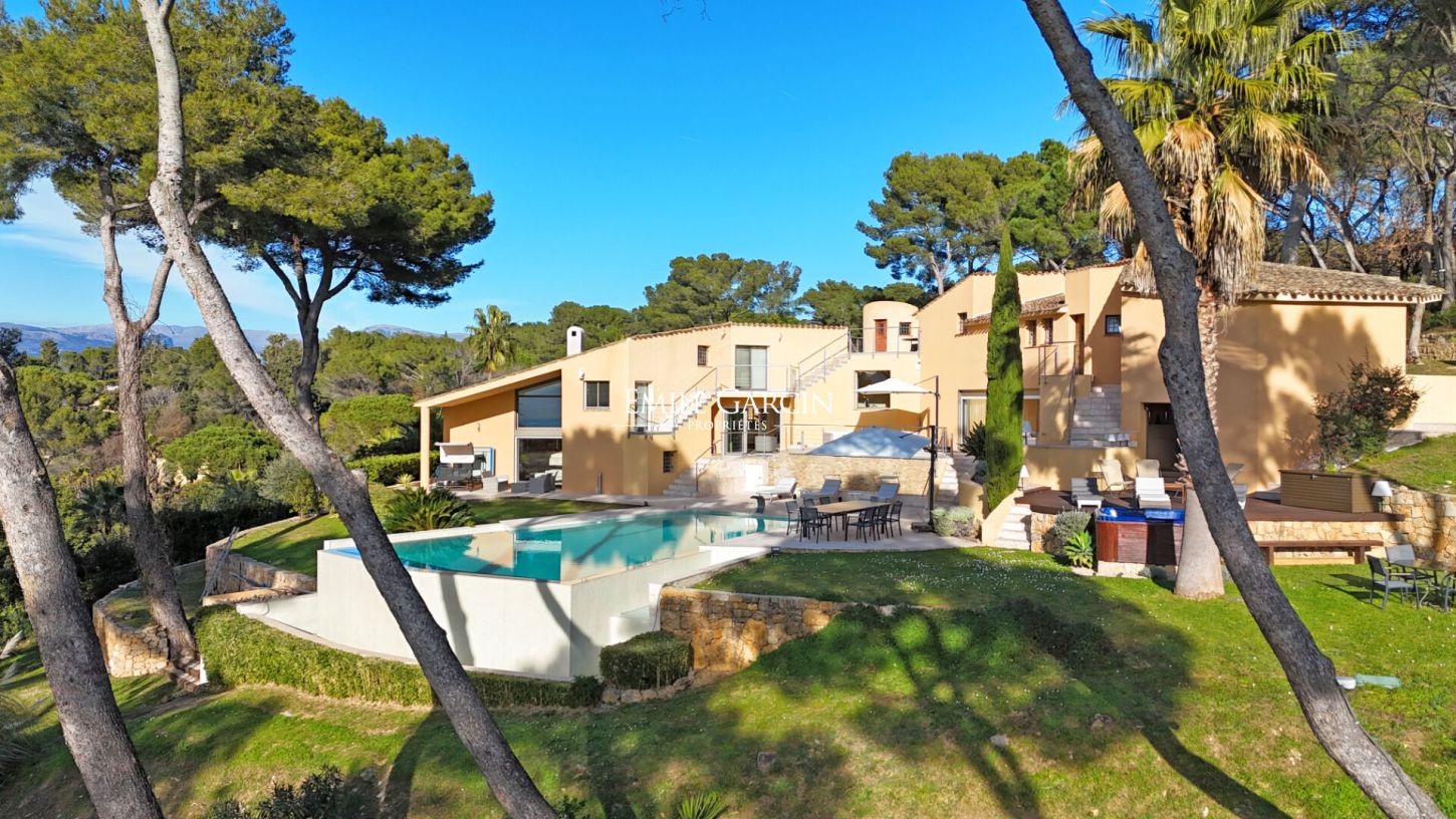 Located in the residential area of Hameau du Guillet in Mougins, this magnificent house presents a living area of 455 sq.m with a unique architectural style. Perfect for a family, the property is in excellent condition and offers a pleasant and spacious interior where each member of the family can enjoy their own private space. The house is bathed in light, thanks to its South/South-West/West aspect, and boasts a breathtaking view of the Esterel and the historic village of Mougins. Perched atop a hill, it also benefits from the morning sun from the East. The interior includes a large double living room with TV lounge, a dining room and a beautiful fully equipped kitchen with pantry. Each bedroom has its own bathroom, and every room backs directly onto the outdoor spaces, whether the terraces or the garden. The property also includes a mezzanine equipped with an office, ideal for anyone working from home. The garden of 5275 sq.m (mostly flat) surrounds the house and offers magnificent outdoor spaces. A double garage is available, in addition to a carport and additional parking spaces. The infinity pool (15 x 7m) and hot tub add a touch of luxury. This rare and exceptional house has a high-quality finish and offers comfort and tranquillity while remaining close to all local amenities.