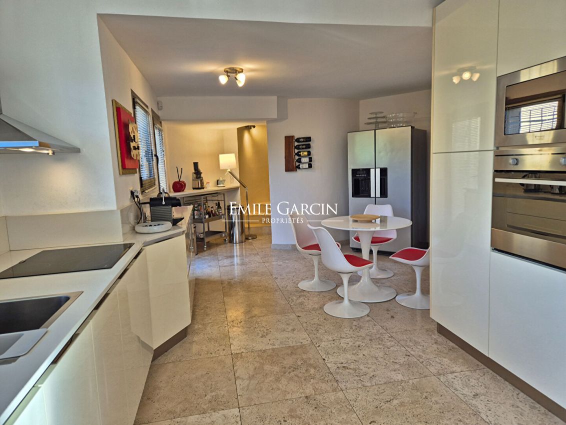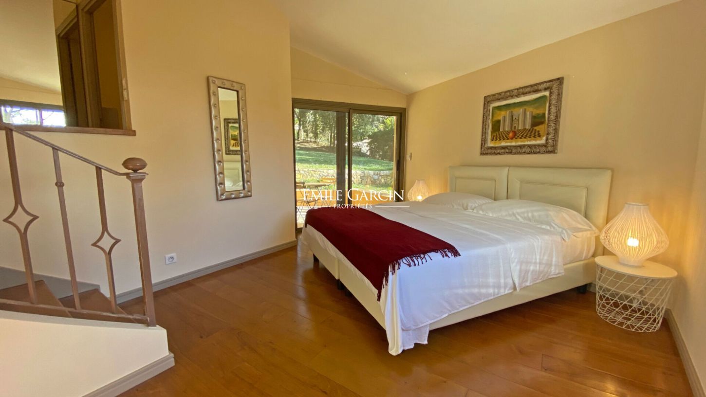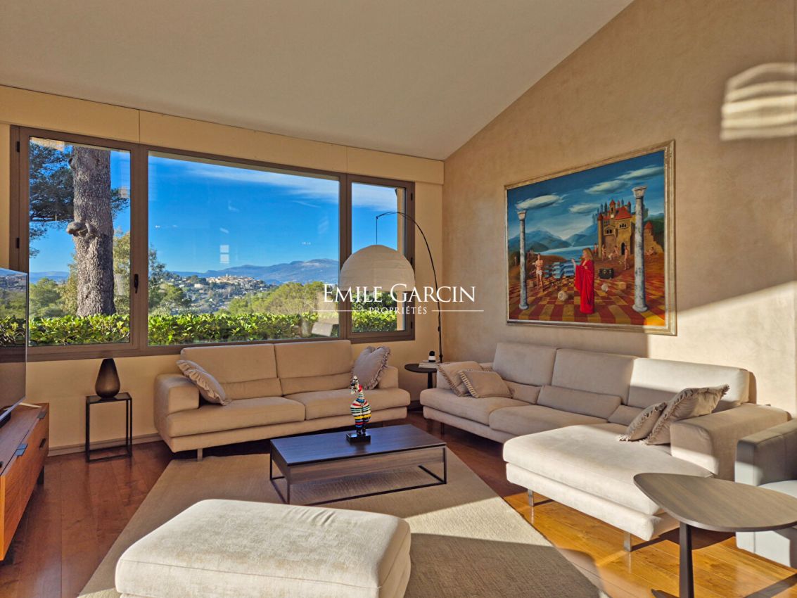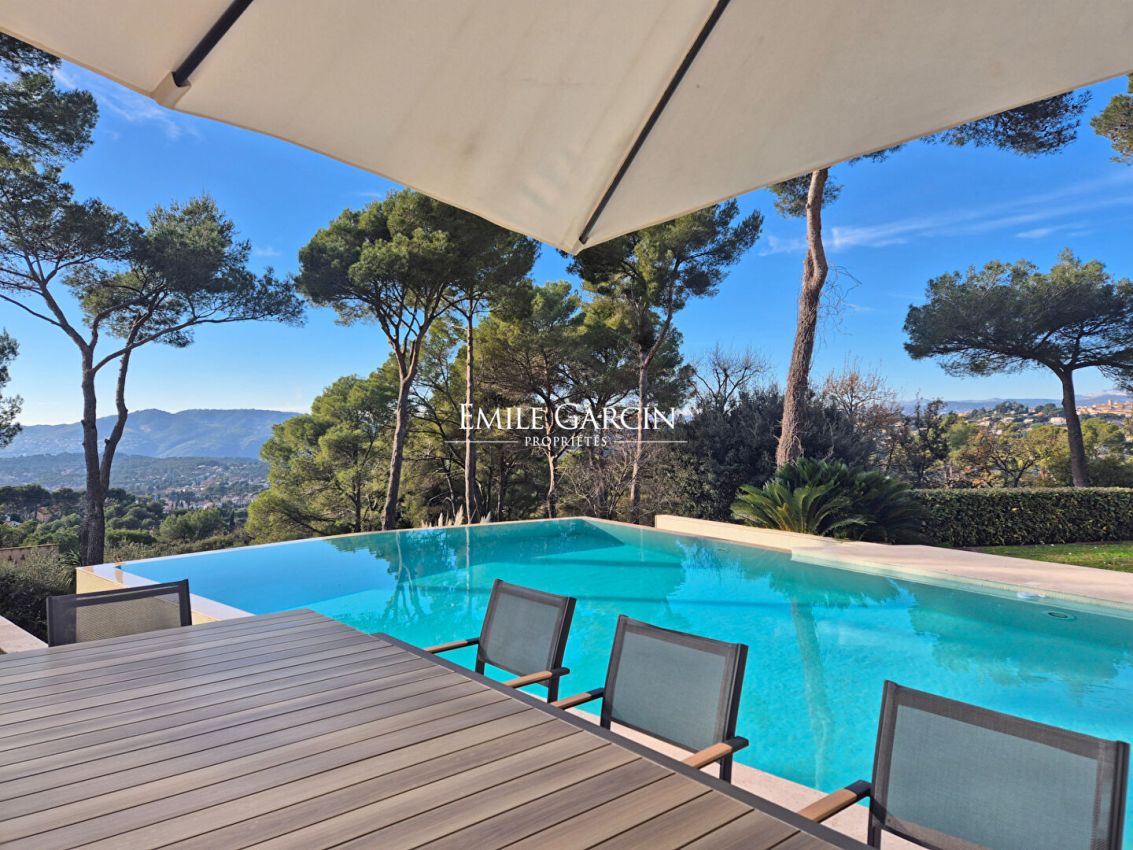 Located in the residential area of Hameau du Guillet in Mougins, this magnificent house presents a living area of 455 sq.m with a unique architectural style. Perfect for a family, the property is in excellent condition and offers a pleasant and spacious interior where each member of the family can enjoy their own private space. The house is bathed in light, thanks to its South/South-West/West aspect, and boasts a breathtaking view of the Esterel and the historic village of Mougins. Perched atop a hill, it also benefits from the morning sun from the East. The interior includes a large double living room with TV lounge, a dining room and a beautiful fully equipped kitchen with pantry. Each bedroom has its own bathroom, and every room backs directly onto the outdoor spaces, whether the terraces or the garden. The property also includes a mezzanine equipped with an office, ideal for anyone working from home. The garden of 5275 sq.m (mostly flat) surrounds the house and offers magnificent outdoor spaces. A double garage is available, in addition to a carport and additional parking spaces. The infinity pool (15 x 7m) and hot tub add a touch of luxury. This rare and exceptional house has a high-quality finish and offers comfort and tranquillity while remaining close to all local amenities.