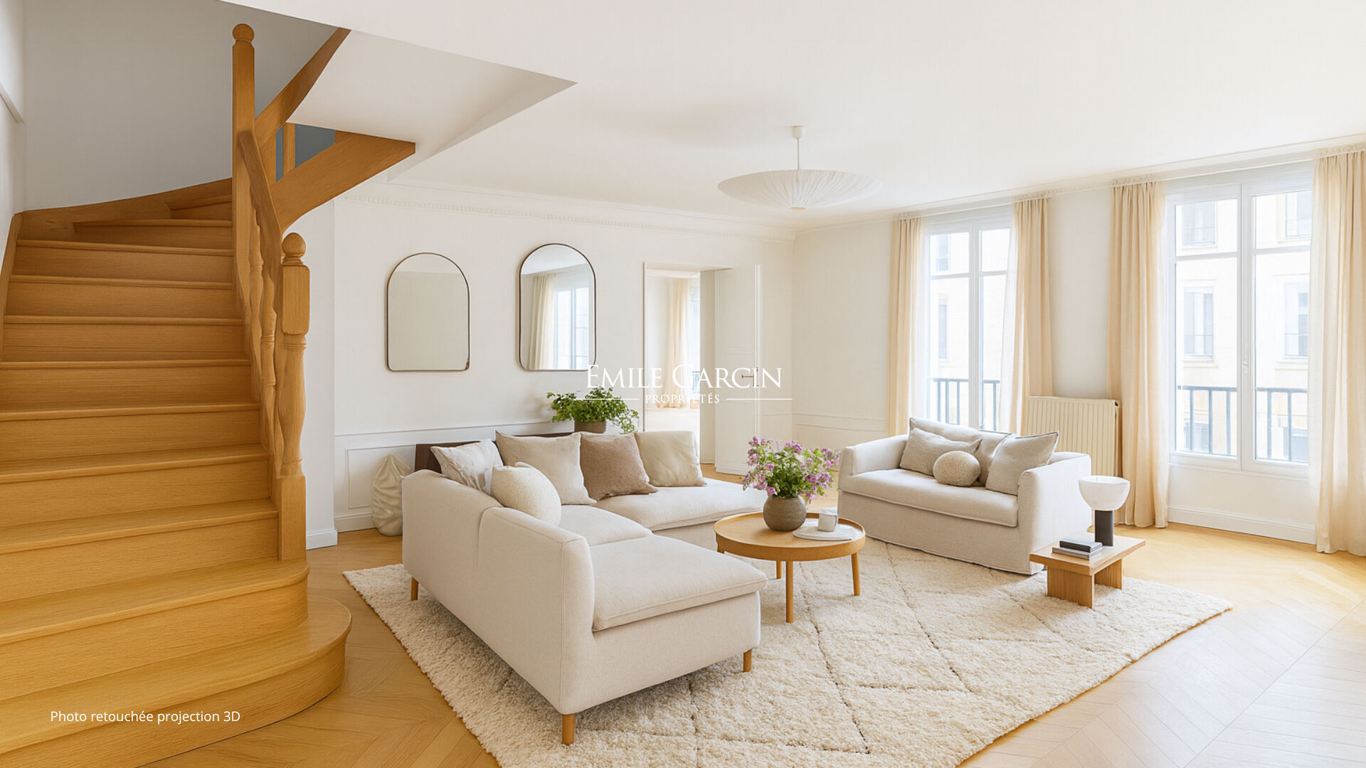 Ideally located near the Palais Royal, on the top floors of a beautiful building with elevator, this 127.66 sqm Carrez Law duplex apartment (176.64 sqm floor area) includes a spacious living room and dining room with fireplaces, a separate kitchen, two bedrooms, two bathrooms with toilets, a separate toilet, and a converted attic. On a high floor, quiet and bright, this property combines old-world charm with great development potential. Some work is required. A cellar in the annex completes this property. Condominiums of 100 units (). Annual expenses : 3500 euros.