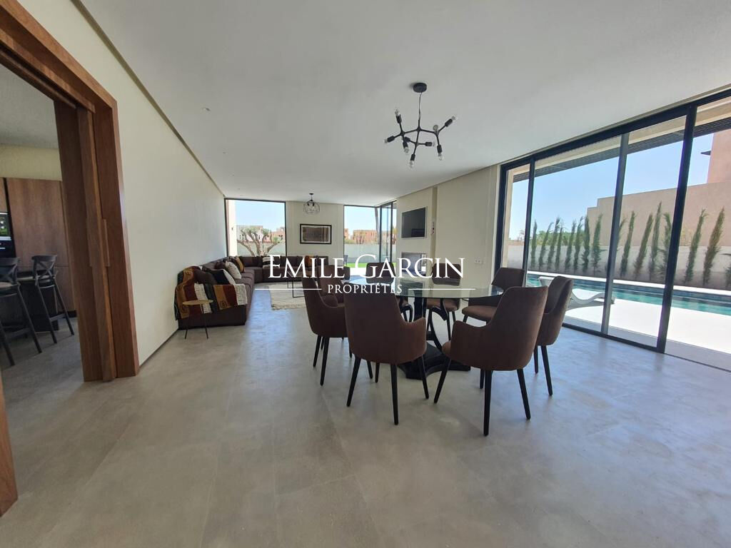 Idyllically located on a private residence near the Amelkis golf course, this delightful contemporary villa presents 450 sq.m of living area on 1,040 sq.m of magnificent private grounds. It features a reception area with living room and fireplace, a dining room backing onto the garden, a fully equipped modern kitchen, four suites with private bathrooms and dressing rooms, a beautiful landscaped terrace, a 15 x 3.5m swimming pool, and a service bedroom. High-quality construction and exceptional finish.