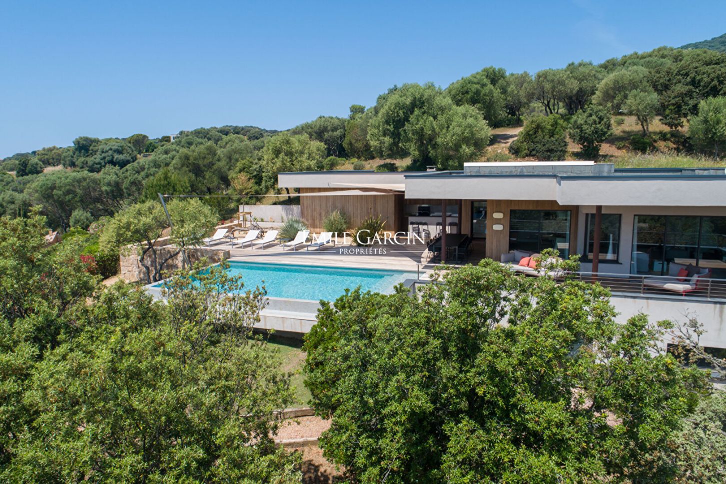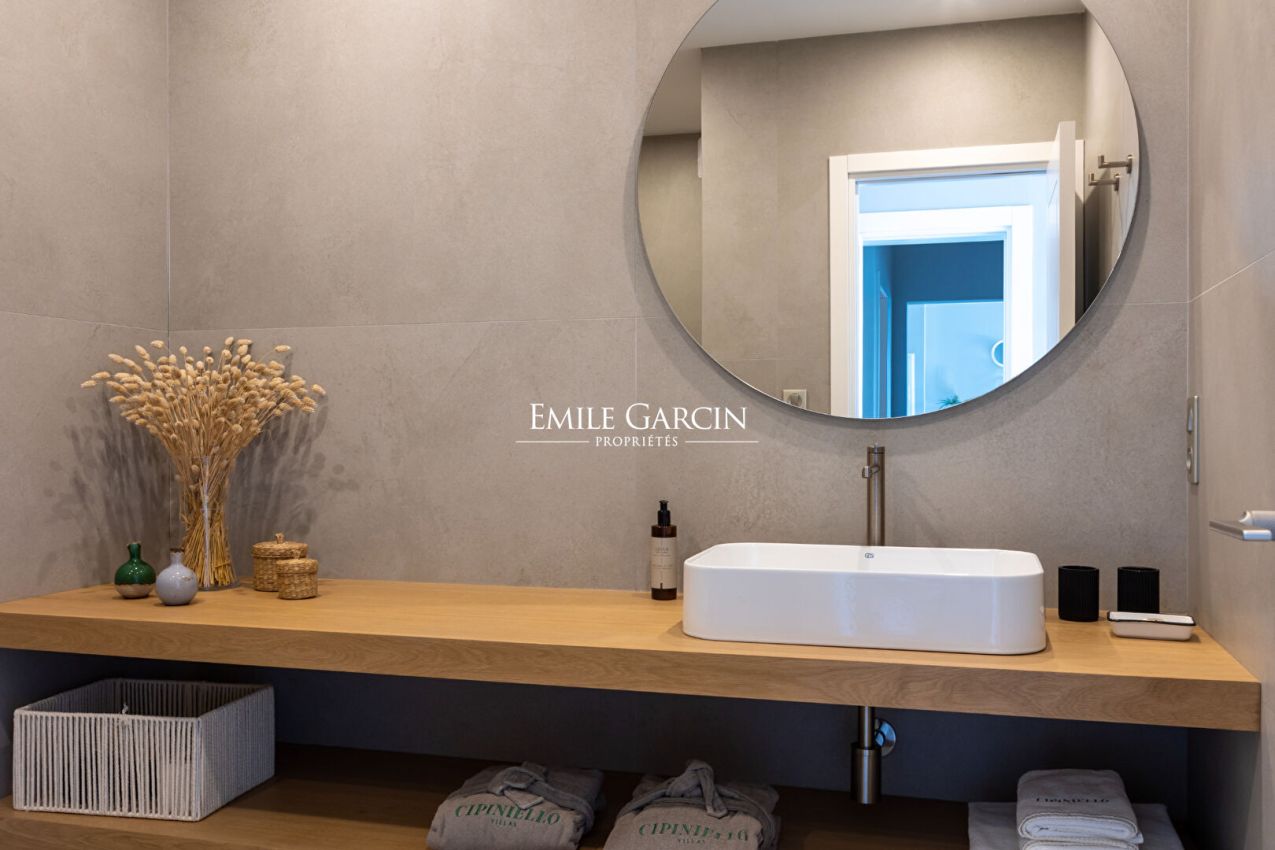 Located in the Propriano Bay, this handsome modern villa comprises 4 double bedrooms, a child?s dormitory, 5 bathrooms and a heated infinity pool. The property is just a 5-minute walk from a wild beach, down its own private path.