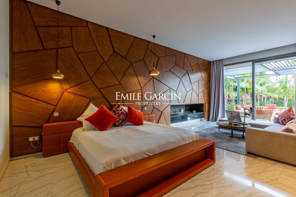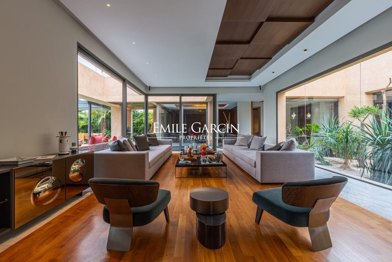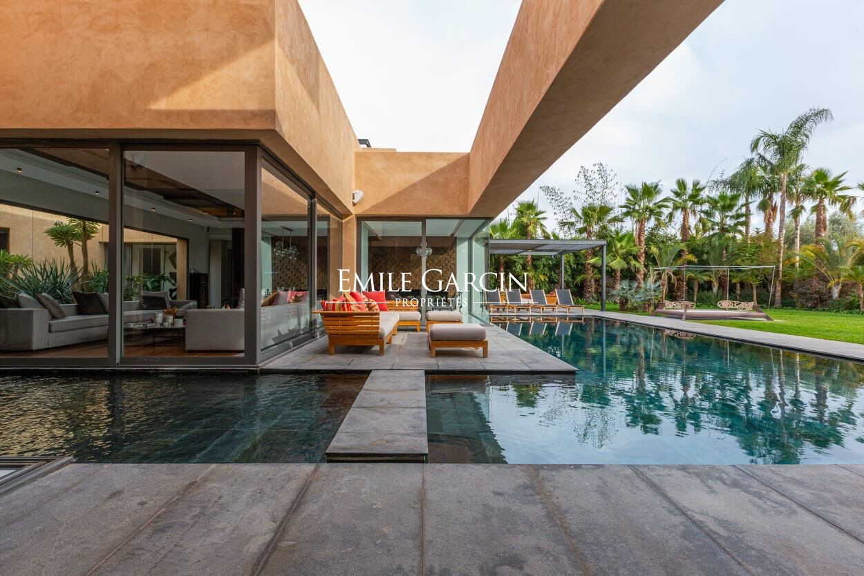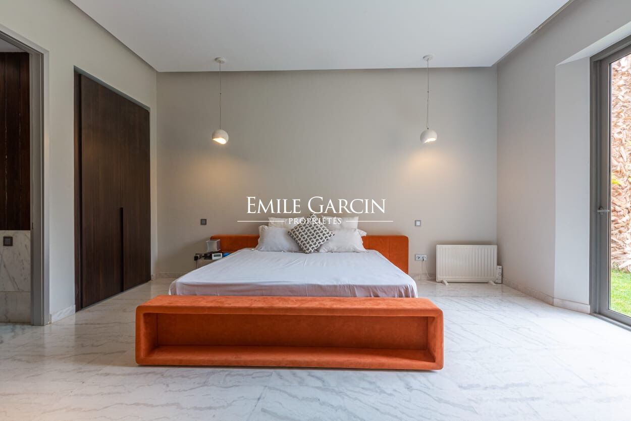 Beautiful modern villa in an idyllically located gated development, just 15 minutes from Marrakech. The property presents four spacious suite (sleeping eight people), a large and bright living room with fireplace and views of the gardens, and a beautiful furnished outdoor living area to enjoy the garden, the swimming pool (unheated) and hot tub. The ideal setting for a break in the company opf friends or family. Additional cleaning service: 100 EUR / stay. Minimum stay of 3 or 4 nights, depending on the season. Available from 800 EUR / night (including Moroccan breakfast).