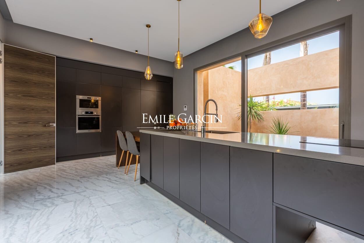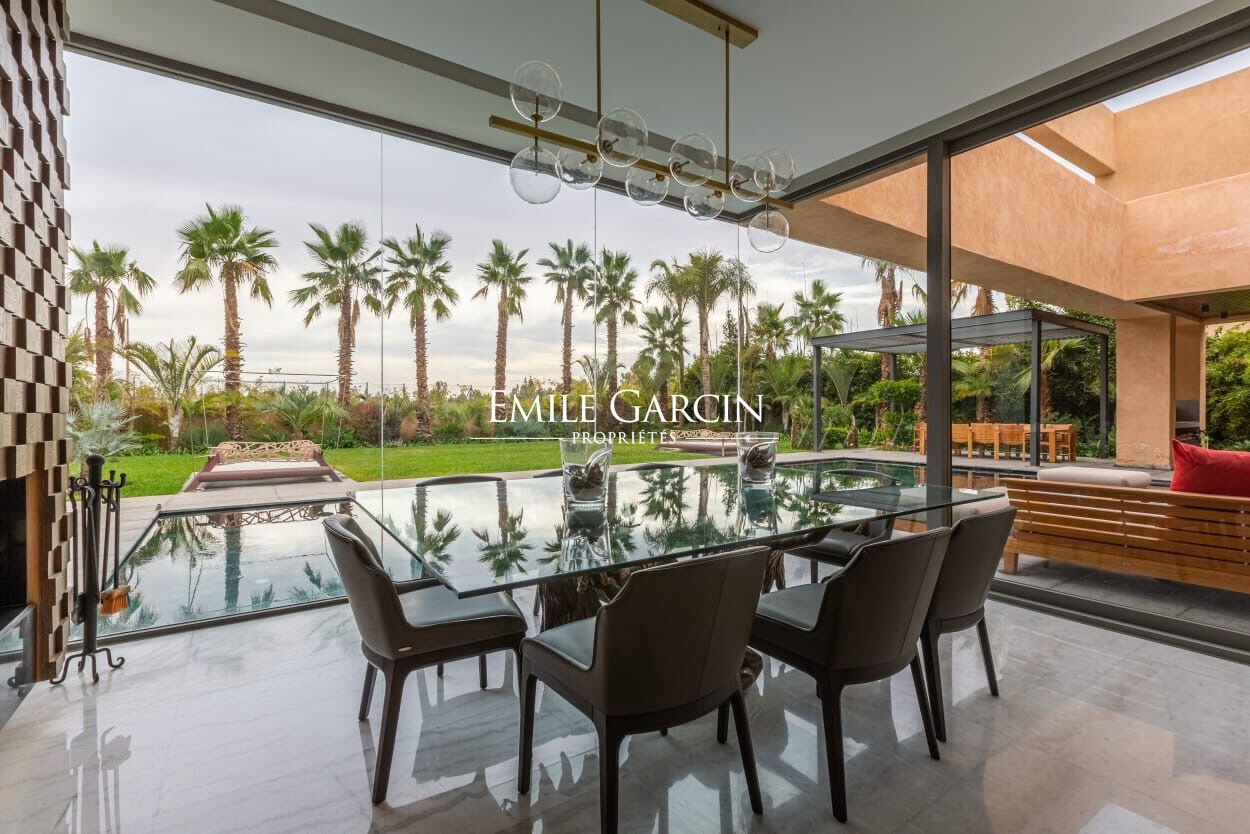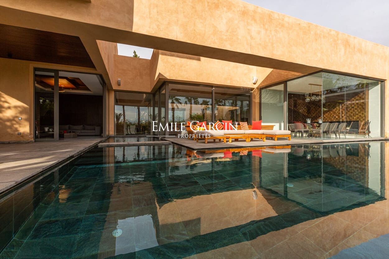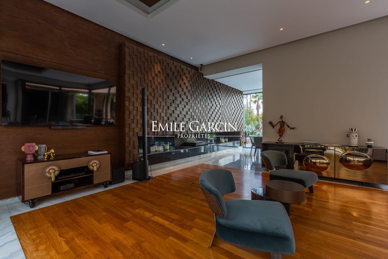 Beautiful modern villa in an idyllically located gated development, just 15 minutes from Marrakech. The property presents four spacious suite (sleeping eight people), a large and bright living room with fireplace and views of the gardens, and a beautiful furnished outdoor living area to enjoy the garden, the swimming pool (unheated) and hot tub. The ideal setting for a break in the company opf friends or family. Additional cleaning service: 100 EUR / stay. Minimum stay of 3 or 4 nights, depending on the season. Available from 800 EUR / night (including Moroccan breakfast).