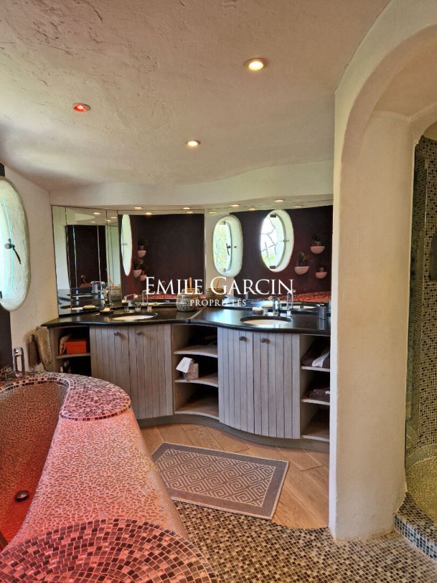 Spanning 280 m² of living space, extended by 250 m² of terraces on a landscaped 4,900 m² park, this living architectural masterpiece boldly combines raw and noble materials: sun-kissed stone, radiant marble, wrought iron, handcrafted ceramics, luminous glass, and finely sculpted copper. Every detail, conceived as an extension of Couëlle's imagination, unveils a unique visual and sensory poetry.