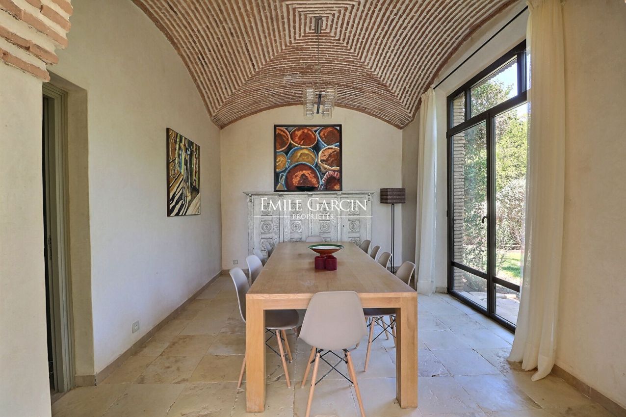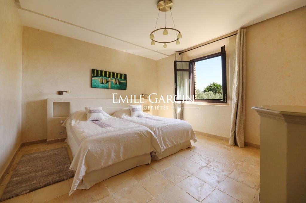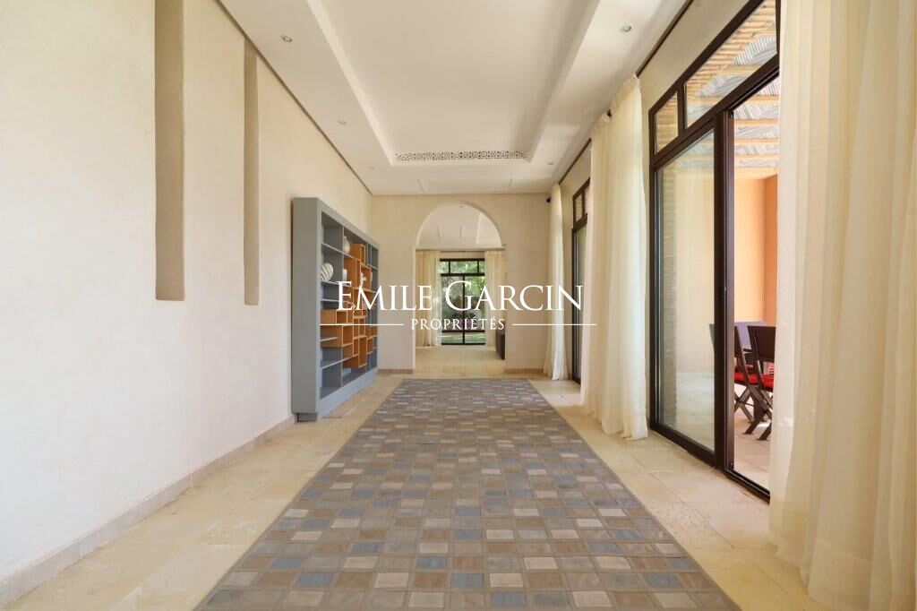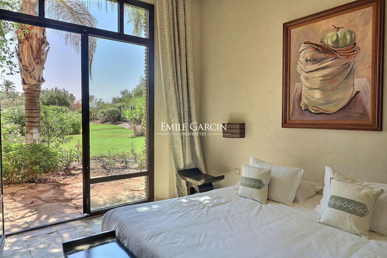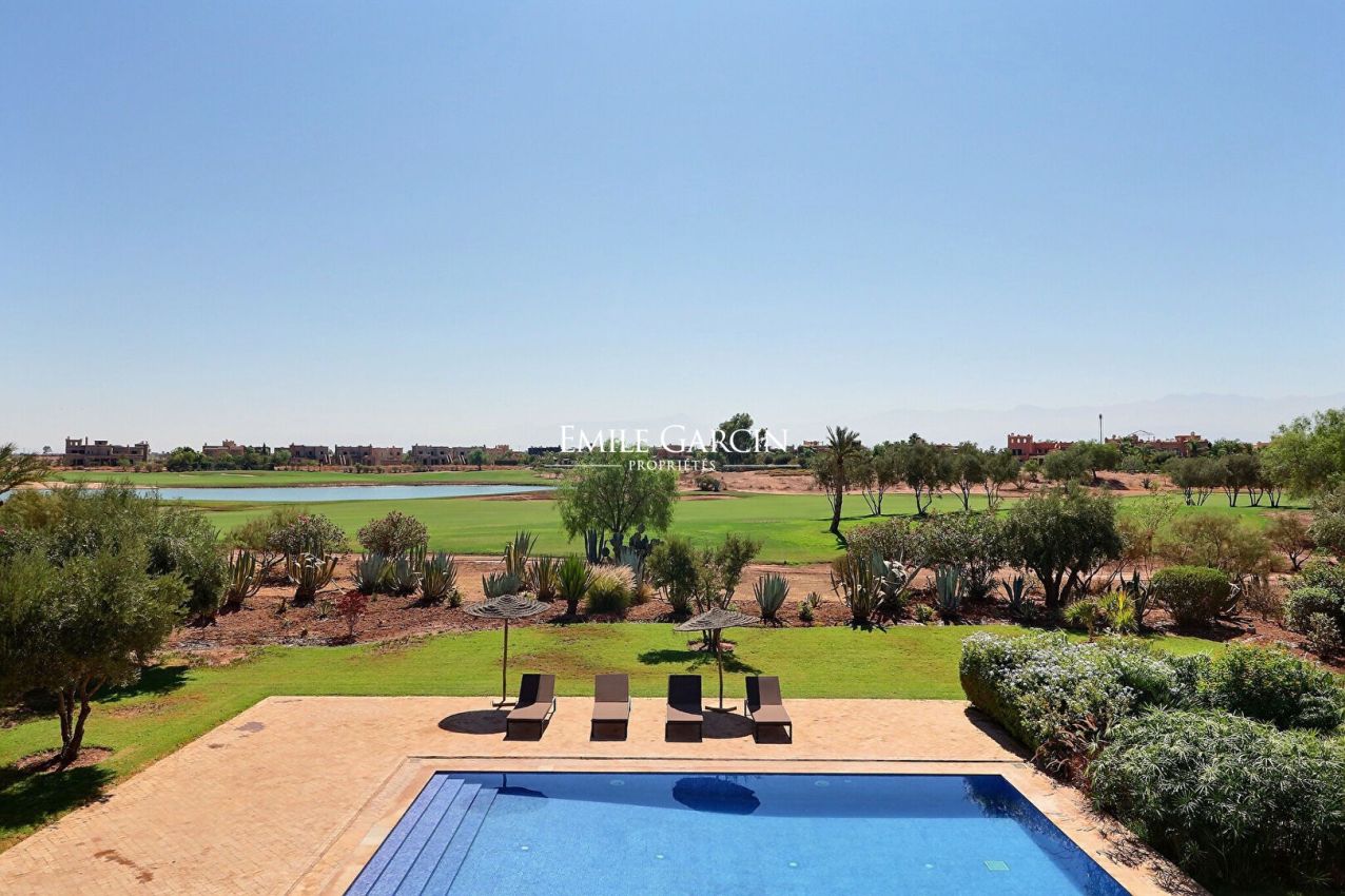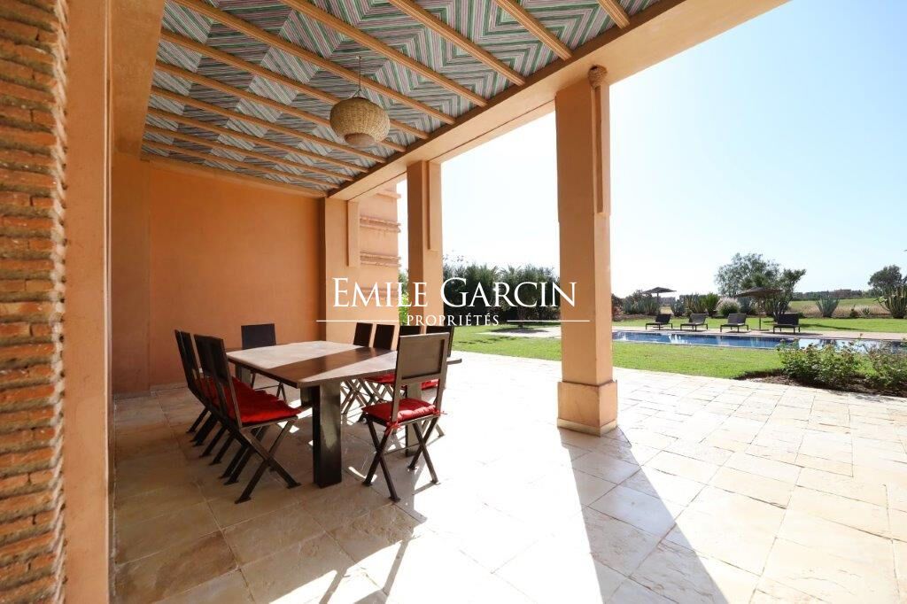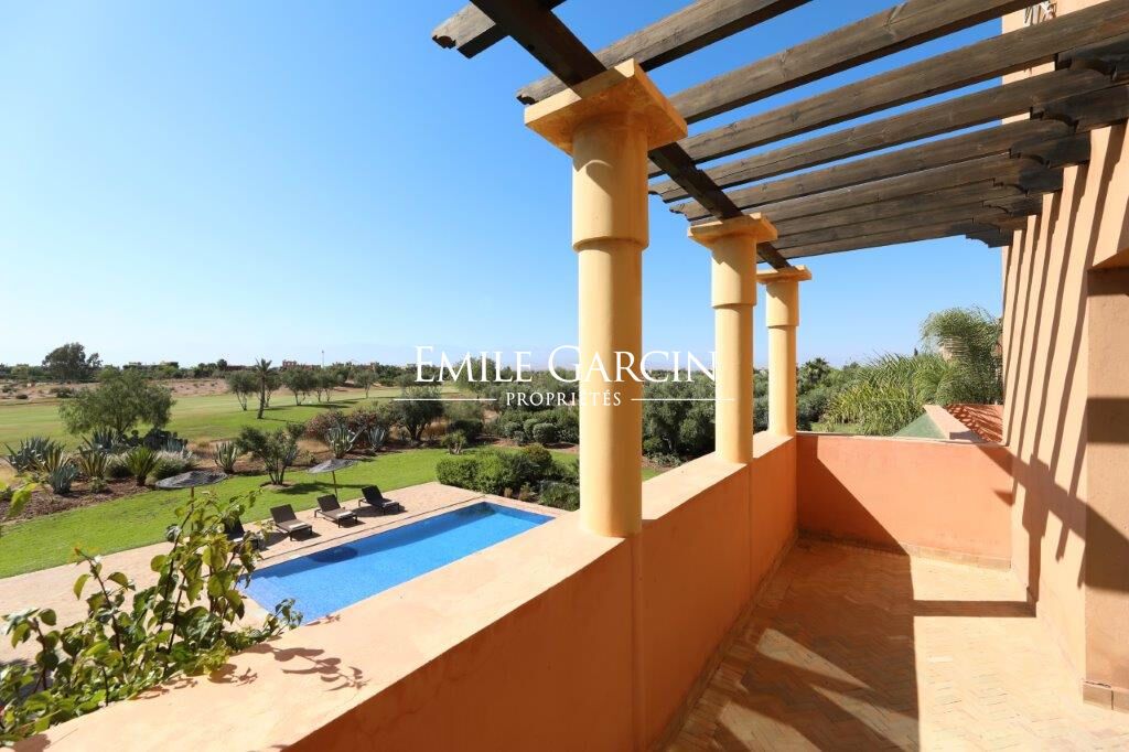 Delightful house backing onto the golf course about 20 minutes from the city centre. Living area of 510 m², on 2,130 m² of private land. On the ground floor: a beautiful living room adjoining the swimming pool, dining room, outdoor lounge, bedroom with bathroom. Upstairs: 4 bedrooms with ensuite bathrooms. Private double garage. South facing. Views of the Atlas Mountains.