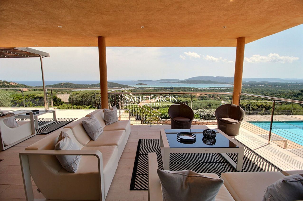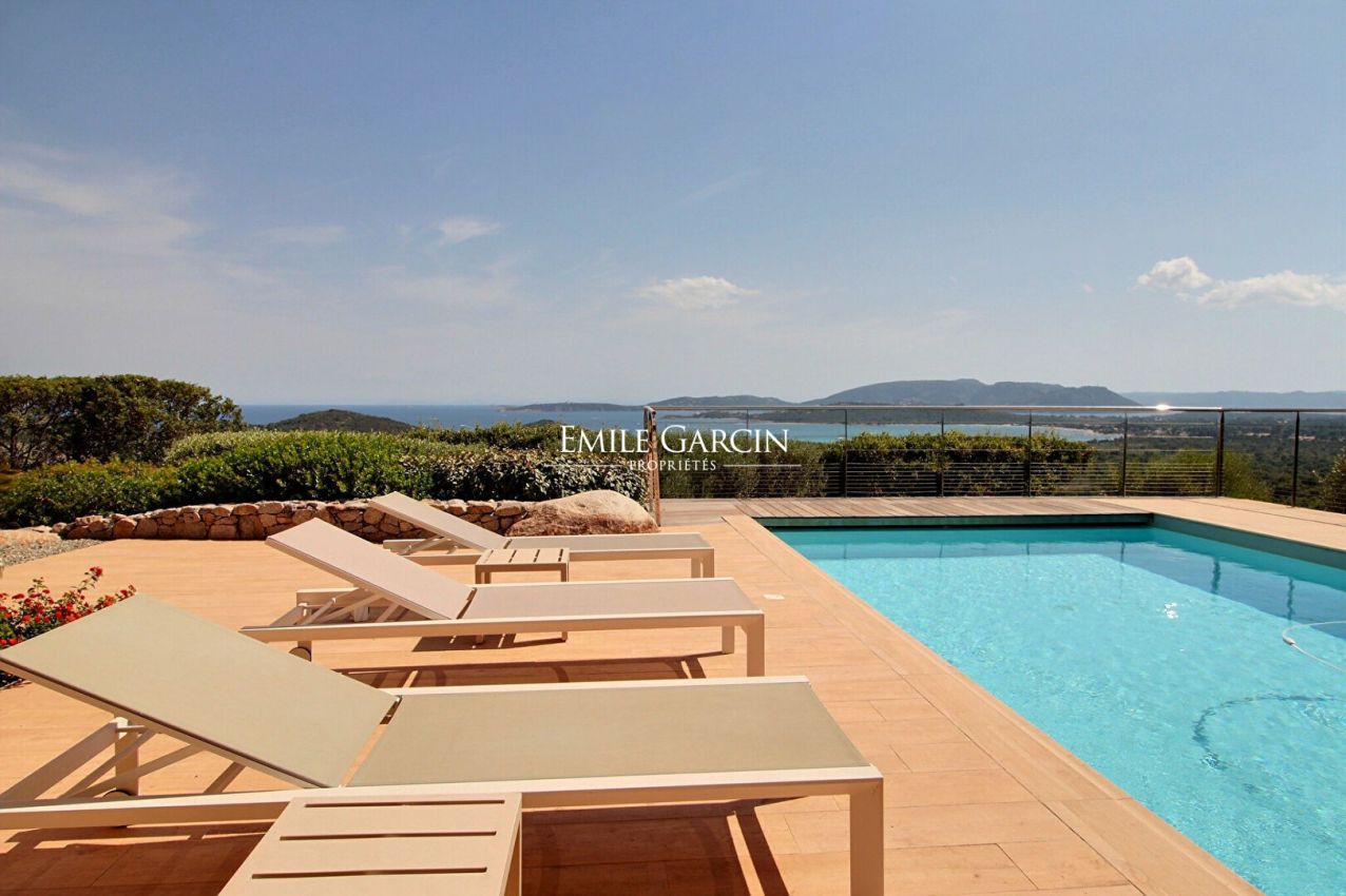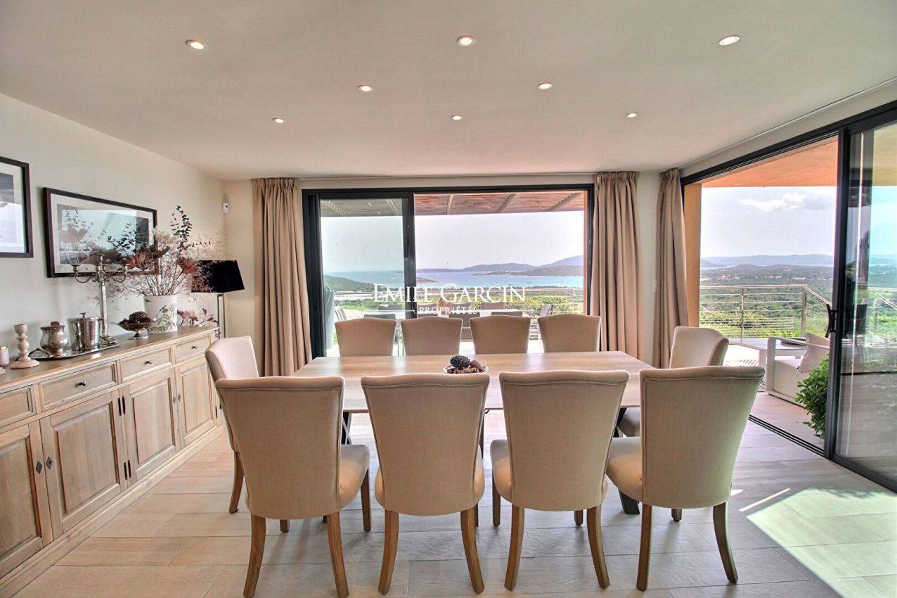 Modern property separated into two villas, located on expansive private grounds on the hillside above the Bay of St Cyprien, just a few minutes from the famous Cabanon Bleu. Superb panoramic sea views. Fully air-conditioned. 5 bedrooms and 5 bathrooms accommodating up to 10/12 people. Heated swimming pool (8 x 4.5m) secured by a shutter and equipped with an outdoor shower. Pretty garden planted with Mediterranean trees (olive trees, arbutus trees, mastic trees, etc.). St Cyprien Beach/Le Cabanon Bleu: 10 mins. Figari Airport: 45 mins. Pinarello: 15 mins. Porto-Vecchio: 25 mins. The villa opens with a beautiful living area with large windows offering a superb panoramic view of the bay. It comprises a lounge area with fireplace and TV, a dining room area, a fully equipped kitchen and a utility room (two refrigerators, freezer, washing machine, dryer etc.) On the first floor, you will find: Bedroom 1: 160 cm double bed, bathroom with shower and toilet, TV, private furnished terrace; Bedroom 2: 160 cm double bed, bathroom with shower and toilet, TV, private furnished terrace; Bedroom 3: 160 cm double bed, bathroom with shower and toilet, TV, private furnished terrace. At the basement (swimming pool) level, there is: Bedroom 4: family room equipped with a 160 cm double bed, a bunk bed, a bathroom with shower and toilet, TV and pool access. Accessed via the garden, a small studio comprises a lounge area with sofa and TV, an equipped kitchen, one bedroom and a bathroom with shower and toilet. This property has all the comfort and amenities required for a memorable holiday among friends or family.