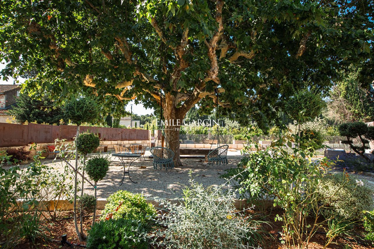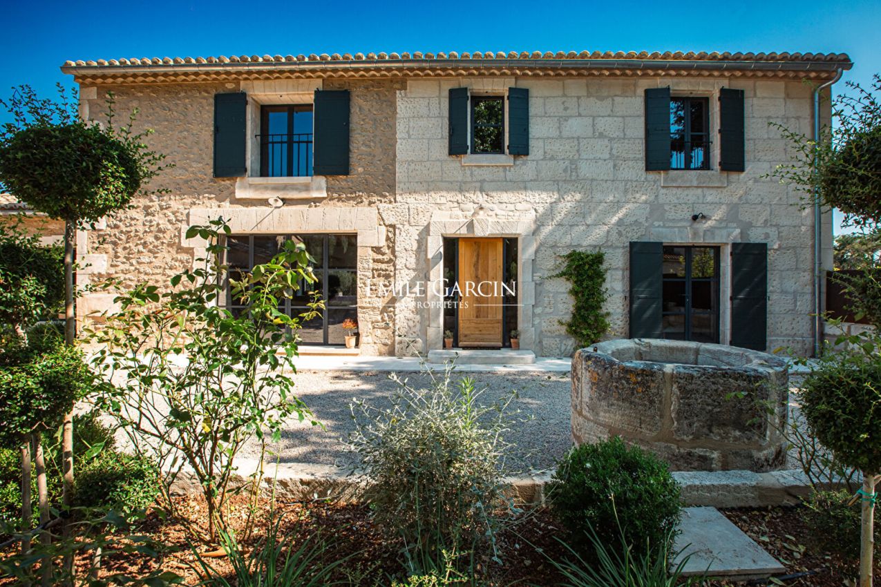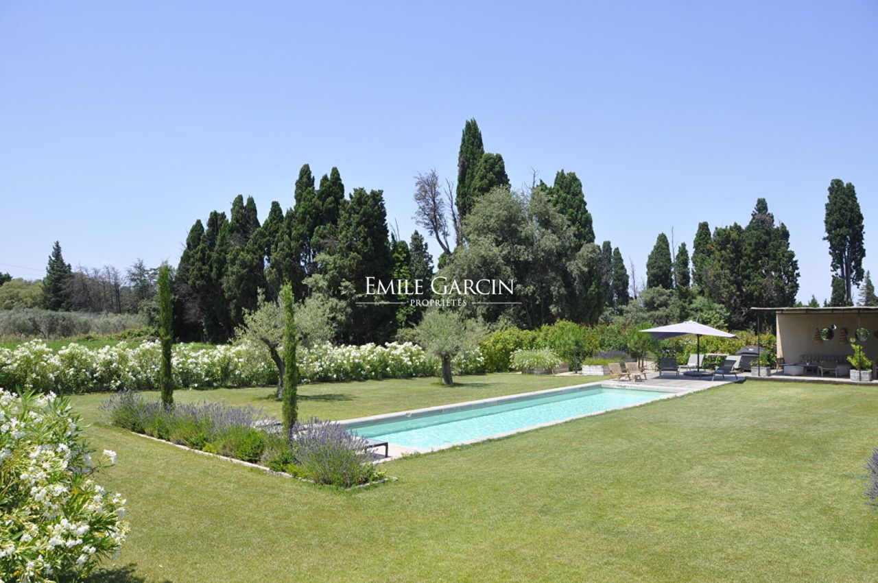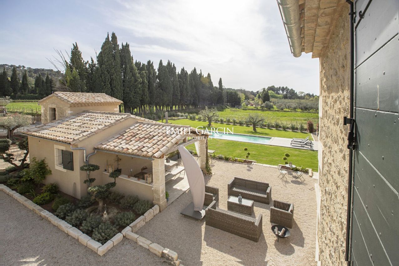 Located in the countryside surrounding Saint-Rémy-de-Provence, this fully air-conditioned farmhouse has been renovated with much taste. It presents approximately 290 sq.m of living area and a garden of 8000 sq.m equipped with a heated swimming pool (15 x 4m) protected by a roller shutter. Five bedrooms (including a child's bedroom) and five bathrooms. An oasis of calm in Provence.