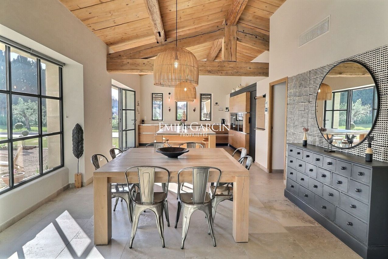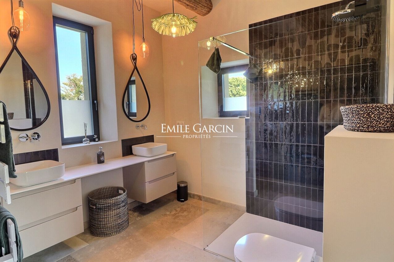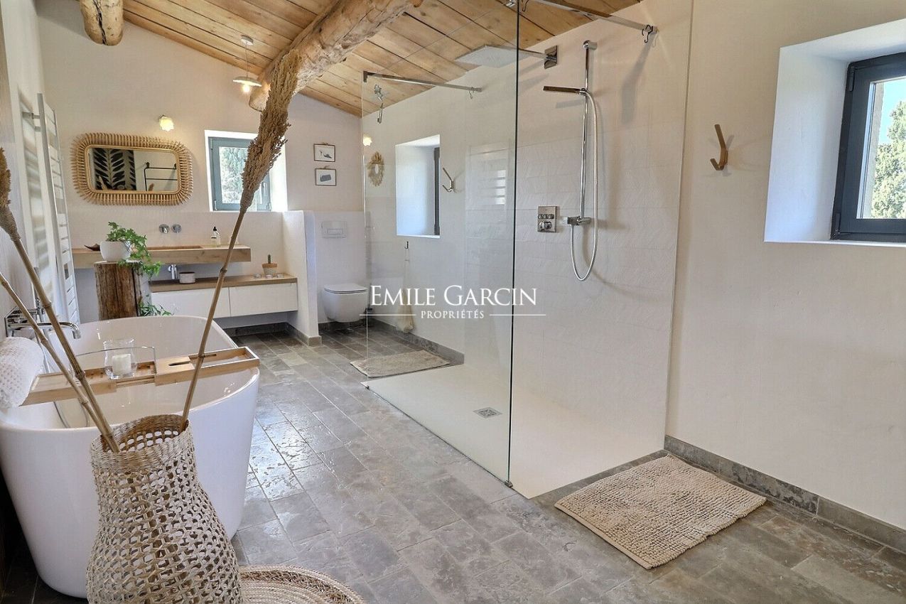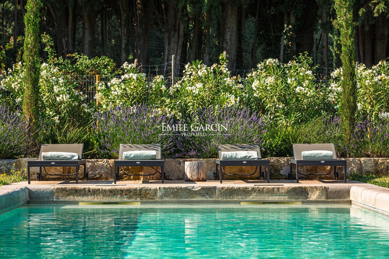 Located in the countryside surrounding Saint-Rémy-de-Provence, this fully air-conditioned farmhouse has been renovated with much taste. It presents approximately 290 sq.m of living area and a garden of 8000 sq.m equipped with a heated swimming pool (15 x 4m) protected by a roller shutter. Five bedrooms (including a child's bedroom) and five bathrooms. An oasis of calm in Provence.