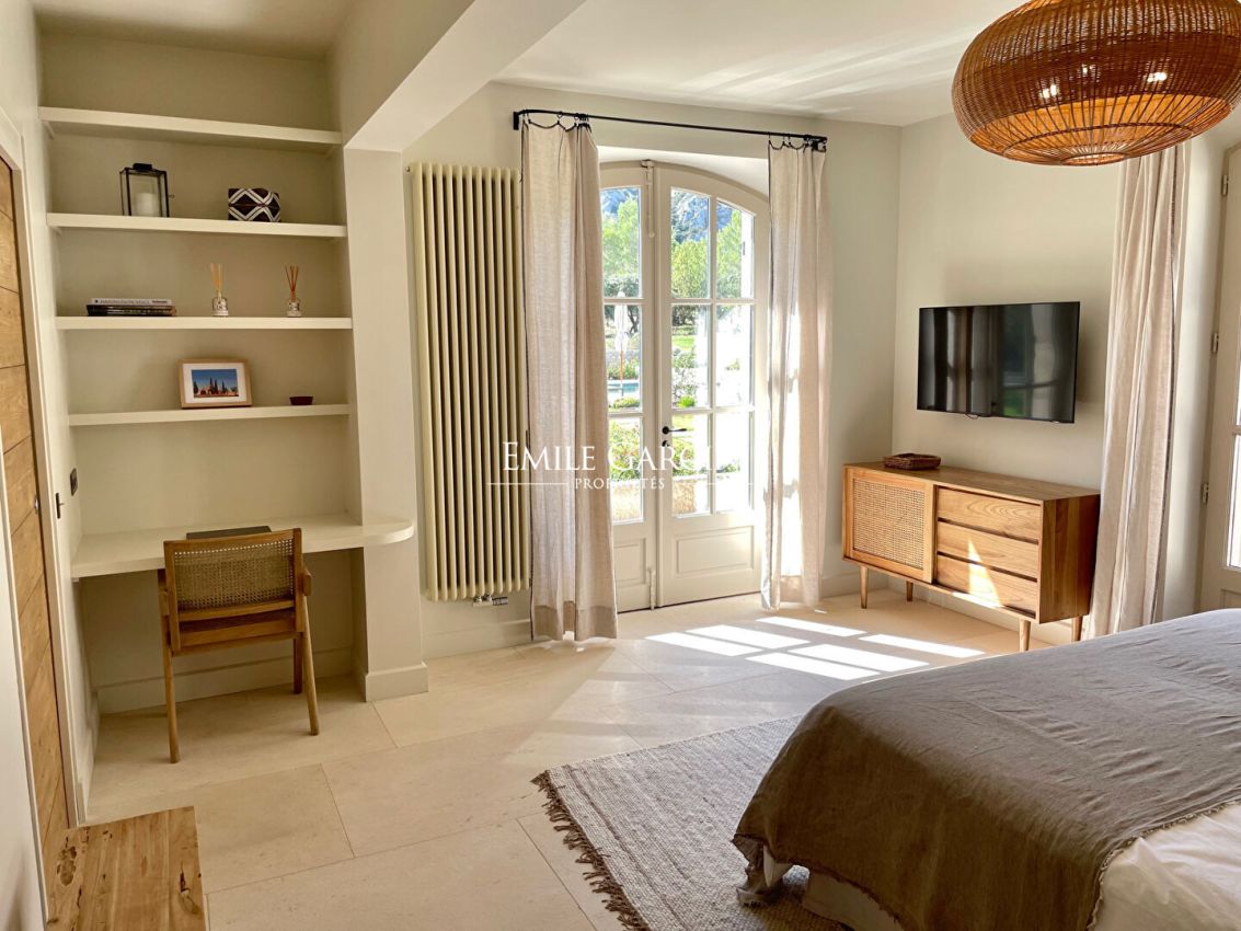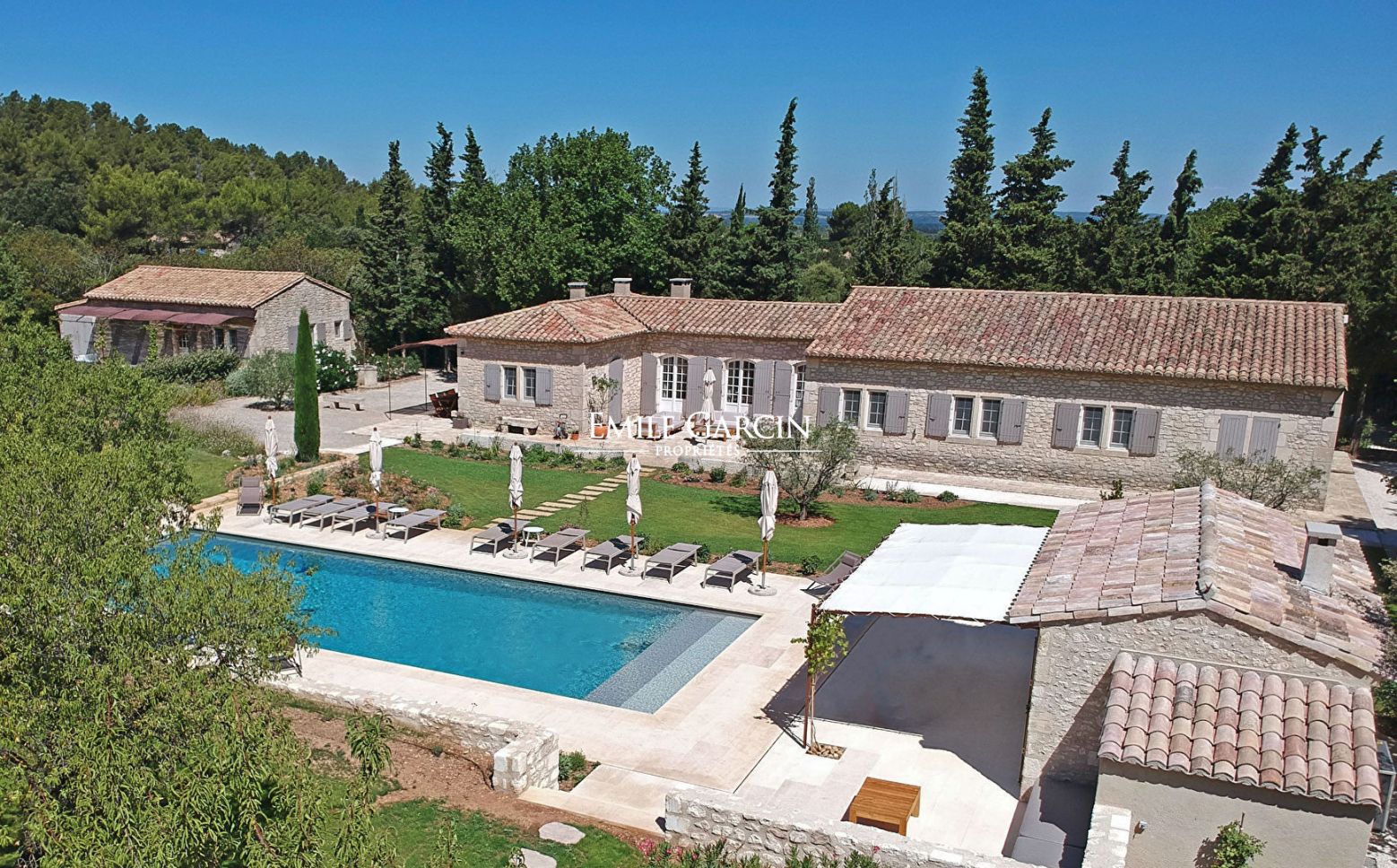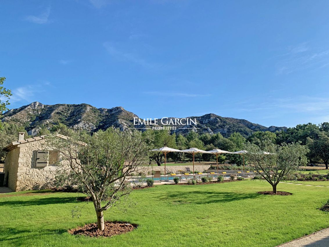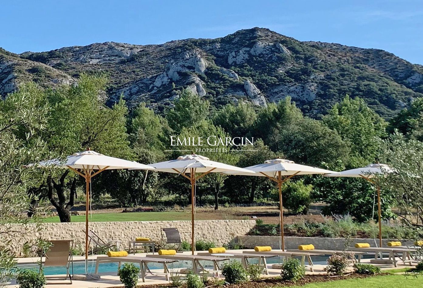 At the foot of the Alpilles, in a peaceful setting, this fully restored farmhouse offers a spectacular view. 6 air-conditioned bedrooms 2 of which are in a separate annexe and 4 bathrooms. Heated saltwater pool 15 mx 6 m secured by an electric cover. Pool house. Fitness room.