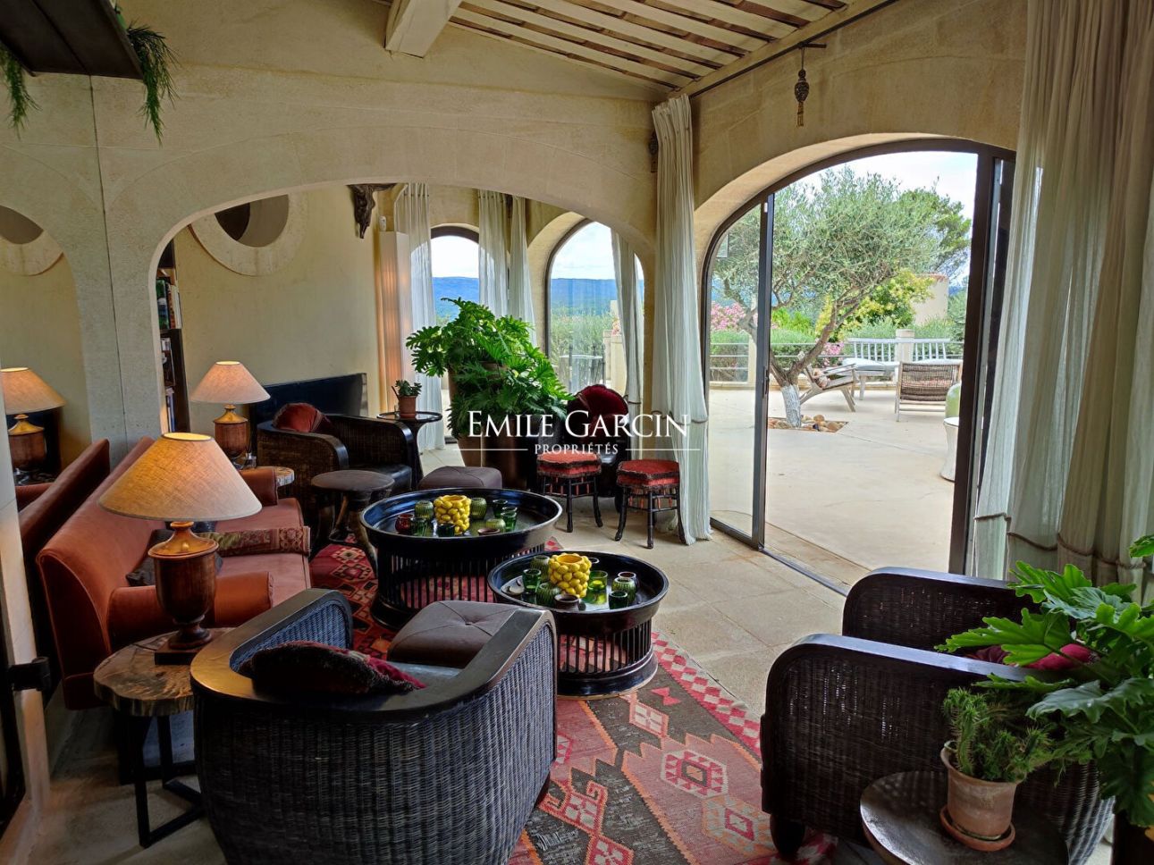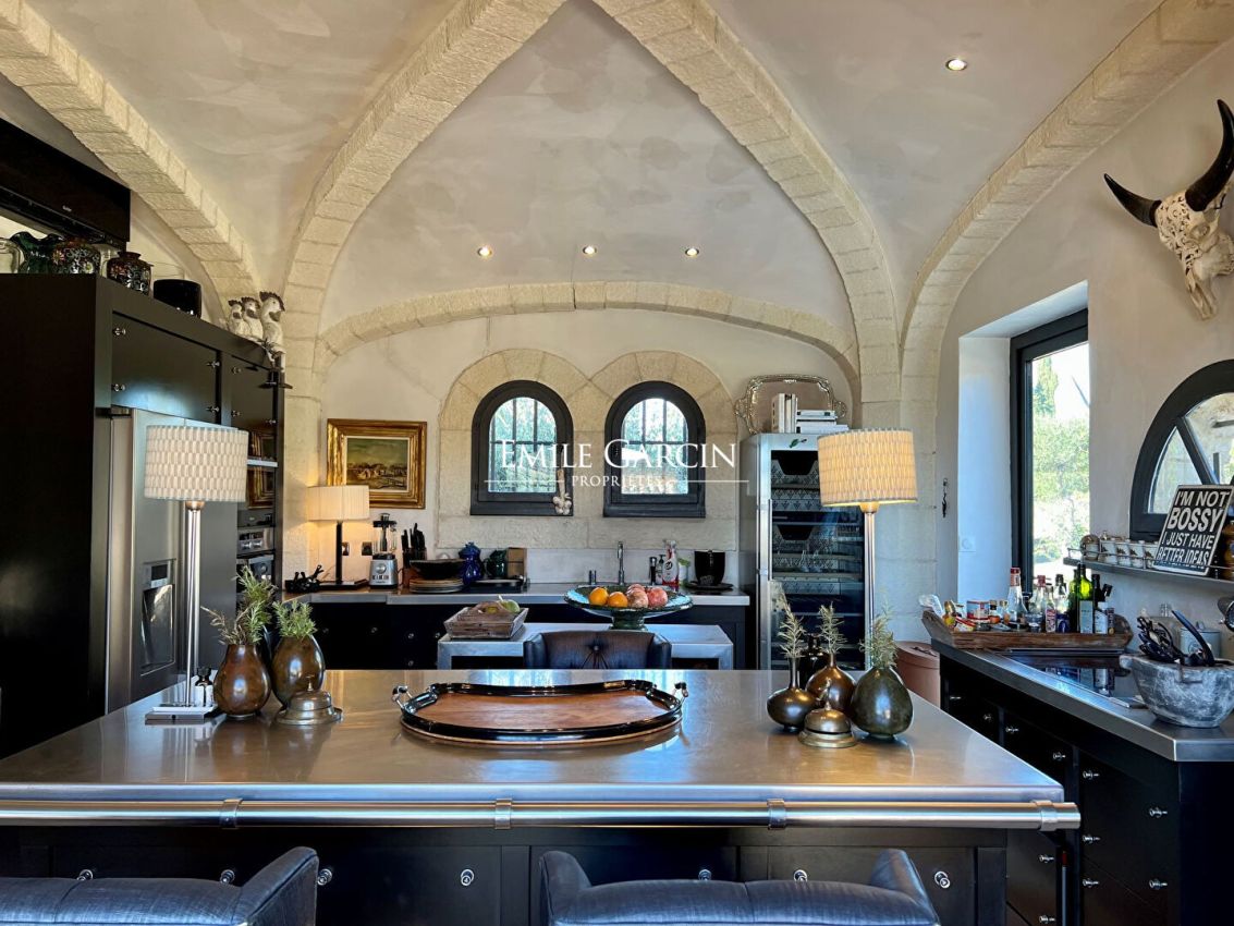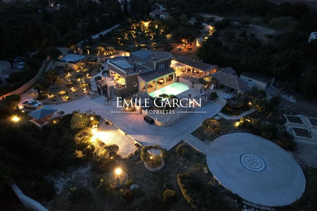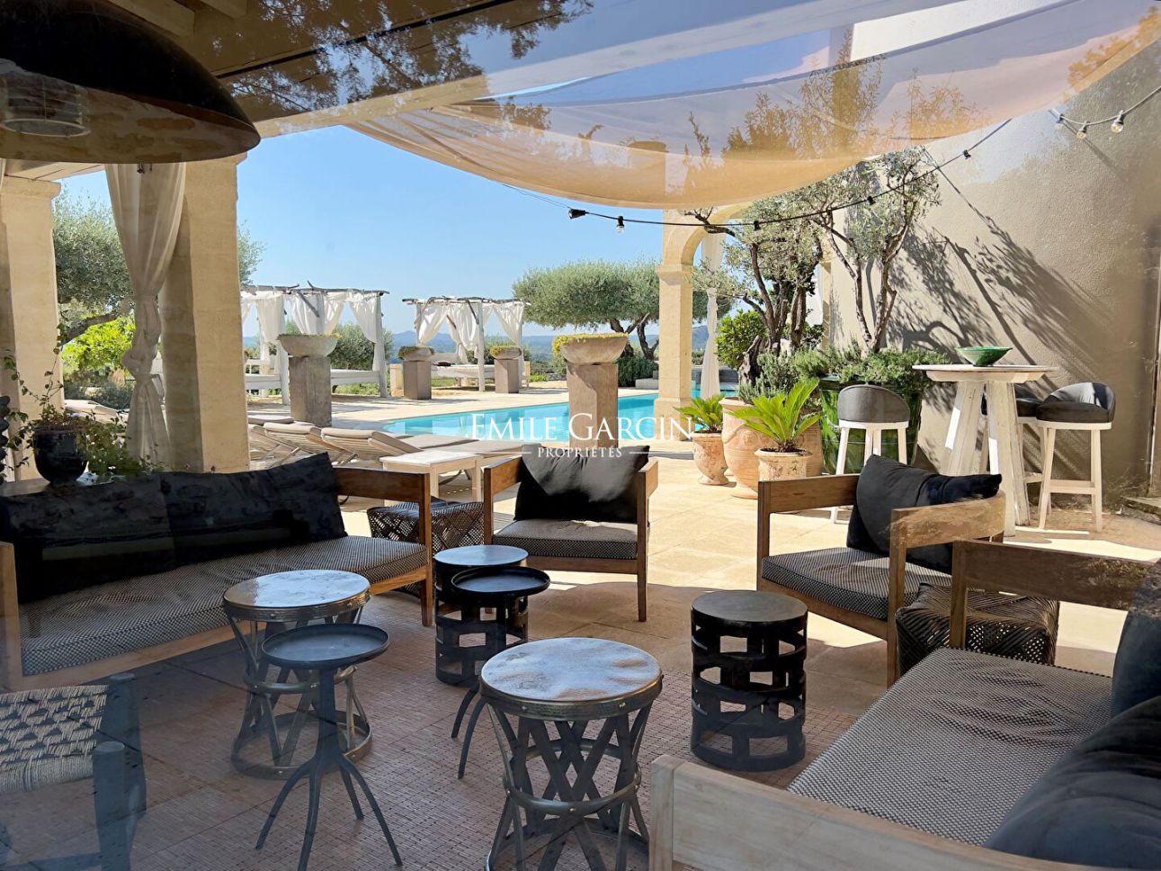 Located in a typical local village just 10 minutes from Uzès, this exclusive villa boasts a breathtaking view of the Pont du Gard from its immense terrace. It presents 300 sq.m of living area comprising seven bedrooms with air conditioning and private bathrooms, a living room backing onto the patio, a dining room, a main kitchen, an indoor bar/cafe area and a veranda. Outdoors, you will find a terrace with bar and BBQ, a swimming pool (11 x 5m), a hot tub, a hammam, a pétanque area and a helicopter landing pad. It all sits on a hectare of land featuring olive trees, lavender bushes and a vegetable garden. Daily laundry and breakfast service. 15 people maximum. Available all year round. Please enquire directly about the possibility of using the property for your events.