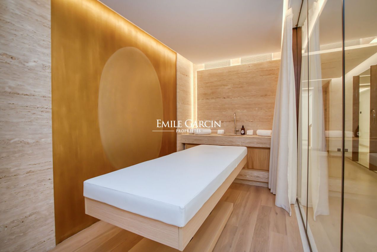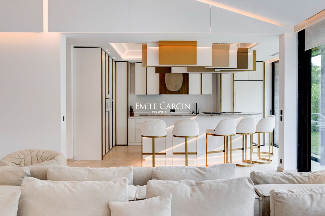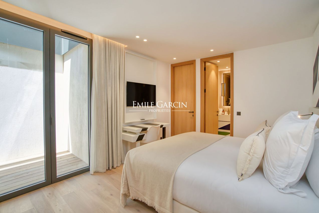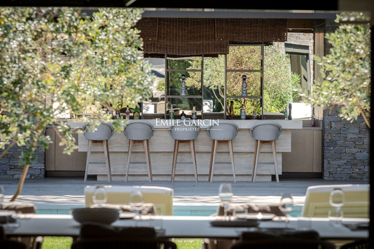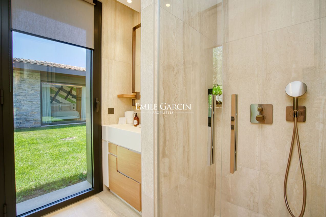 Brand new property presenting 450 sq.m of living area, idyllically located 10 minutes by foot from Pampelonne beach. 8 bedrooms, 8 bathrooms. Heated swimming pool (13 x 5m). Pool house with bar. Petanque area. Ping-pong table. Wine cellar. Home gym. Massage room. Hammam. Numéro d'enregistrement : 83101 000739 2R