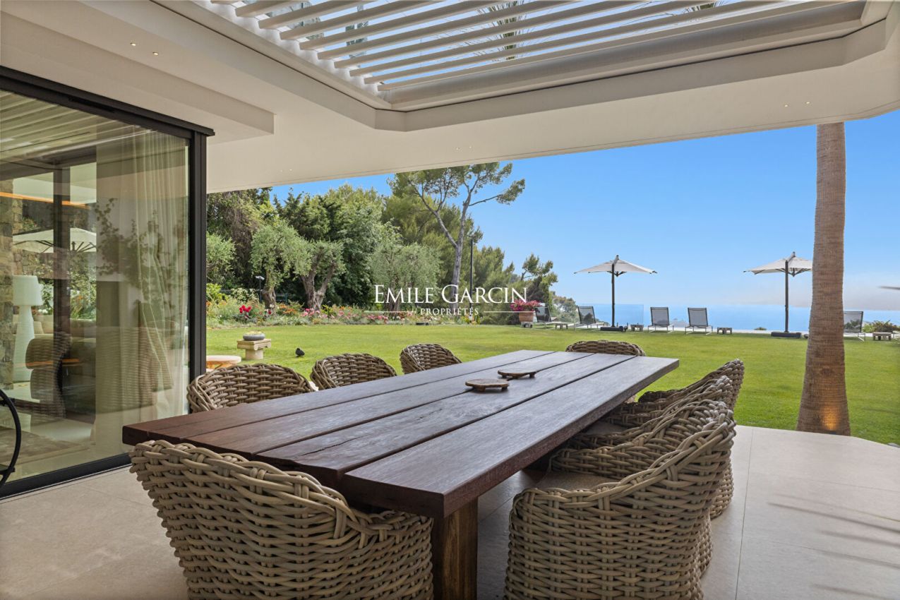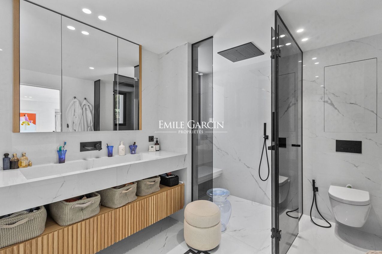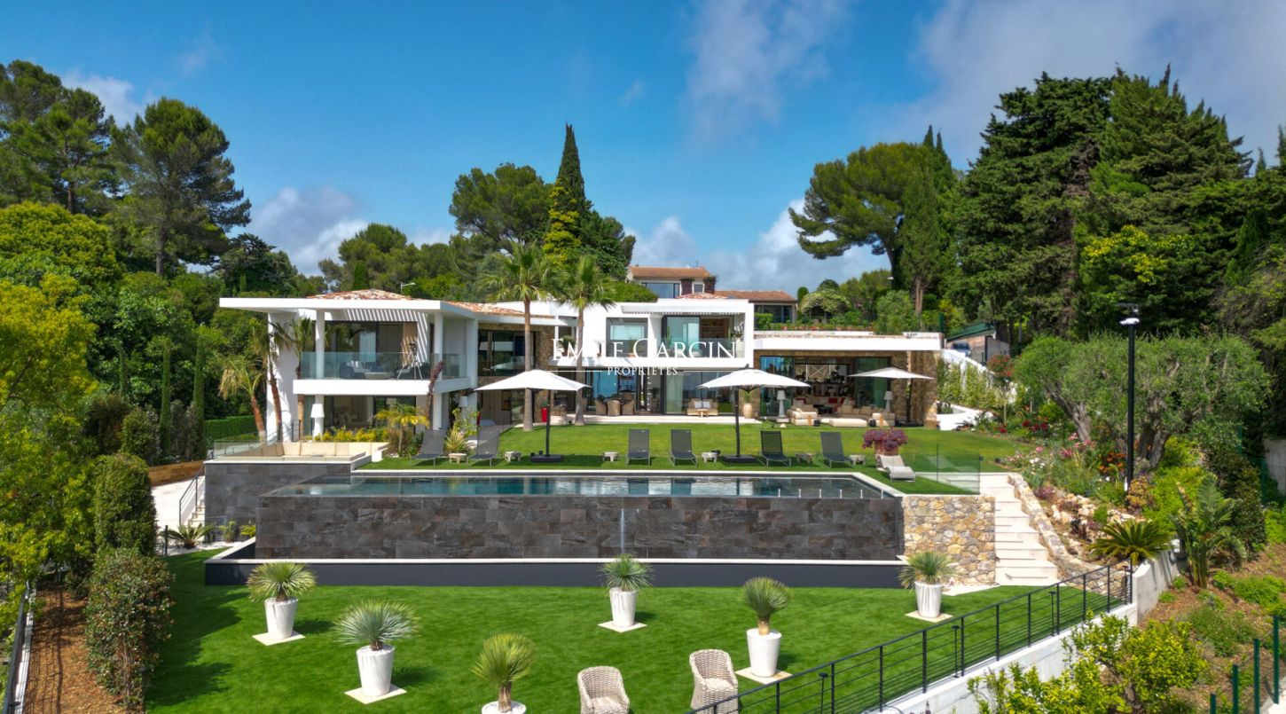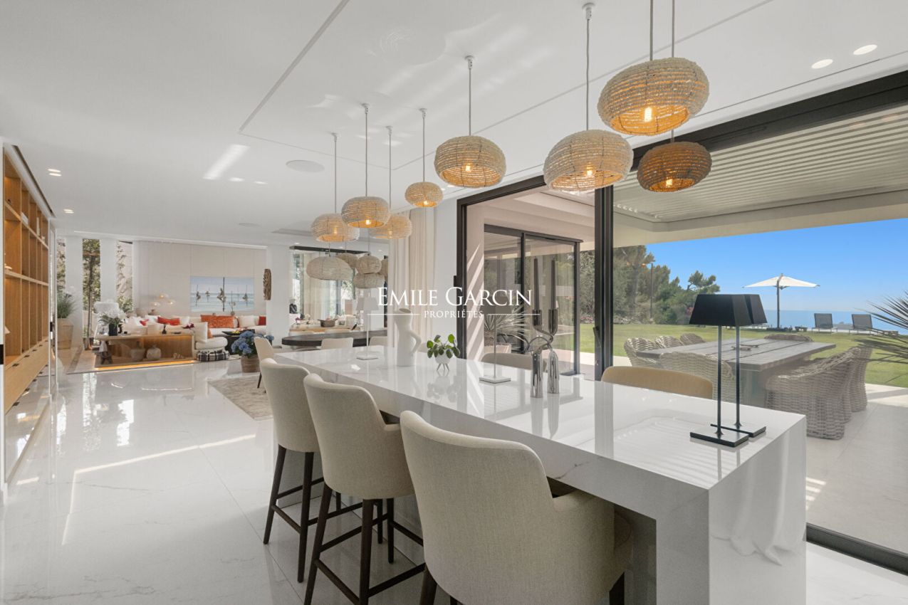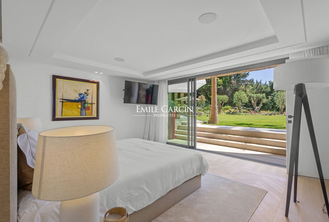 Le jardin orné d'essences méditerranéennes accueille une grande piscine, de nombreux salons extérieurs, des espaces repas, transats et parasols. Plusieurs places de parking complètent cette propriété ultra-sécurisée équipée de domotique.