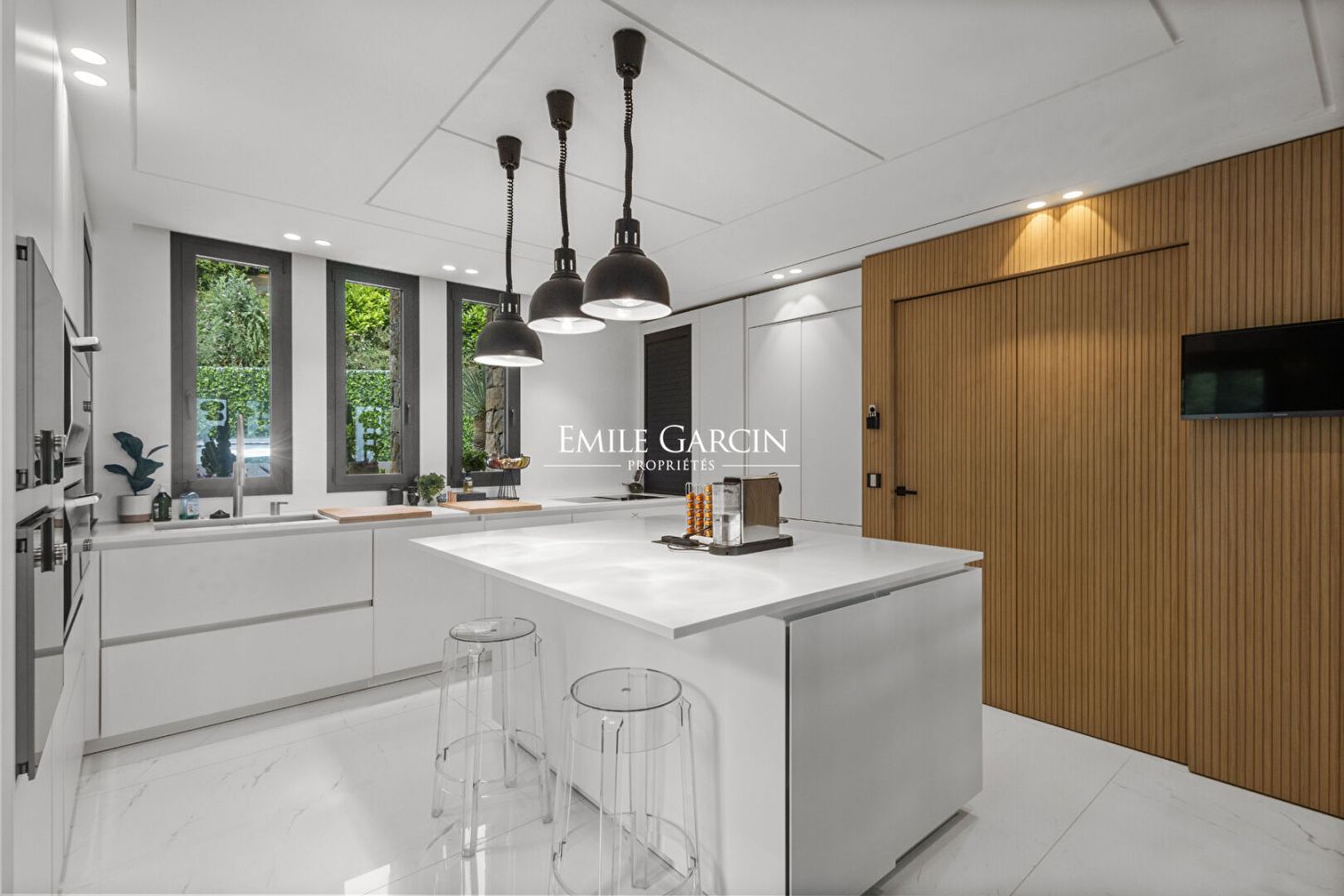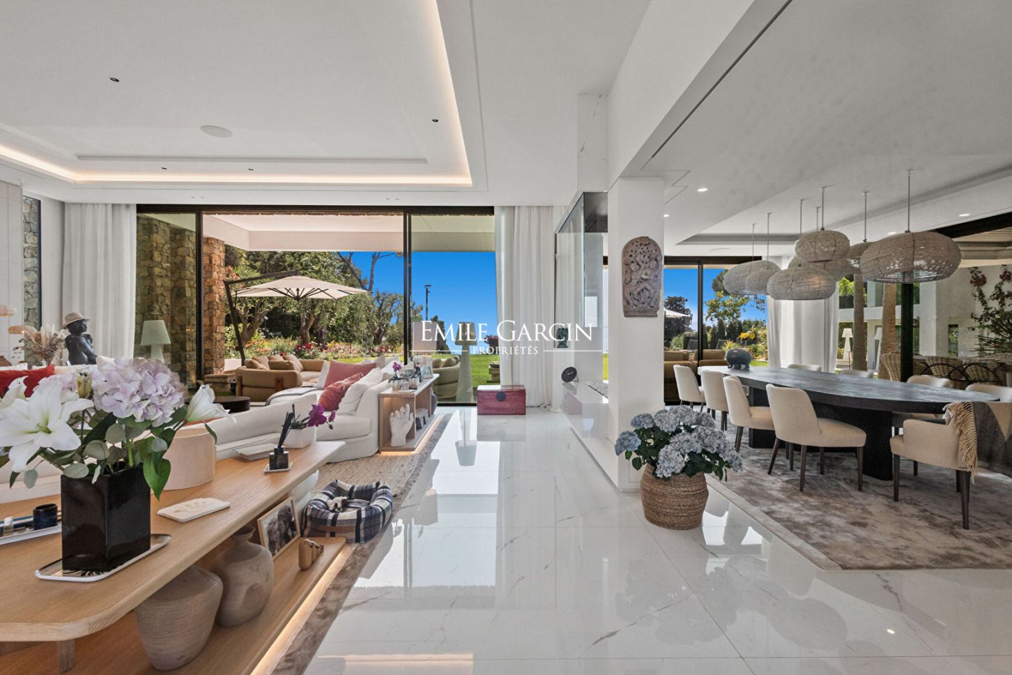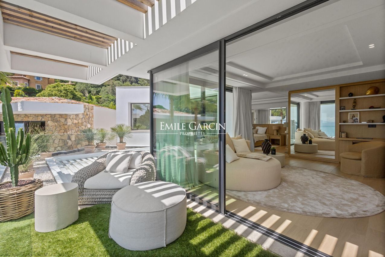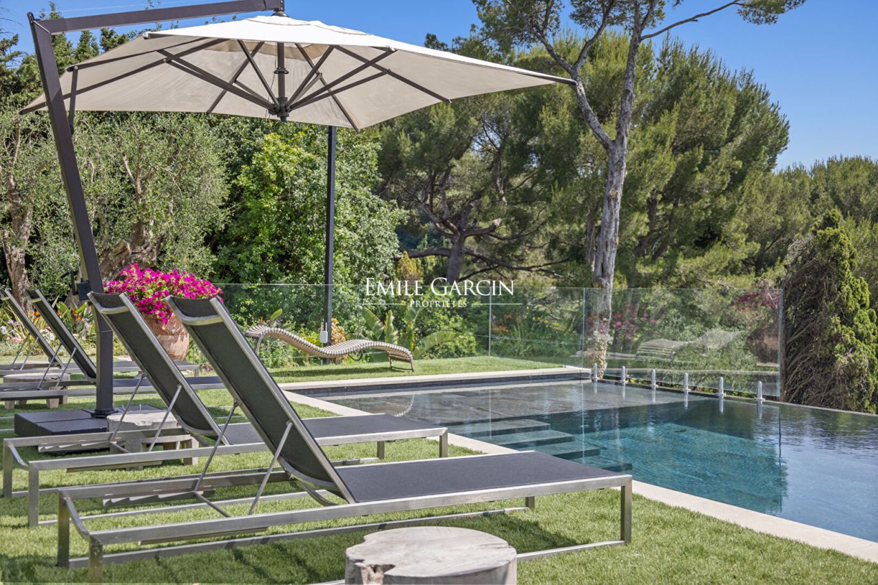 Le jardin orné d'essences méditerranéennes accueille une grande piscine, de nombreux salons extérieurs, des espaces repas, transats et parasols. Plusieurs places de parking complètent cette propriété ultra-sécurisée équipée de domotique.