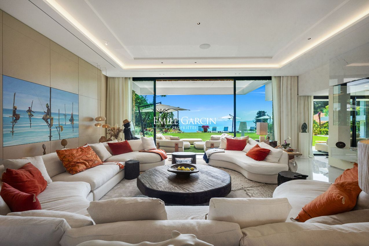 Le rez-de-chaussée accueille un vaste séjour lumineux avec salle à manger et cuisine entièrement équipée, le tout ouvert sur la Méditerranée. Un ascenseur dessert tous les niveaux. L'espace bien-être au niveau inférieur comprend une salle de sport, un sauna, un hammam et une salle de cinéma privée.