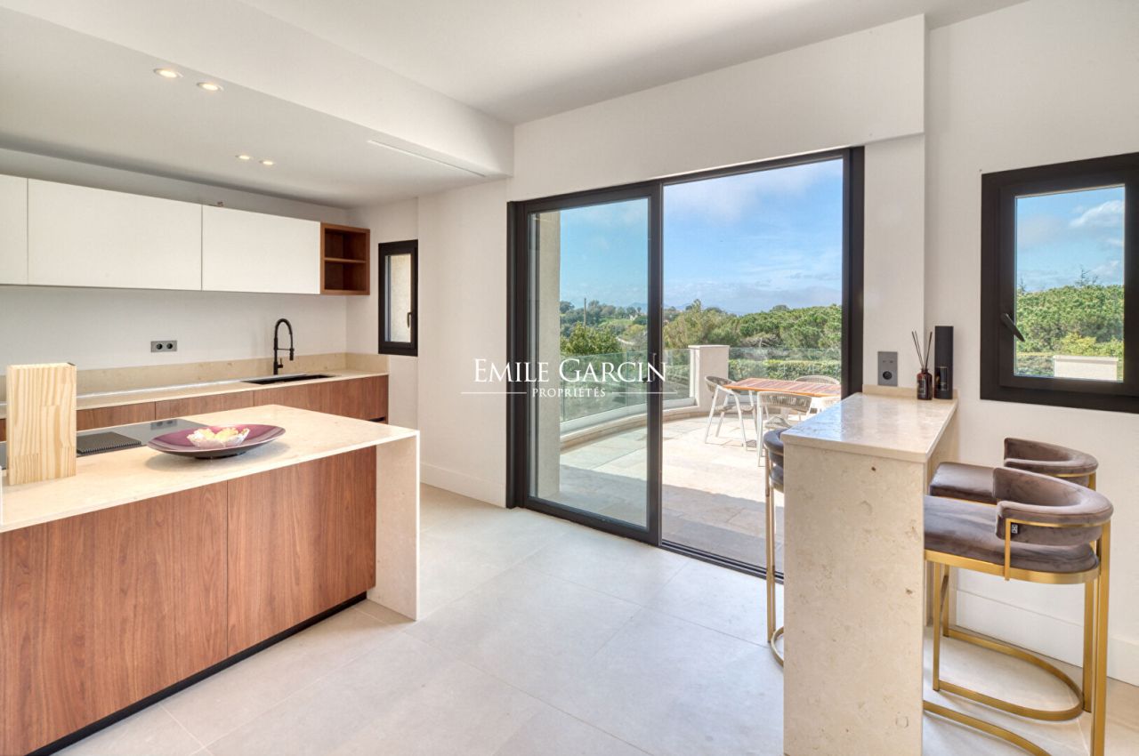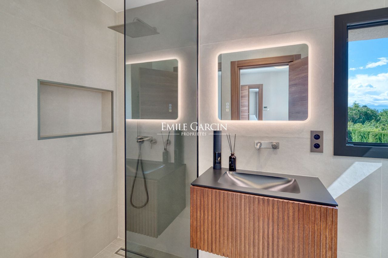 Les espaces de réception, très lumineux, s'ouvrent largement sur les extérieurs et offrent une magnifique vue mer et collines. La propriété bénéficie également de nombreux équipements haut de gamme: piscine, jacuzzi, hammam, salle de sport, court de tennis privé en gazon, home cinema..