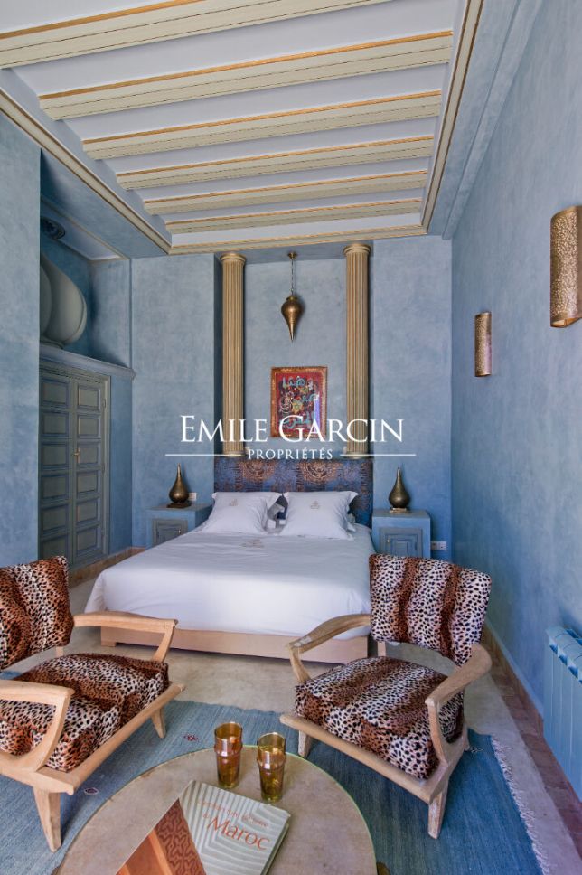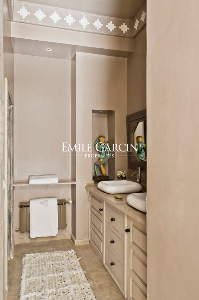 Très beau Riad d'une superficie au sol de 210 m². Superficie habitable 500 m². Riad composé d'une grande pièce de réception, salon et salle à manger. 8 chambres avec salles de bain. Grande terrasse avec Jacuzzi, espace repas et détente. Vue sur l'Atlas et le parc de l'Hôtel La Mamounia. Spa avec hammam et salle de massage.
