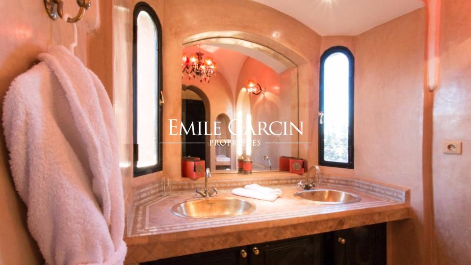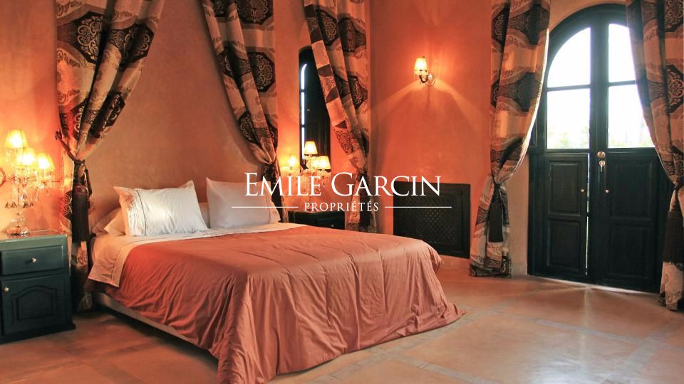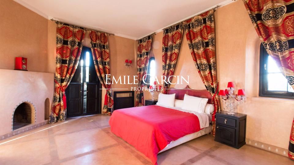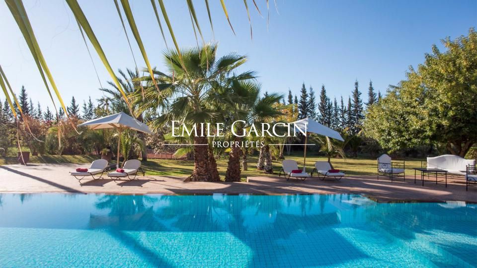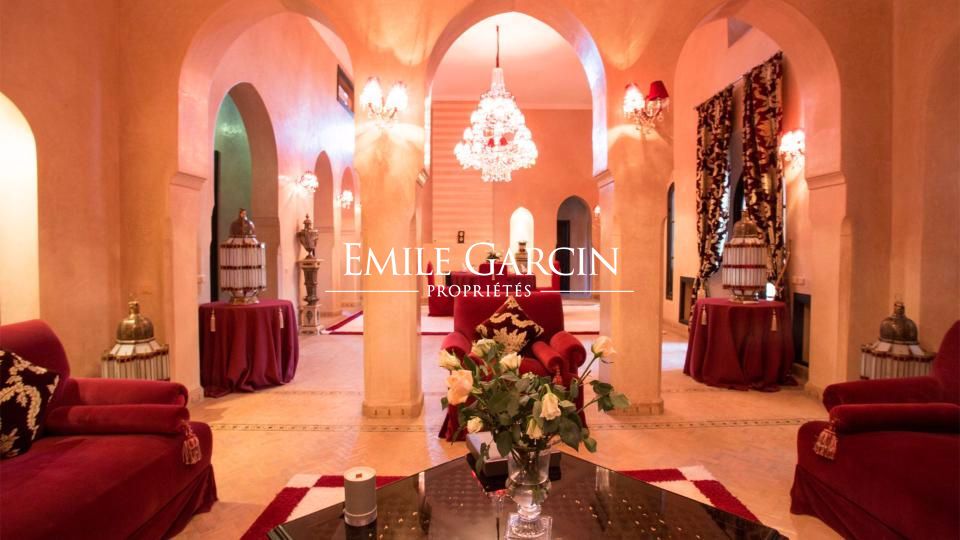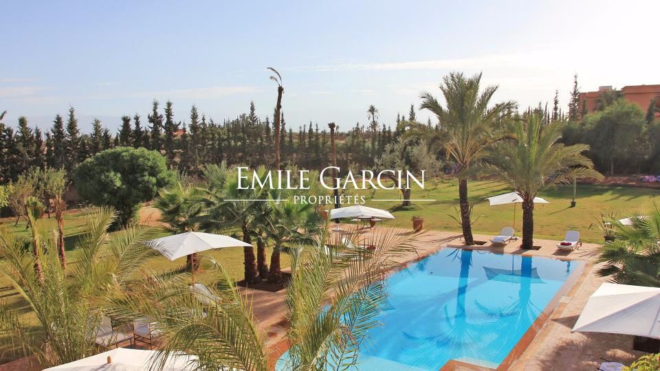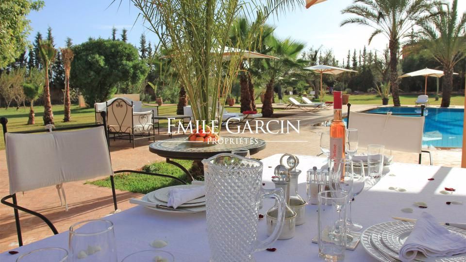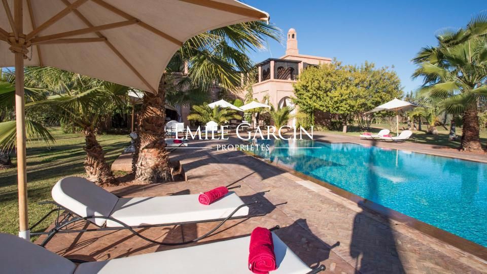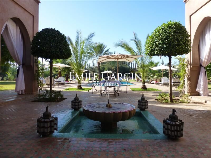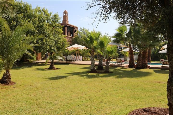 A louer propriété orientale de 800 m² dans la Palmeraie de Marrakech sur 1HA de jardin magnifiquement paysagé. Cette très belle maison bénéficie d'un confort de grande qualité, double réception, 5 chambres avec salles de bain et dressing privatifs.