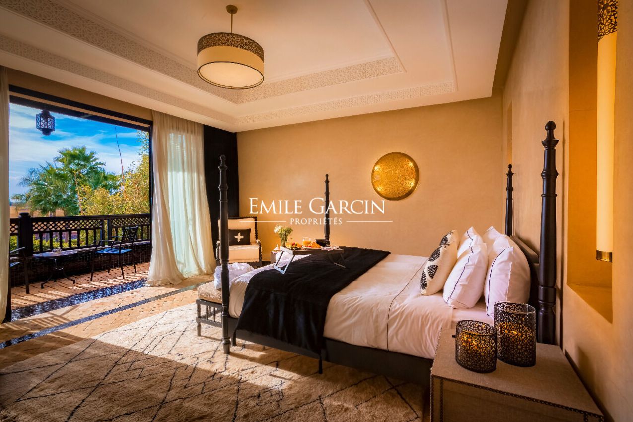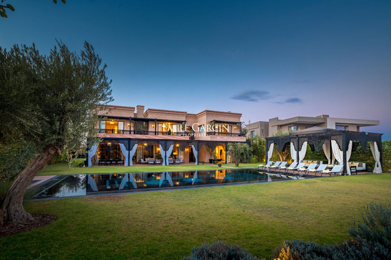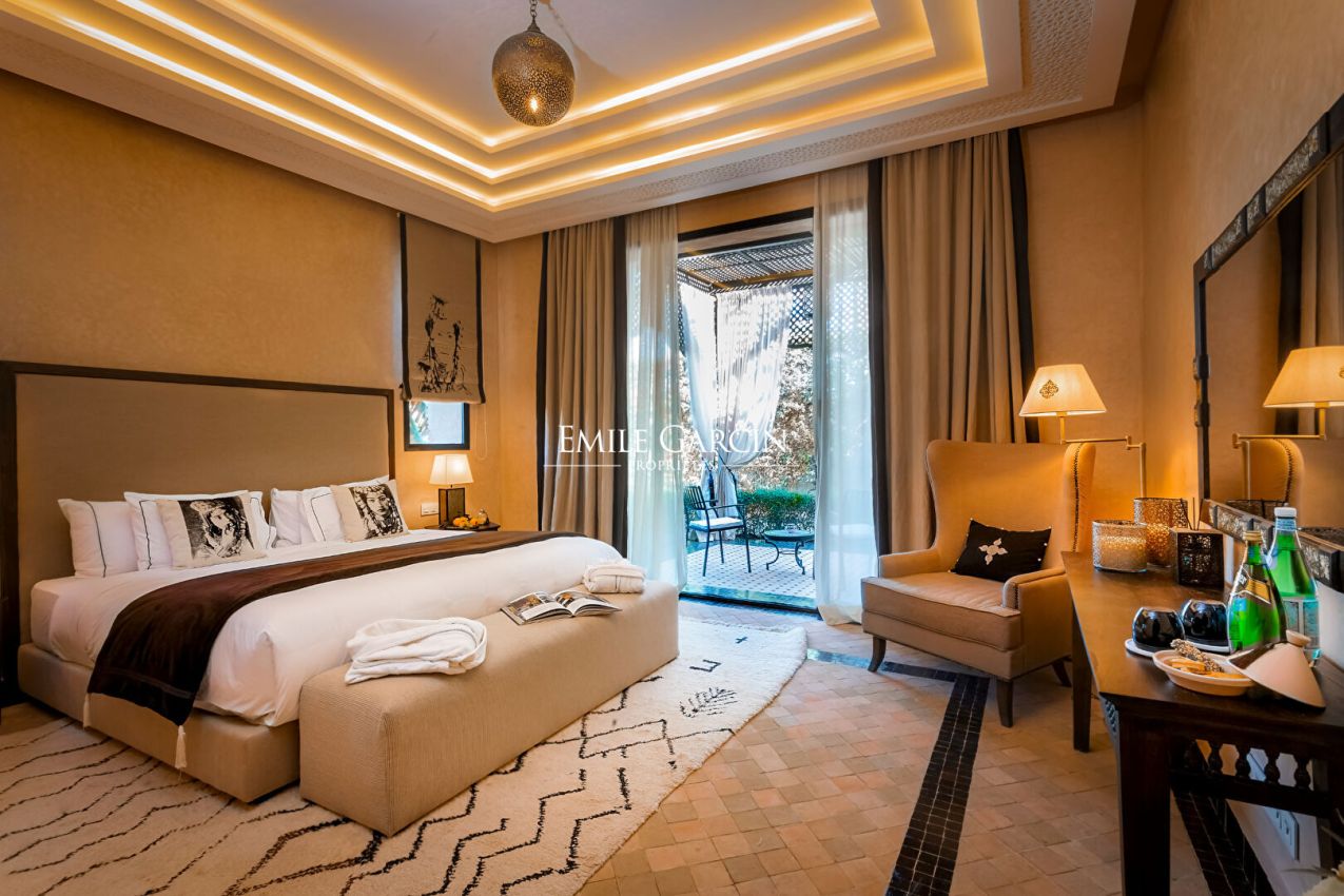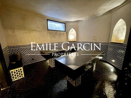 Grand double séjour avec cheminée centrale, suites spacieuses, hammam et salle de massage ; 8 chambres, 7 sont réparties entre le rez-de-chaussée et le premier étage, et la 8ème est en entresol, avec une lumière naturelle. Piscine chauffée. Décoration raffinée.