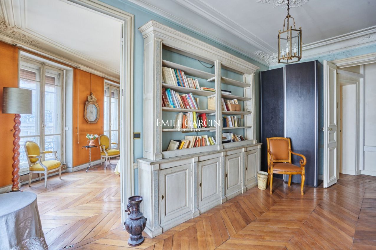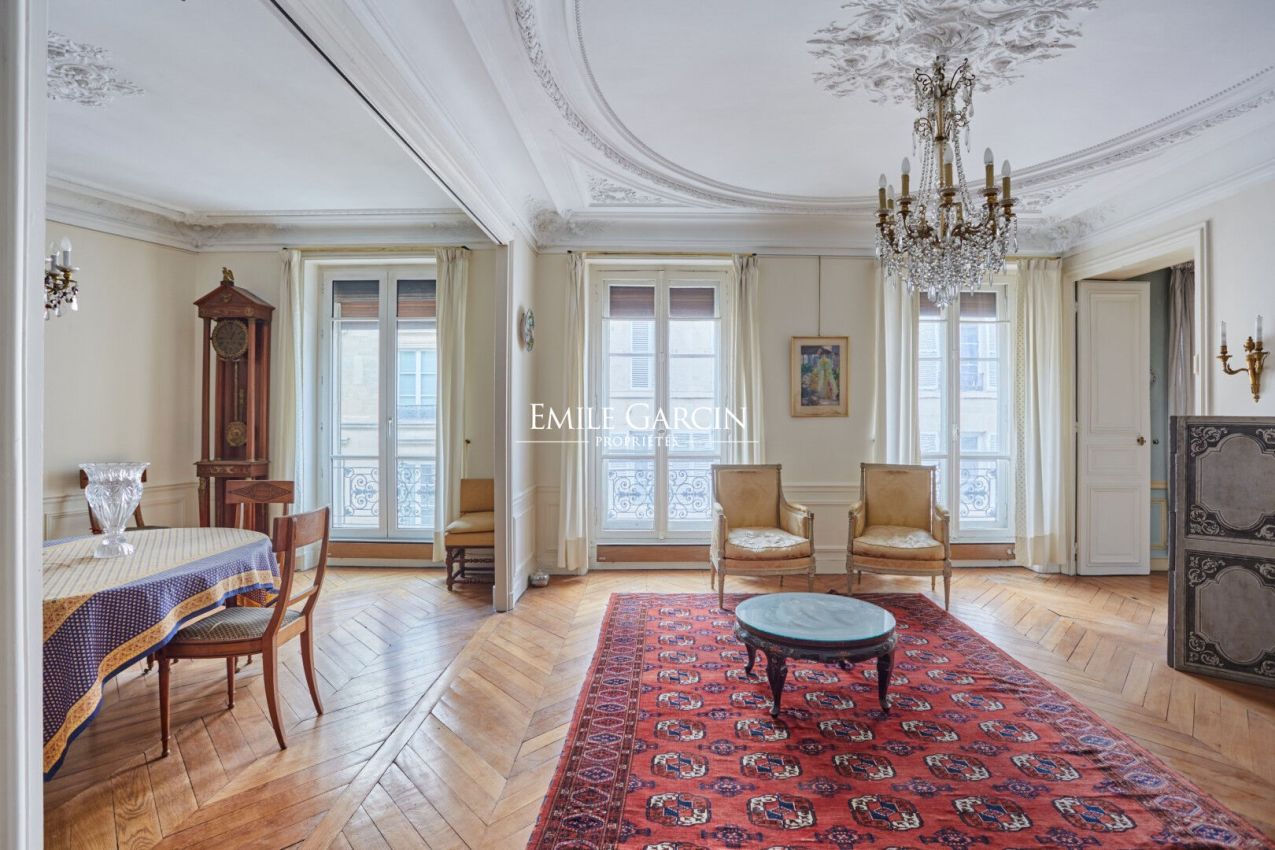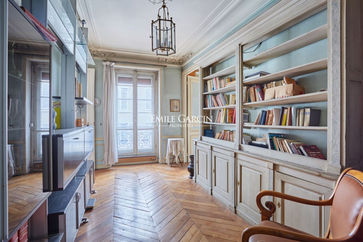 Jardin du Luxembourg - Saint Sulpice - Idéalement situé en étage élevé avec ascenseur d'un bel immeuble en pierre de taille à quelques pas du très agréable parc du Luxembourg, un bel appartement d'angle traversant de 115,31 m² loi Carrez agencé en quatre pièces principales. Il se compose d'une galerie d'entrée, un séjour, une salle à manger, une cuisine indépendante, une chambre de maître avec salle d'eau, une salle de bains, un bureau (seconde chambre possible) et des toilettes séparées. Exposé au Sud cet appartement baigné de lumière a une jolie vue dégagée. Parquet, moulures, cheminée. Une double cave en sous sol ainsi qu'une petite chambre de service au sixième étage complètent ce bel ensemble. Gardien. (5.26 % honoraires TTC à la charge de l'acquéreur.) Copropriété de 64 lots - dont 16 lots habitation. (Pas de procédure en cours).