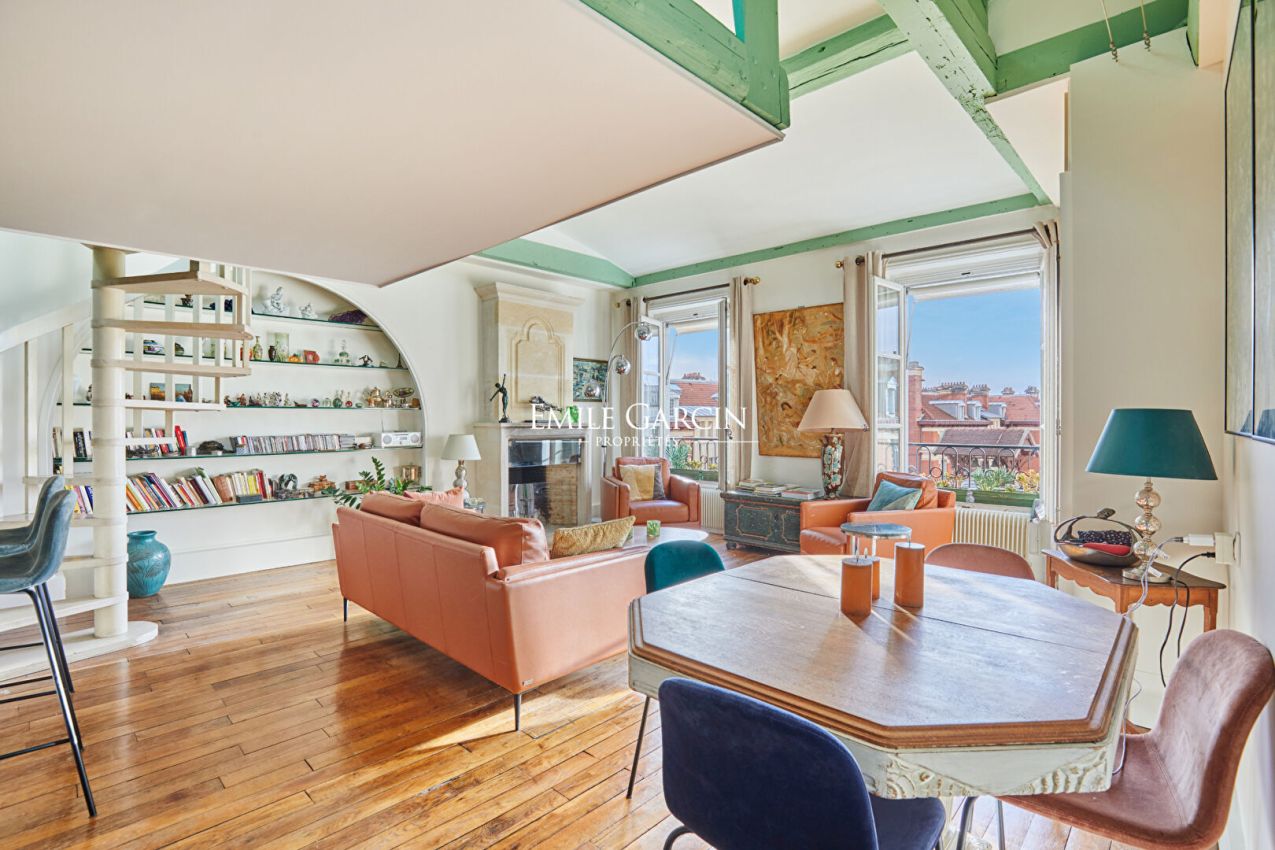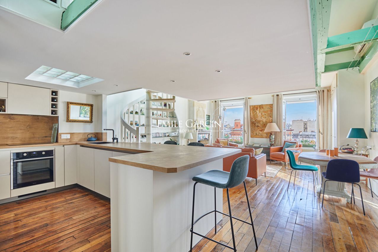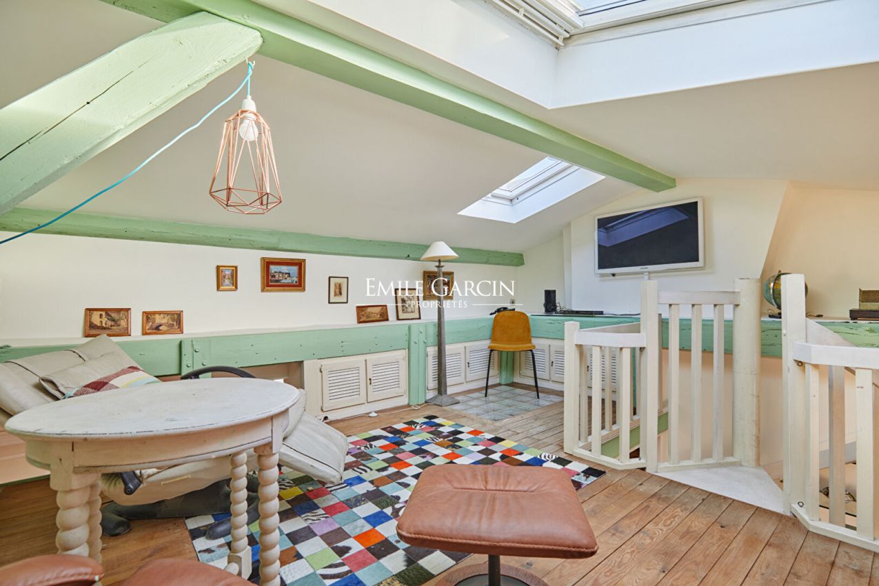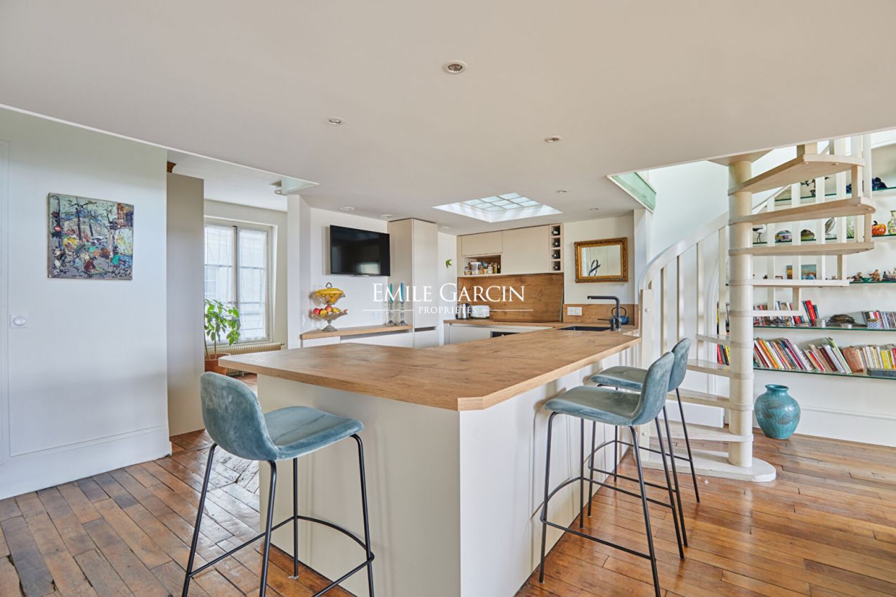 Proche place des Vosges, au dernier étage d'un bel immeuble admirablement entretenu, édifié au XVIIe siècle, se dévoile un appartement de charme et rare de 115 m² au sol (94,84m² loi Carrez), porté par un esprit de maison et une signature architecturale profondément authentique. Dès l'entrée, les volumes impressionnent avec une hauteur sous-plafond de 3,80m. Exposé à l'ouest, cet appartement climatisé possède des vues entièrement dégagées. Le magnifique séjour de 42 m² avec dans son prolongement la spacieuse cuisine dînatoire s'intègre avec harmonie. Une arrière-cuisine, une buanderie complète l'organisation. Deux chambres, dont une remarquable de 20 m². Une salle d'eau avec toilettes, une salle de douche. Nombreux rangements. En mezzanine, un salon télévision avec espace bureau. Chaque détail témoigne du soin apporté à la préservation des éléments anciens : poutres, parquet, cheminée en pierre. Une cave vient parfaire cet ensemble. A quelques pas de la mythique Place des Vosges, dans l'un des lieux les plus prisés de Paris. Une qualité de vie incomparable : commerces de bouche, galeries, terrasses élégantes et atmosphère patrimoniale d'exception. Copropriété de 40 lots - dont 19 lots habitation.
