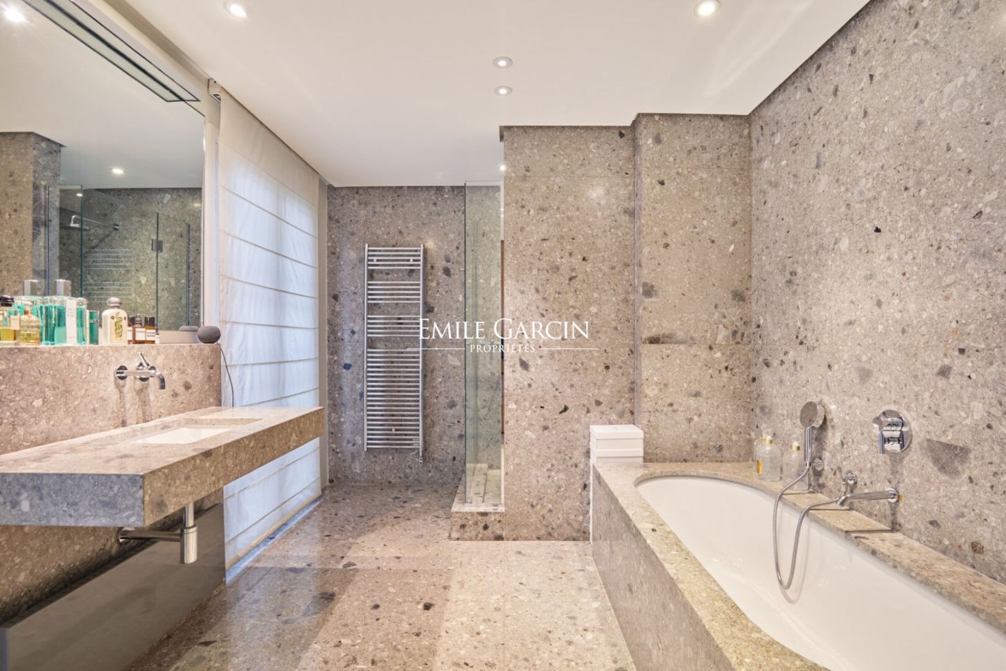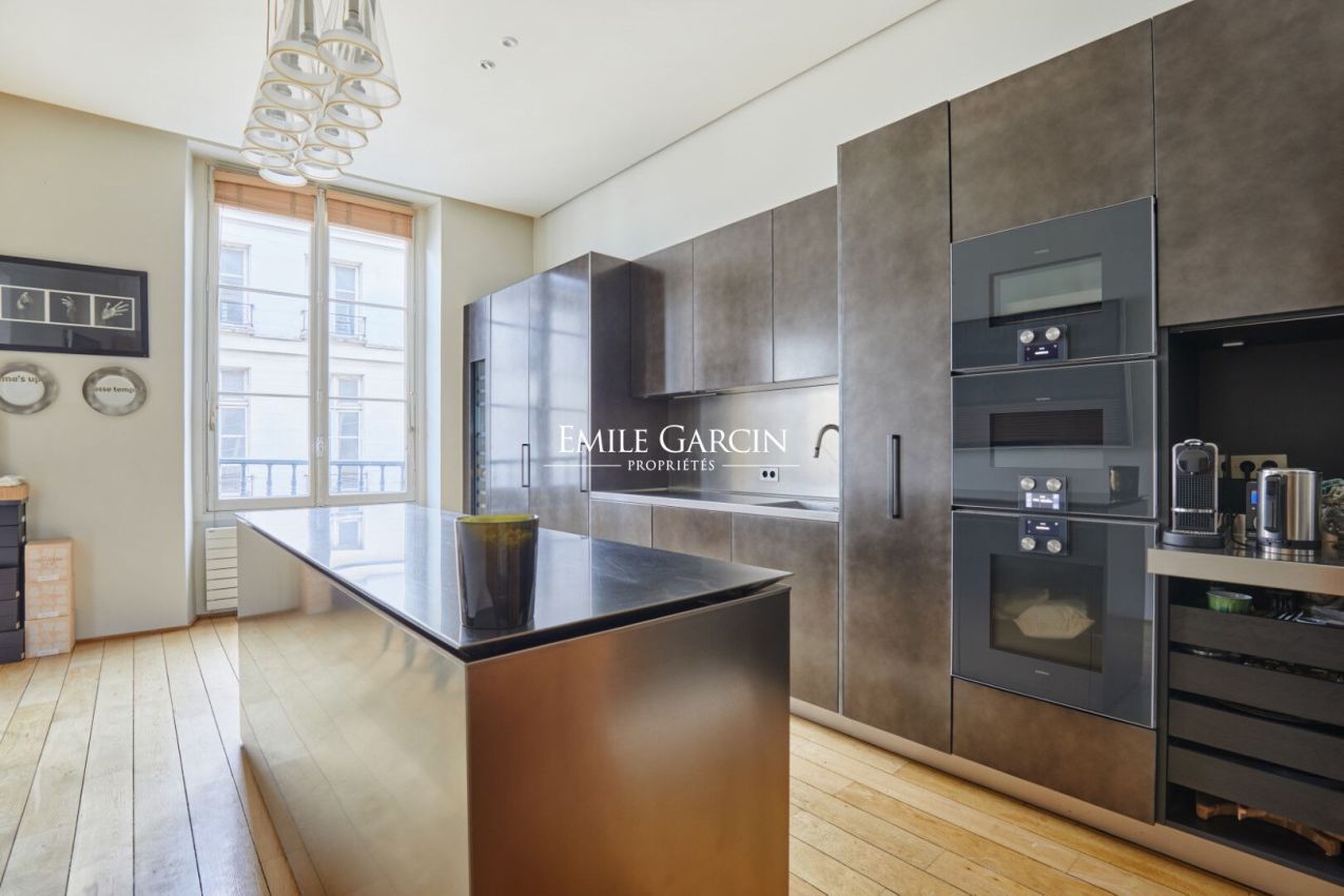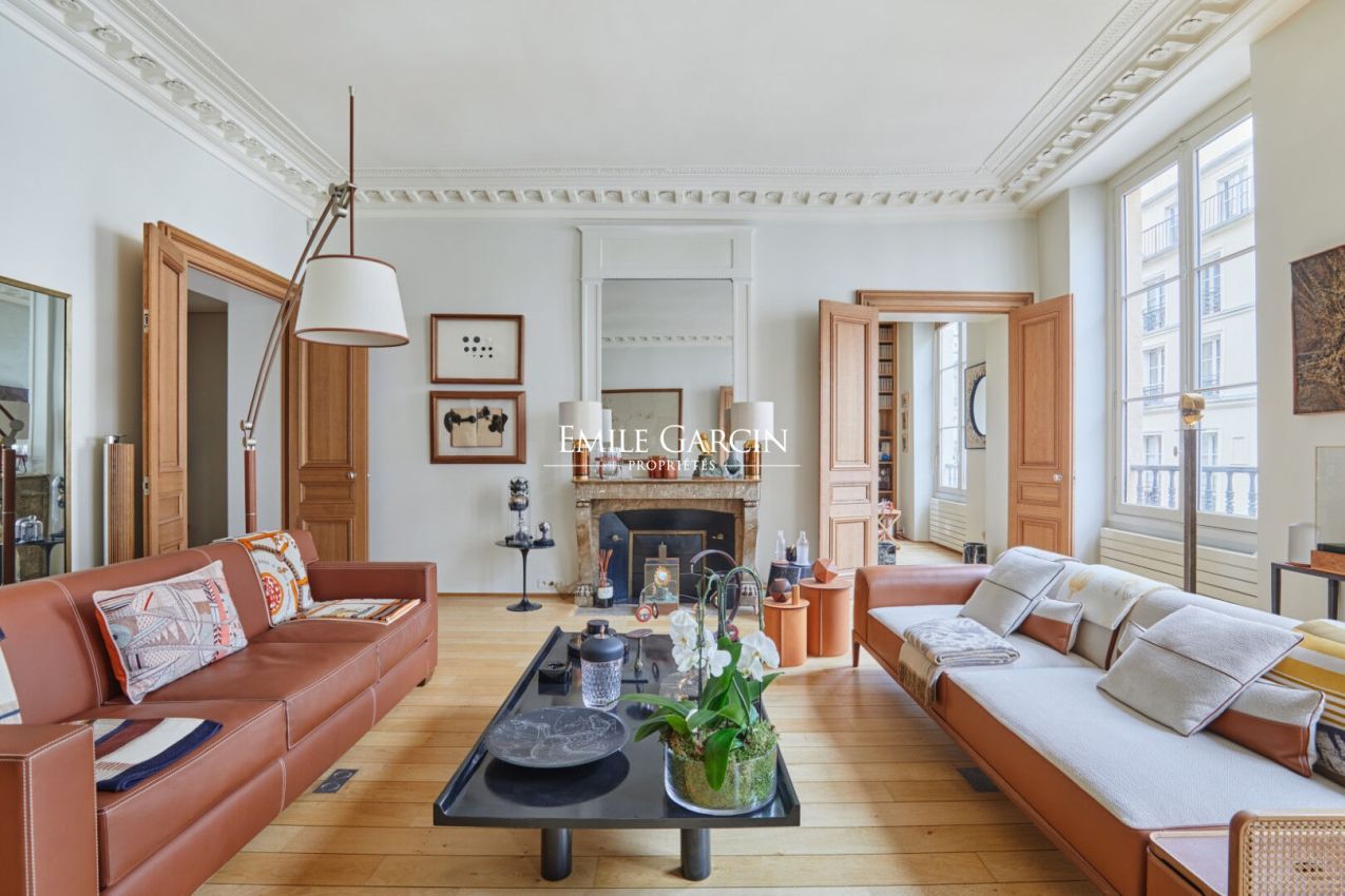 Saint Germain des Près - Dans un magnifique immeuble à la façade néoclassique ornée de statues classiques, au 2ème étage avec ascenseur, cet appartement de 206,03 m² loi Carrez et 213.86 m² au sol avec une hauteur sou plafond de 3,5 mètres, se compose d'une entrée, une double réception avec de hauts volumes, une suite principale avec dressing et salle de bains avec toilettes, une deuxième chambre avec salle d'eau et toilettes, un bureau, au centre, une cuisine Boffi équipée. Charme de l'ancien parquet, cheminées, moulures. Une double cave complète ce bel ensemble. Gardien à demeure. Parfait pied à terre au coeur de Saint Germain des Prés. Rare.