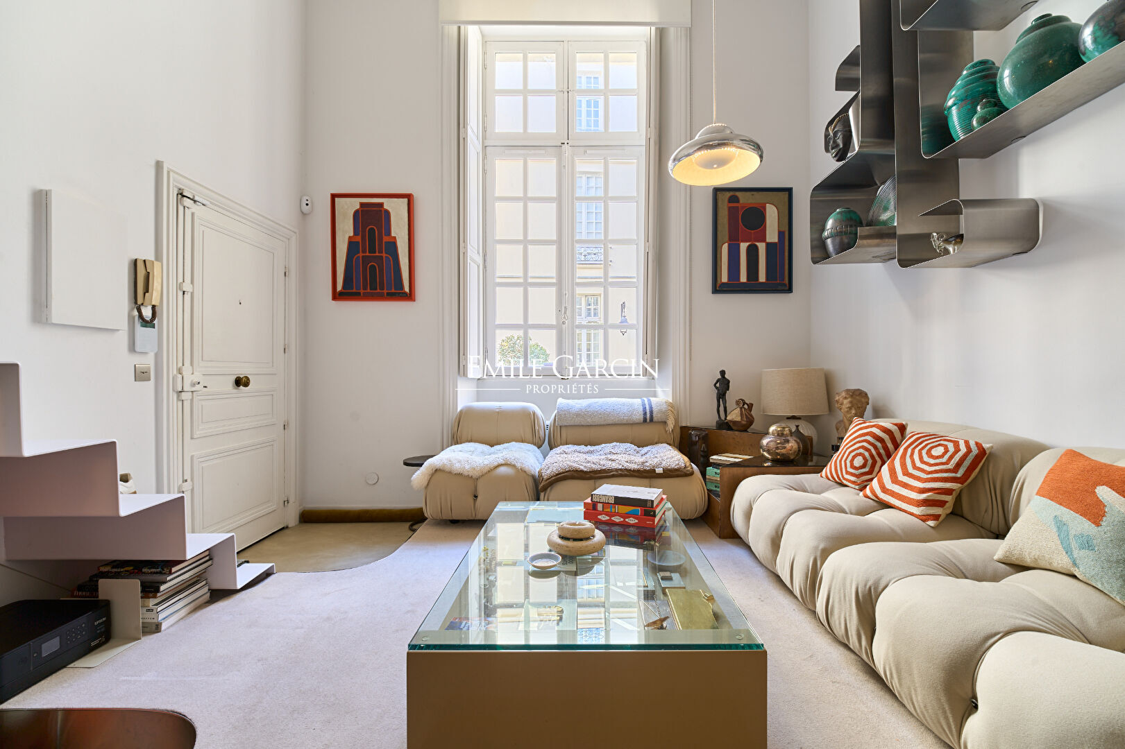 En exclusivité, dans l'élégant Hôtel particulier du XVIIIe, un appartement en parfait état de 45.39m² loi Carrez. Situé au rez-de-chaussée sur une belle cour d'honneur par un portail Louis XVI, les étages du bâtiment entièrement rénovés, cet appartement de charme, avec un intérieur dans un univers de courbes et des matériaux de qualités, il se compose d'une belle pièce de vie avec une cuisine ouverte, d'une buanderie avec des rangements, d'une chambre avec dressing à l'étage et d'une salle de bains avec des toilettes. Magnifique copropriété avec toute l'authenticité du Marais. Cet appartement rare, profite d'une belle lumière douce, orienté Sud avec une vue dégagée sur cour, au calme. L'ensemble compose un intérieur où chaque détail trouve sa place, une ambiance raffinée. Cave. Coup de coeur. Idéal pour un pied à terre.